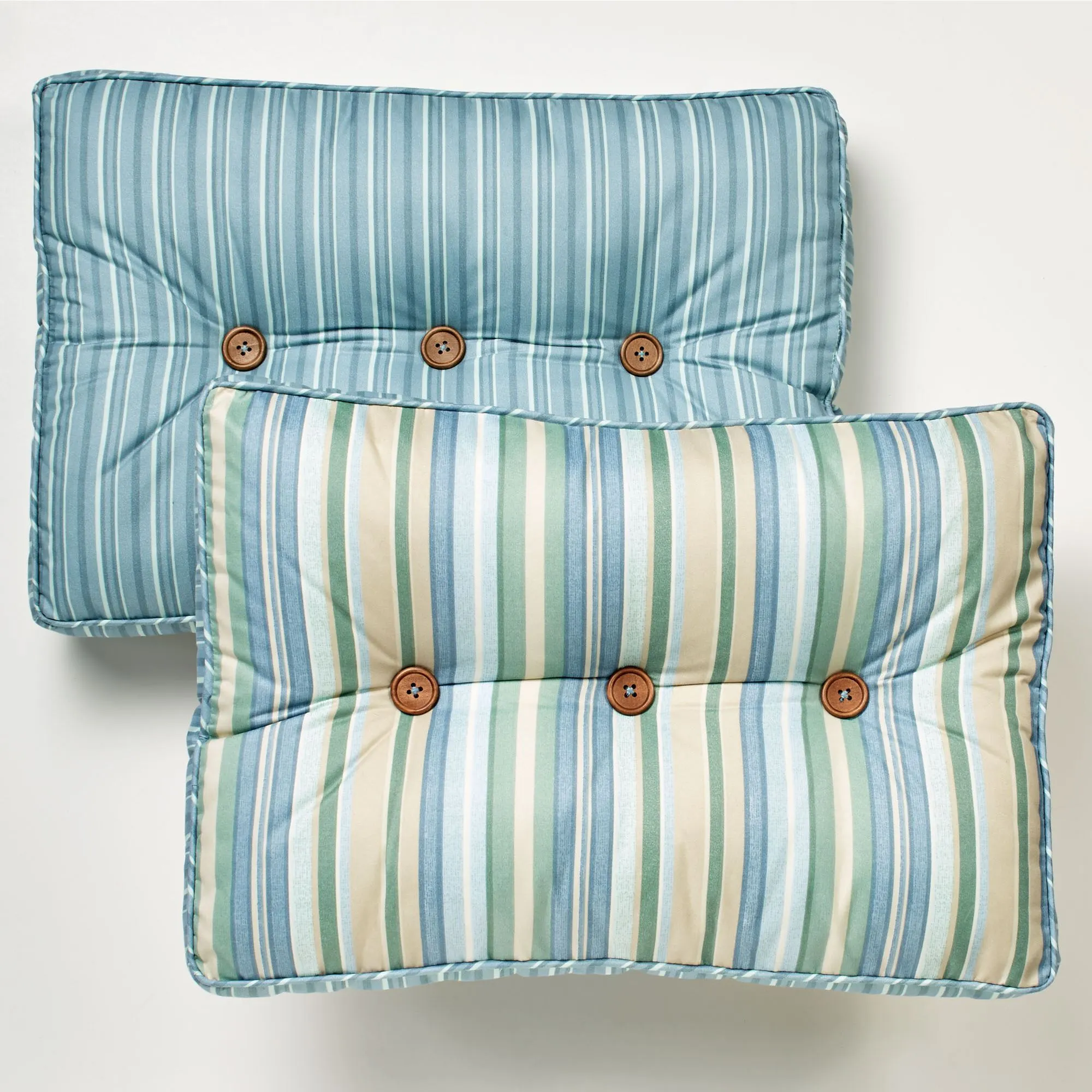 Pillows: Spot clean. The Piped Rectangle is ecru polyester with printed shells and coral and the saying "Dreaming of the Sea." Side gusset is 2". Pillow is reversible to mini stripes. The piped Tufted Rectangle has stripes, three button tufts, and 2" side gussets; pillow is reversible to mini stripes. The tailored Shaggy Square has colors of blue shadow, steel blue, and light blue; pillow is reversible to mini stripes.