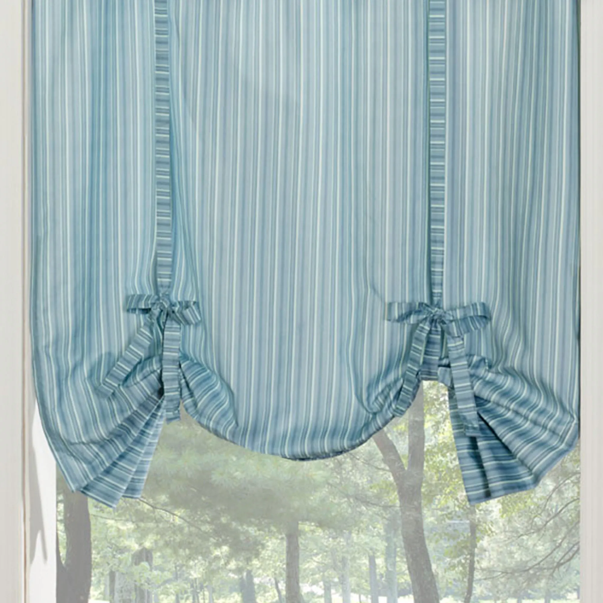 Window Treatment: The Grommet Curtains have coordinating stripes, 1.5" dia. silver-finished metal grommets, and a foam back for room darkening and energy efficiency. Curtains are available in two lengths. Tie-Up Shade has mini stripes with attached ties. Rod pocket is 3". Layered Tie Valance has coordinating stripes and mini stripes with ties. Rod pocket is 3". The lined Layered Ascot Valance has coordinating stripes on the top and mini blue stripes on the bottom. Rod pocket is 3". Grommet Patio Panel has stripes, 1.5" dia. silver metal grommets, and an acrylic foam back for room darkening and energy efficiency; available in two lengths.