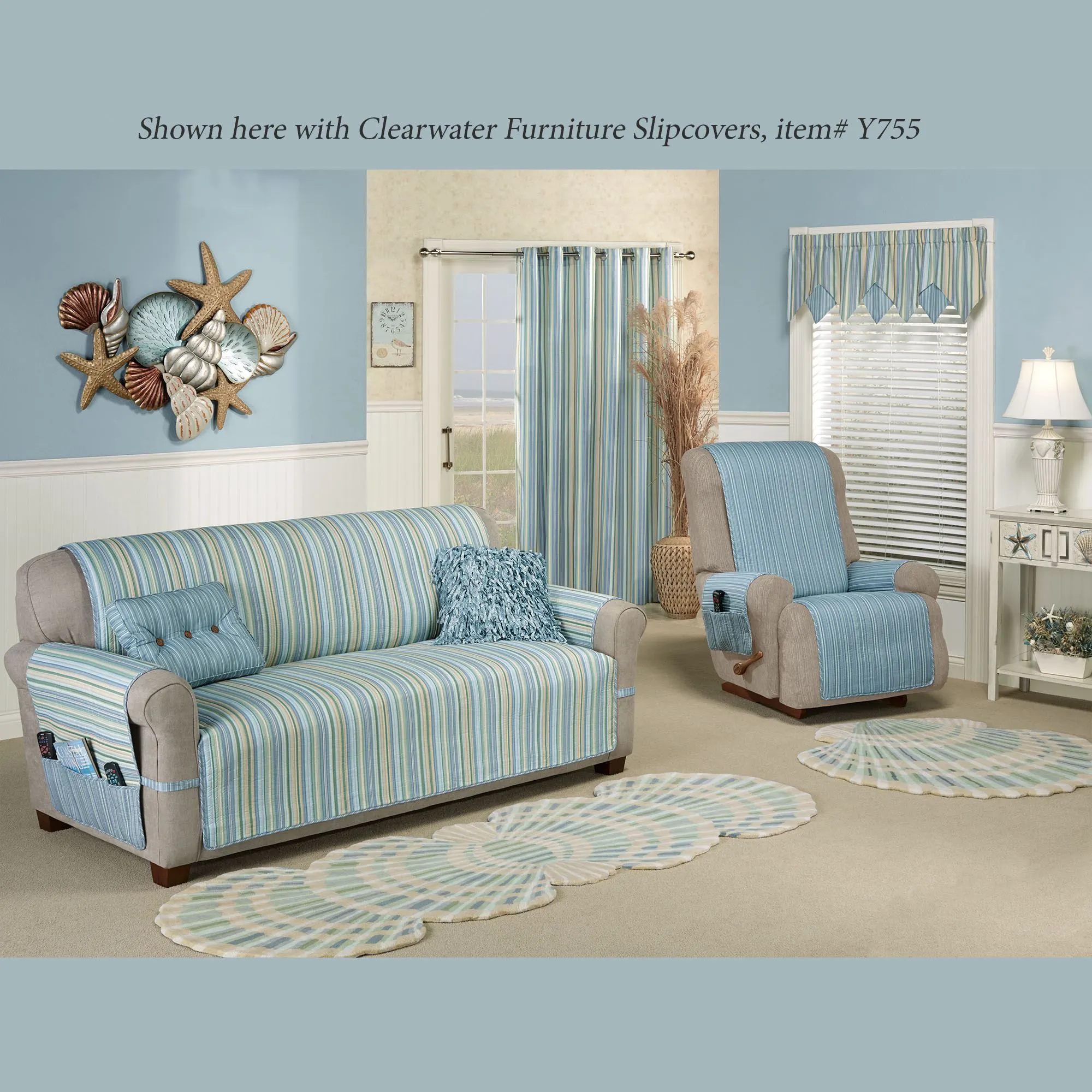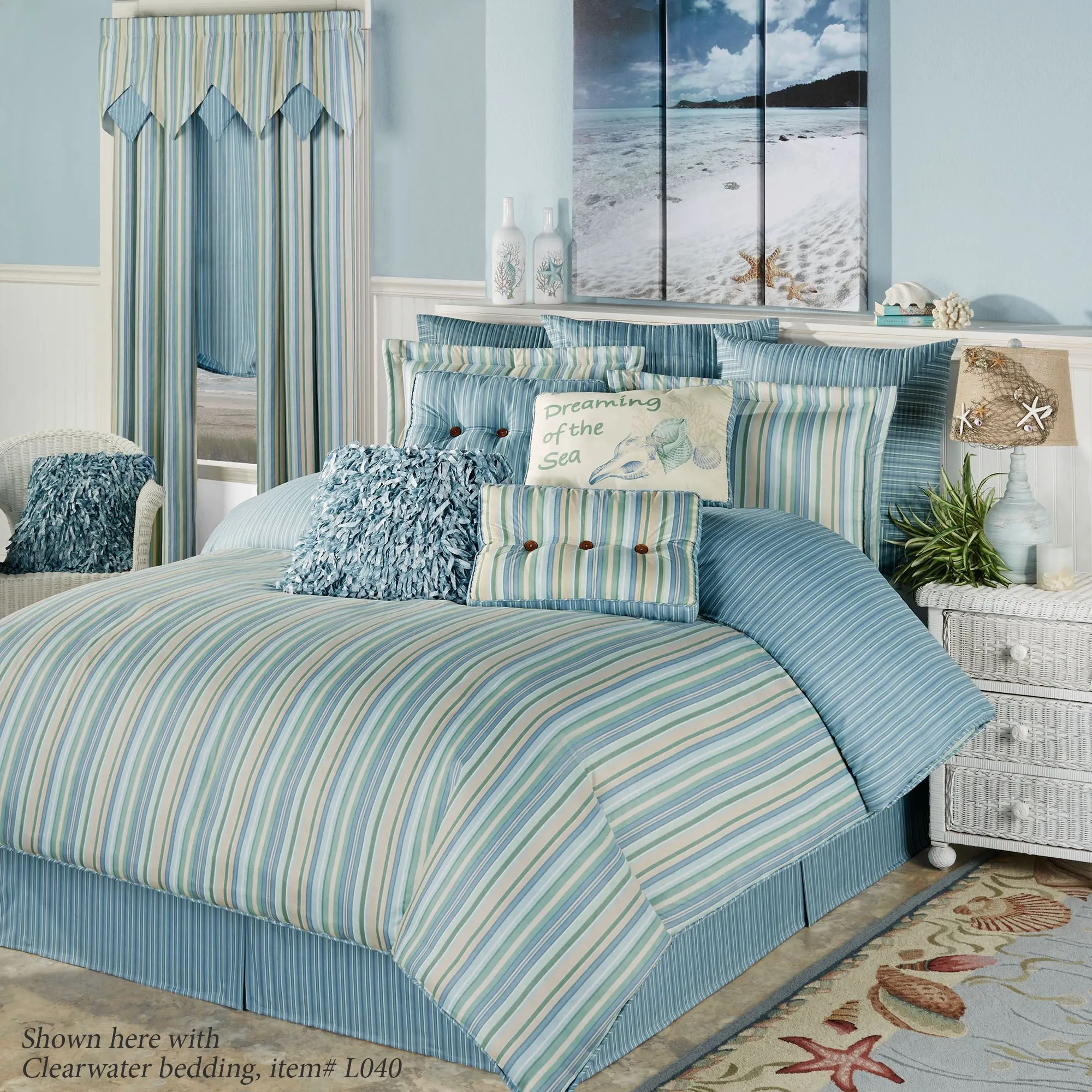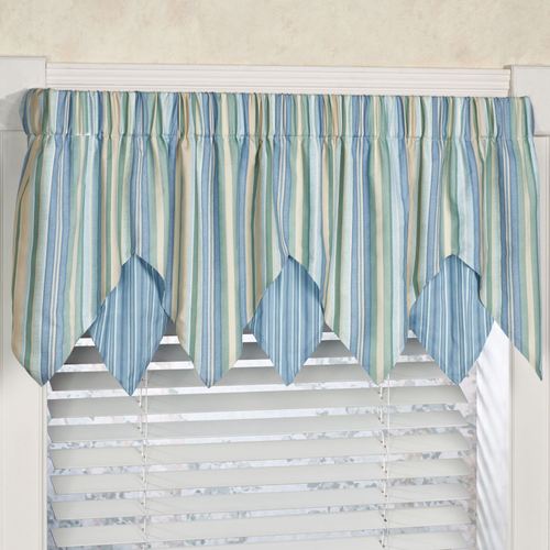 The soothing stripe designs on the Clearwater Coastal Window Treatment will have you thinking of blue skies and sandy beaches. This brushed polyester microfiber window treatment features classic coastal colors. The main stripe pattern is in vanilla, ivory, spring green, glacier, jade, blue shadow, and light blue; the mini stripe design is in blue shadow, steel blue, and light blue. Specify Layered Ascot Valance or Grommet Curtain Pair. The lined Layered Ascot Valance has stripes on the top and mini blue stripes on the bottom. Rod pocket is 3". Grommet Curtains have stripes, 1.5" dia. silver-finished metal grommets, and a foam back for room darkening and energy efficiency. Washable. Imported. The curtain pair width is the total width of two panels together.
