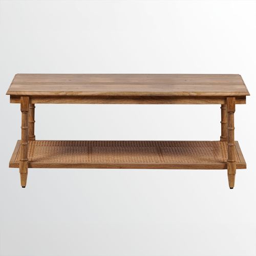 The Clifton Cane Coffee Table is made of mango wood with a cane shelf.