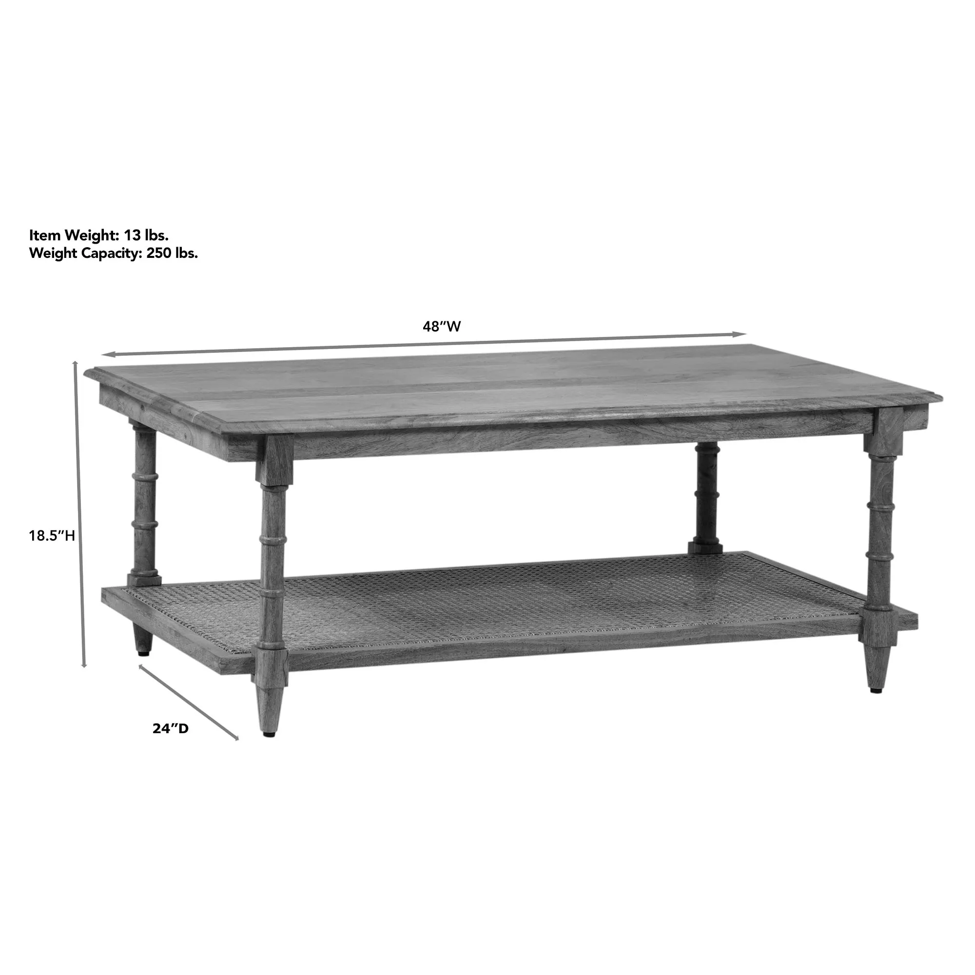 Great style is easy to achieve when decorating with the Clifton Cane Coffee Table. Hand-finished in whitewash, this rustic, handcrafted mango wood coffee table features an intricate cane lower shelf and turned legs. The maximum recommended weight is 250 lbs. Measures 48"Wx24"Dx18.5"H; weighs 13 lbs.