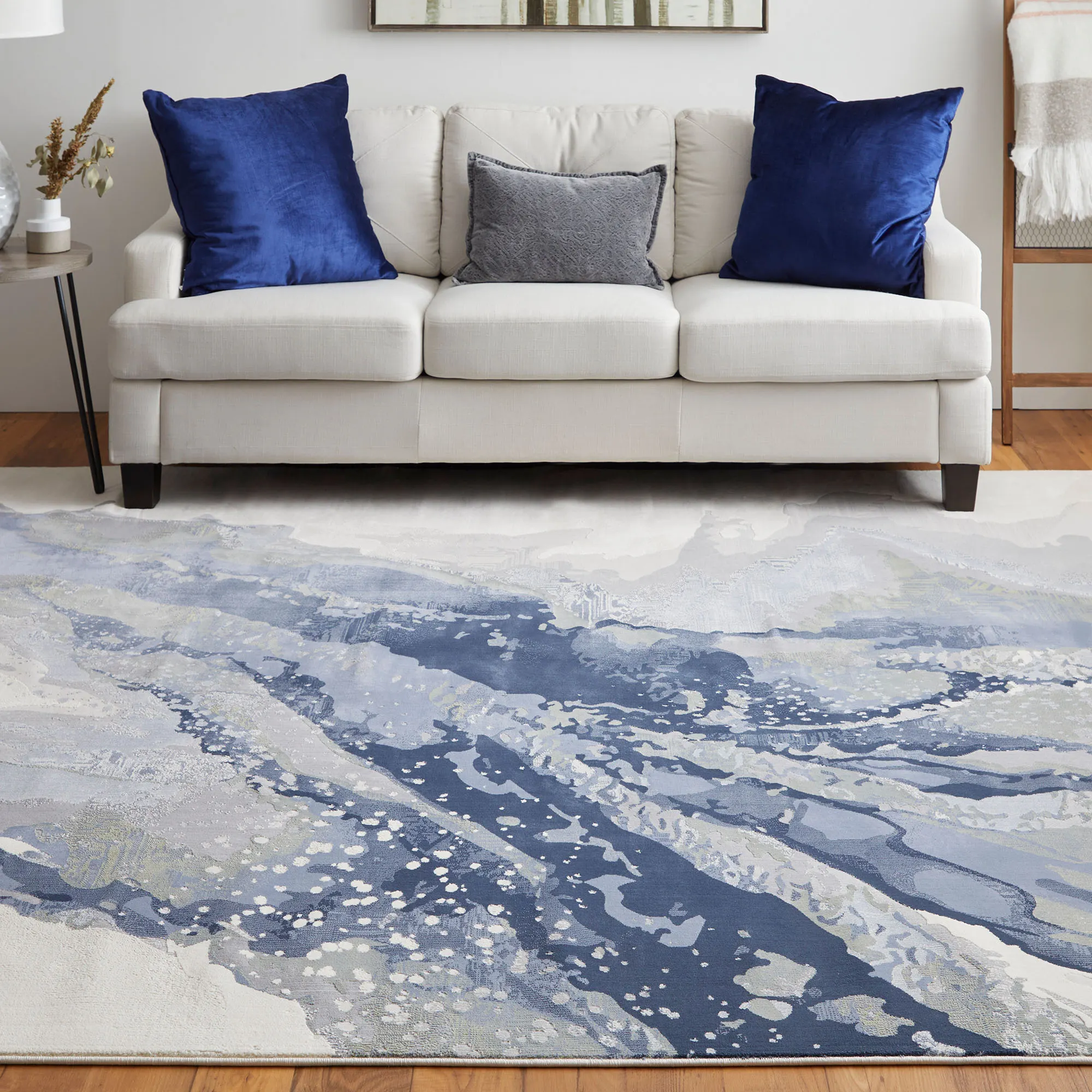 The Clio Blue Abstract Area Rug invites a soothing splash of color to your space. Meticulously crafted to mimic the look and feel of a hand-knotted rug, the .39" thick, power-loomed polypropylene/polyester rug features an abstract colorful flow that stretches across the design. The blue coloration contains hues of blue, navy, gray, and light gray. We recommend professional cleaning by a rug cleaner. Imported.