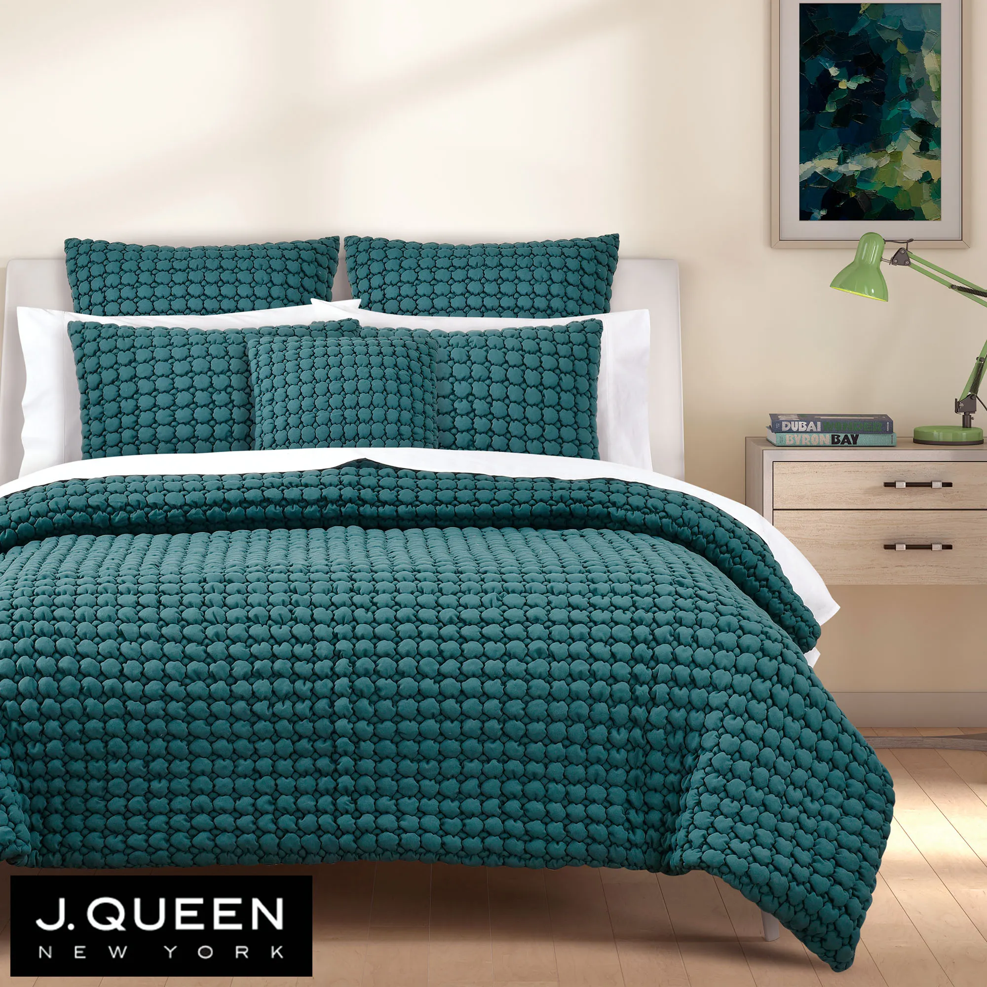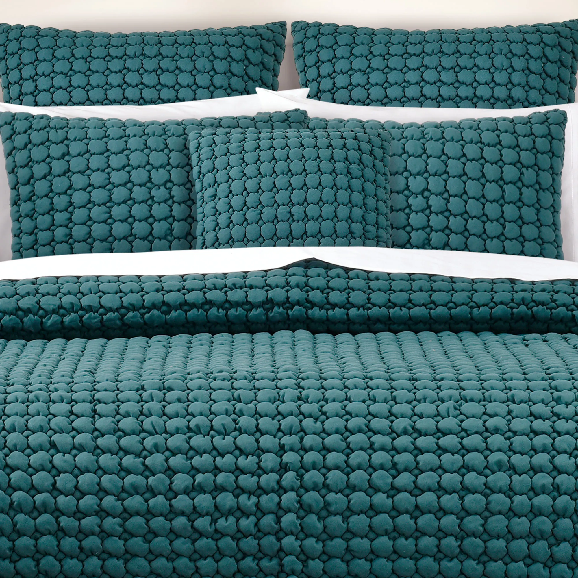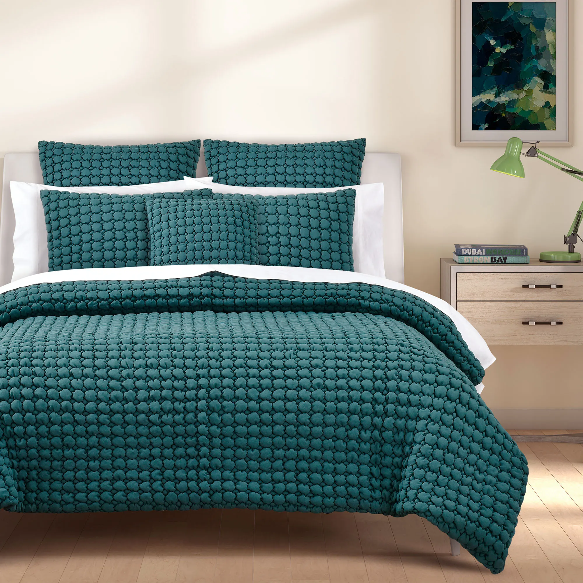 • Solid teal bedding has a quilted puff texture