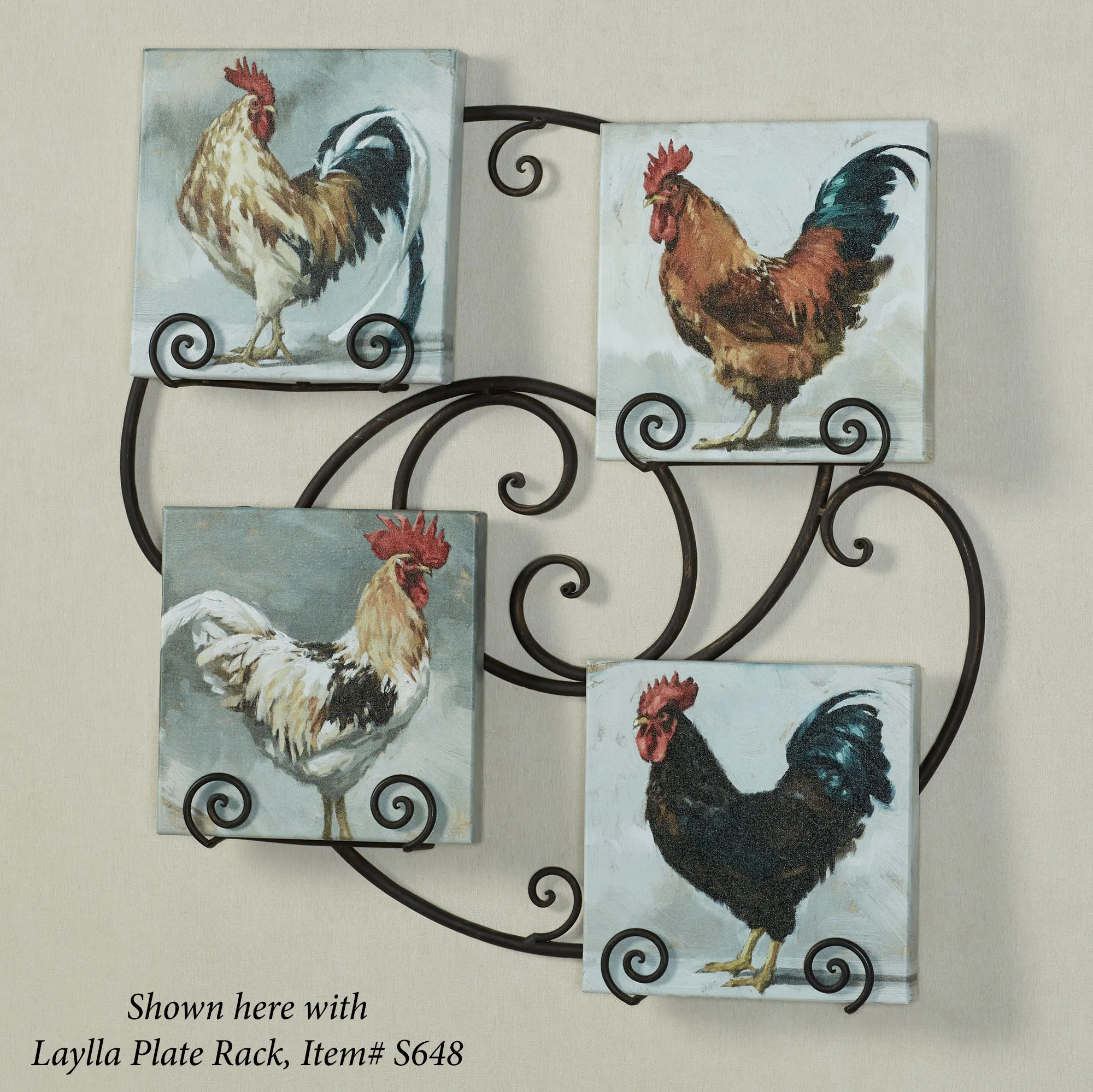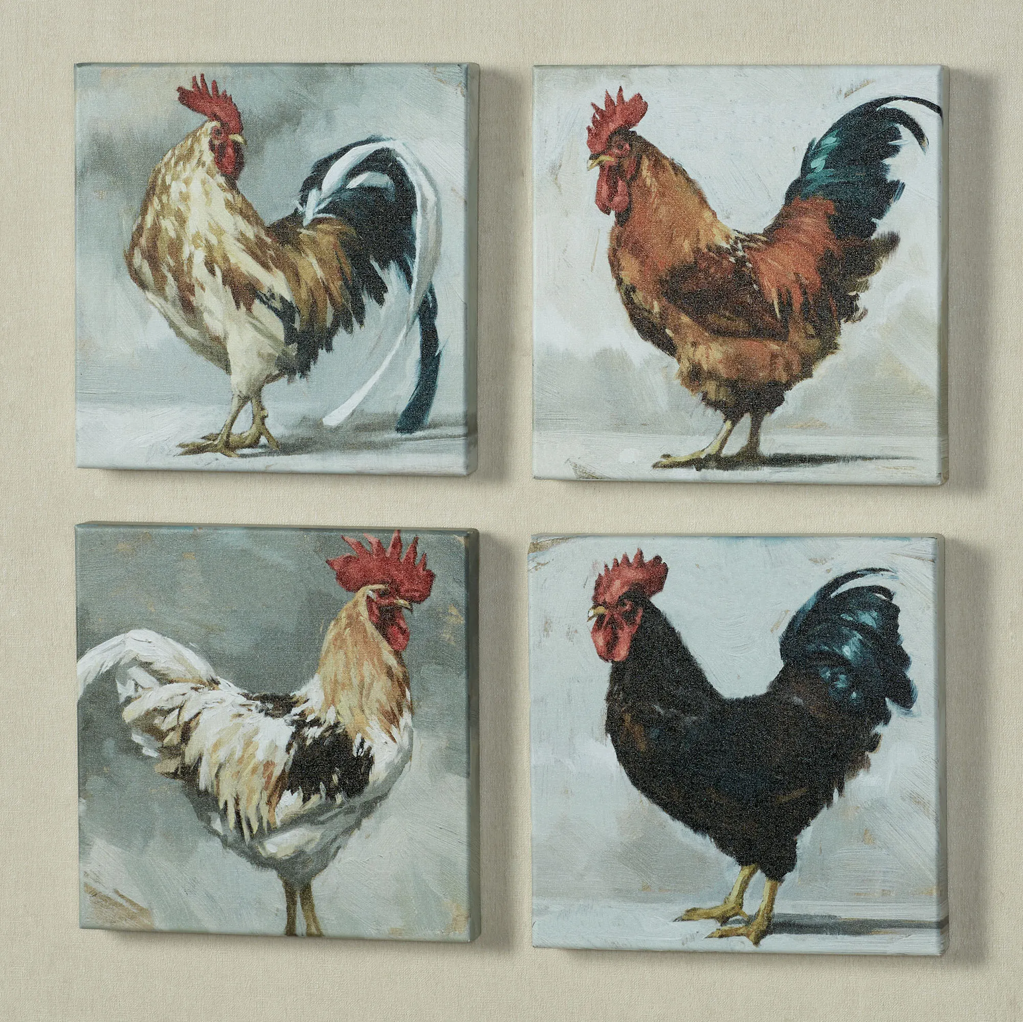 • Each features a rooster on a multicolor background