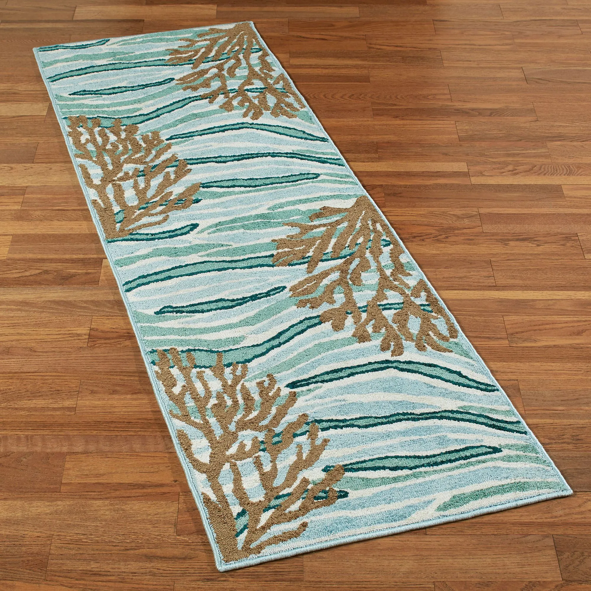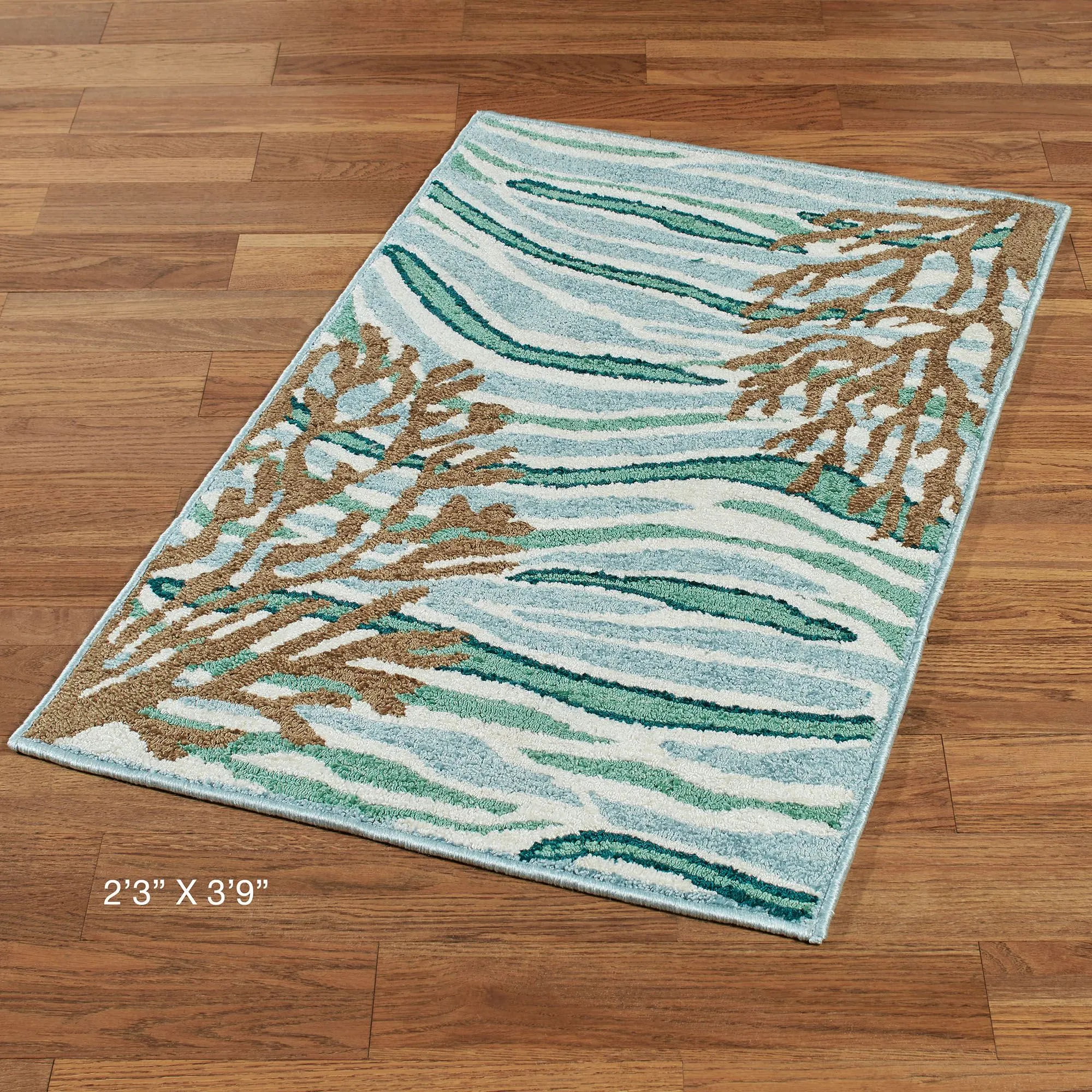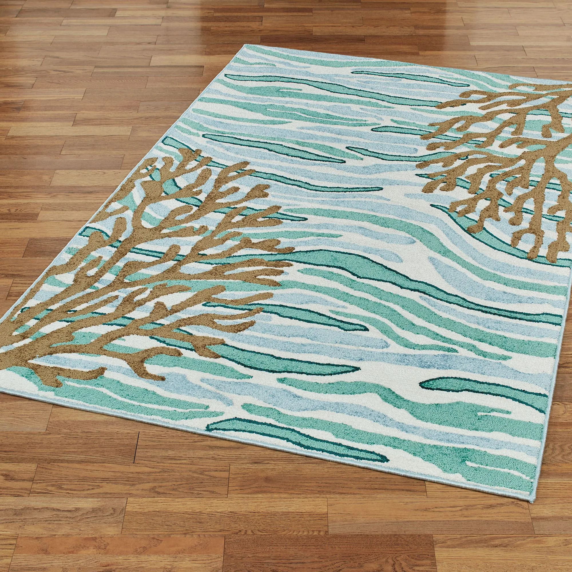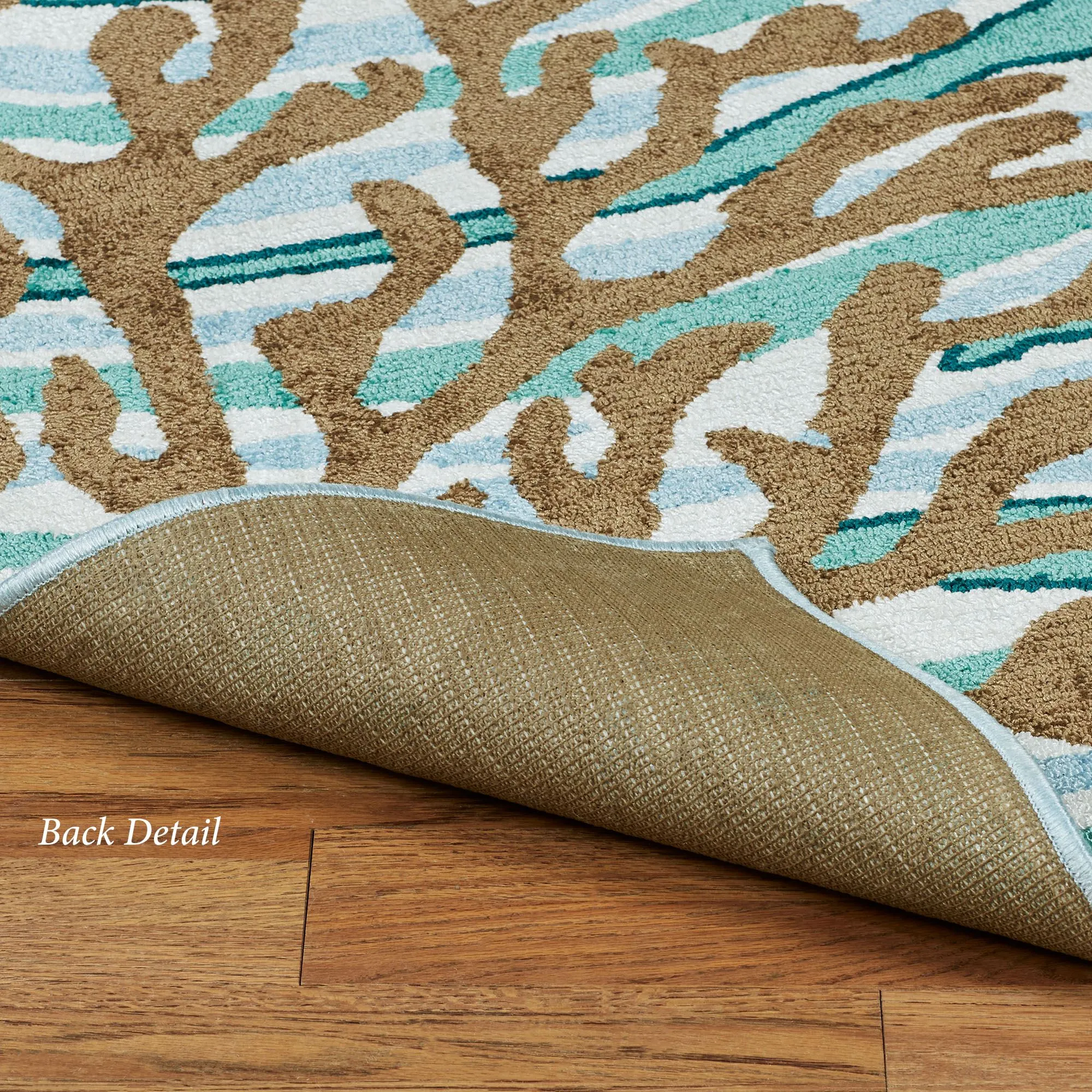 The Coastal Charm Area Rug adds seafaring soul to your space. Hand-hooked from polyester, the .5" thick rug features rippling undersea currents and coral in shades of sky blue, turquoise, dark teal, light brown, and off-white. Backing is nonskid. We recommend professional cleaning by a rug cleaner. Imported.
