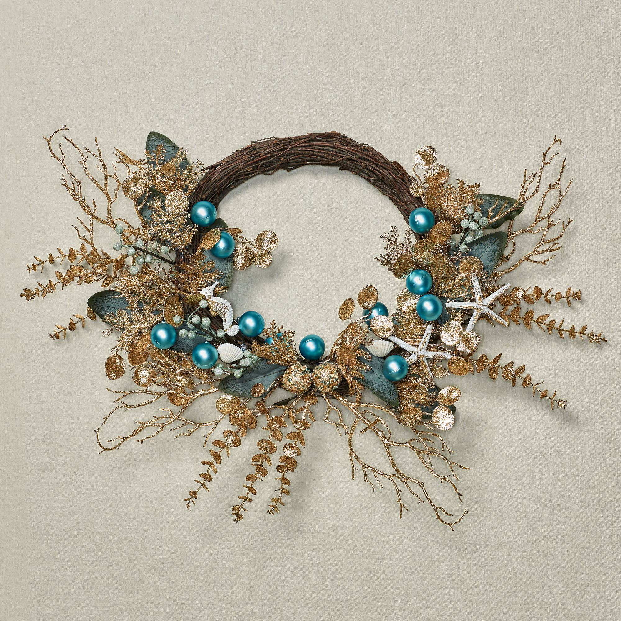Celebrate a Coastal Christmas with the addition of this charming wreath. On a natural grapevine base, the polyester faux greenery design features dark green leaves, seashells, a seahorse, a starfish, berries, gold glittered leafy branches, gold glittered coral-like branches, and aqua blue ornaments that resemble bright bubbles. Handle with care; glitter fall may occur. This item will need to be fluffed upon arrival. Indoor use only. Coastal Christmas wreath measures approx. 21"Wx4"Dx16"H.