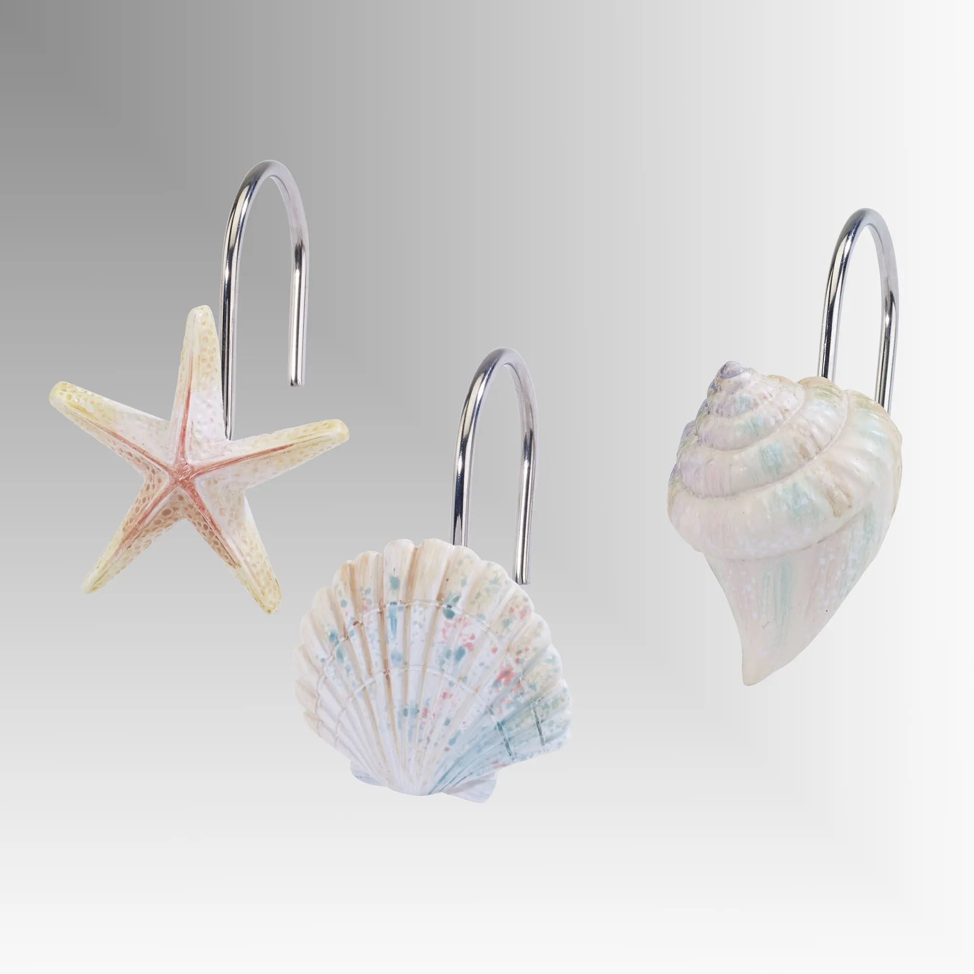 Immerse your bath beneath the sea with the Coastal Terrazzo Shower Accessories. In a classic seaside style, the printed Shower Curtain features coral, starfish, seahorses, seashells, and waves in pastel shades of mint, aqua, teal, mauve, beige, yellow, and gray; all on a woven ivory polyester ground. Hand-attached beads add an undersea shimmer. We recommend the use of a waterproof liner, not included. Shower curtain measures 72"Wx72"L; machine washable; imported. Shower Hooks are sold separately in a 12-piece set. Handcrafted resin shower hooks resemble handpainted starfish, scallop shells, and conches with metal hooks; each is 1.5"Wx2"Dx1.5"H.