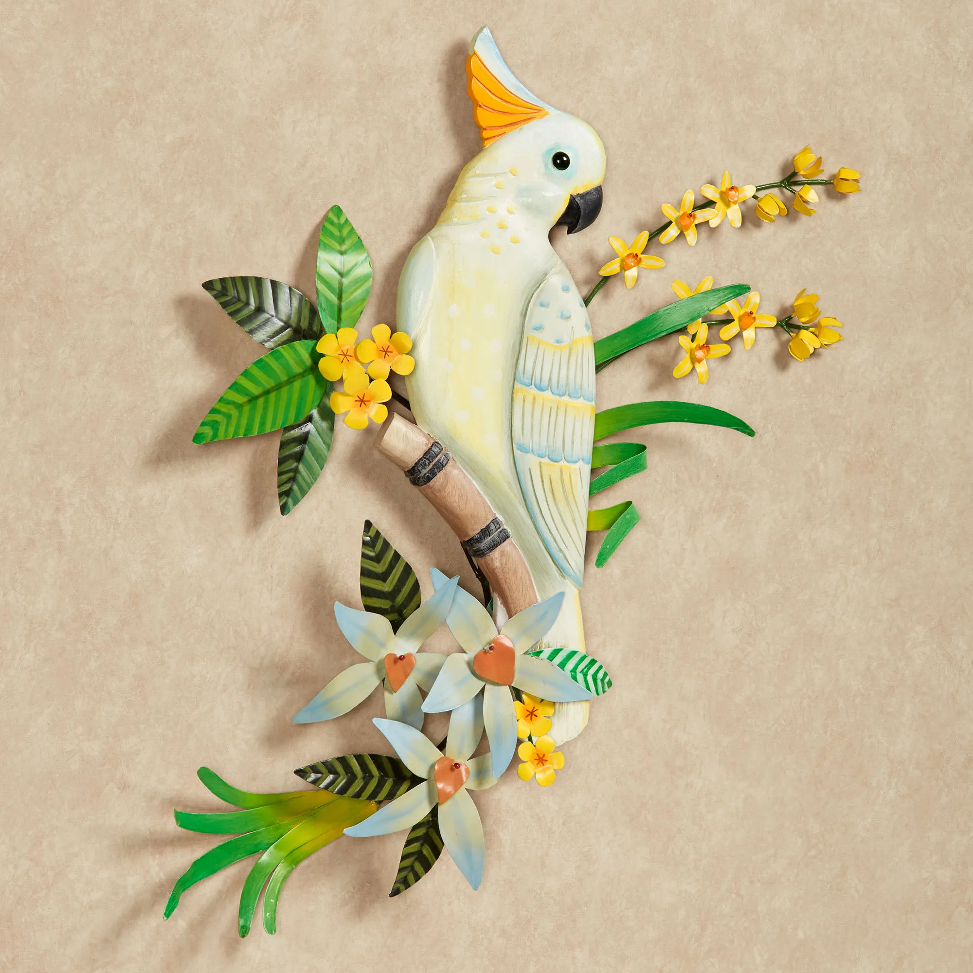 Cockatoo in Blossoms Indoor/Outdoor Wall Art is made from wood and metal.