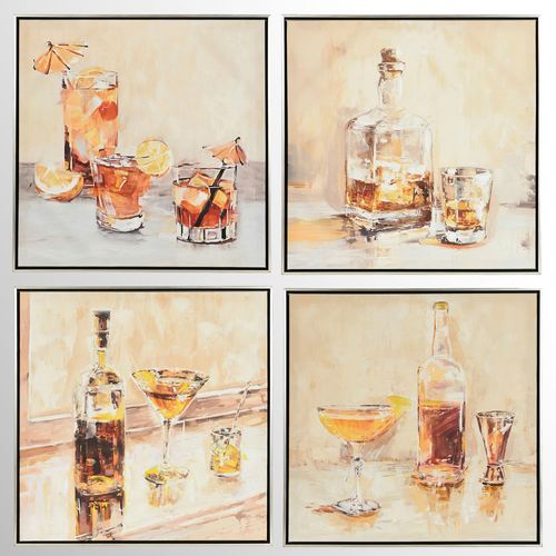 Have a drink and enjoy Cocktail Hour with friends. This canvas wall art has handpainted embellishments and features a different beverage choice on each. Canvas is wrapped around wood and surrounded by a polystyrene frame. Wall art is sold individually. Cocktail Hour I features three glasses garnished with oranges and mini umbrellas. Cocktail Hour II displays a bottle with brown bourbon and a shot glass. Cocktail Hour III features a martini. Cocktail Hour IV has the makings for a margarita. Each is 25"sq.x2"D.