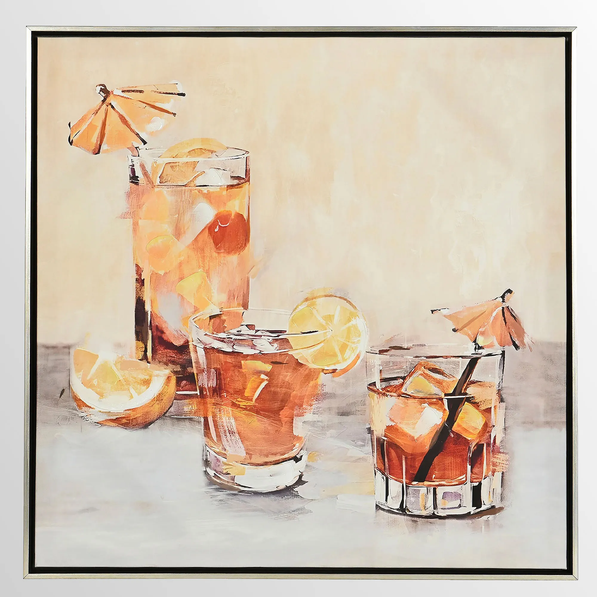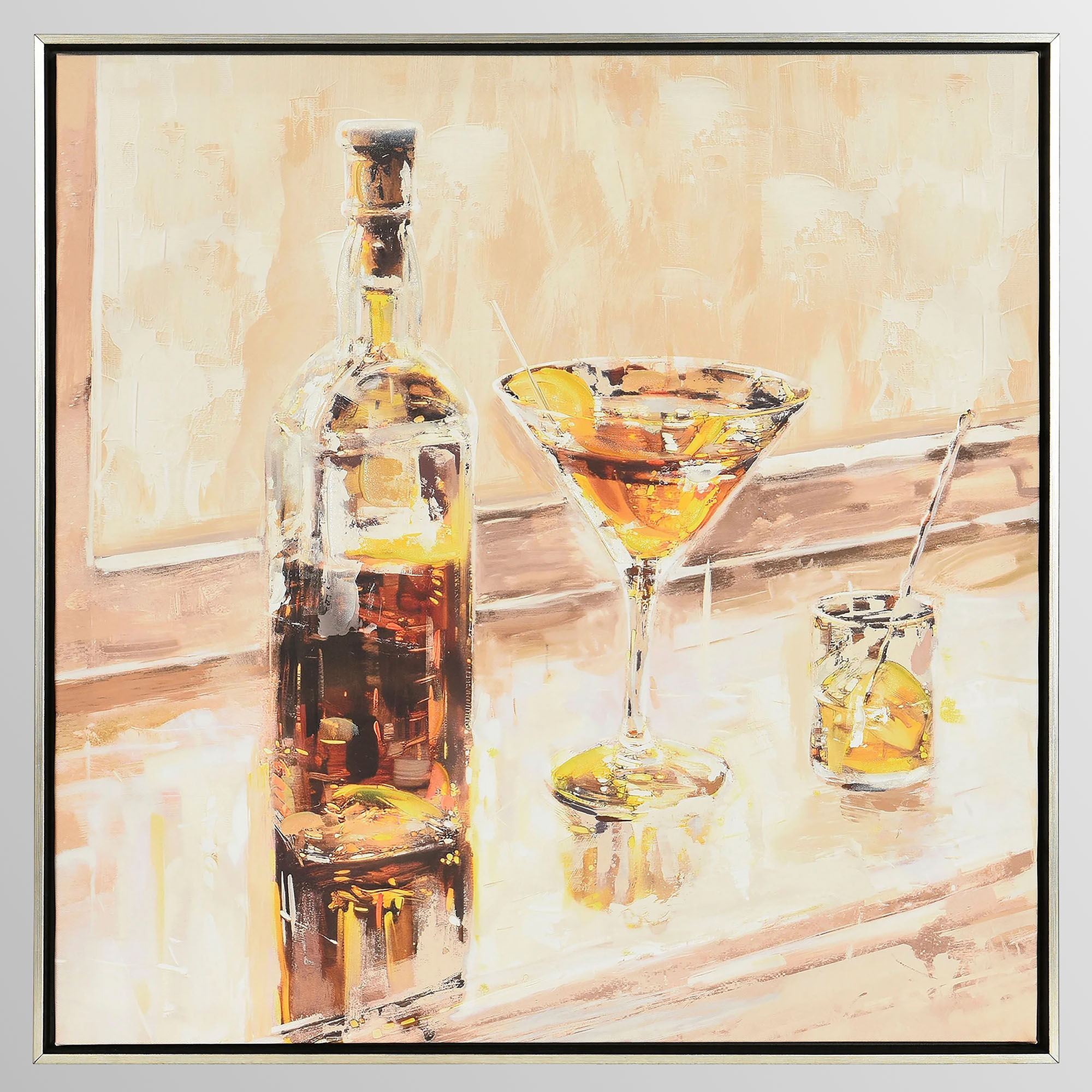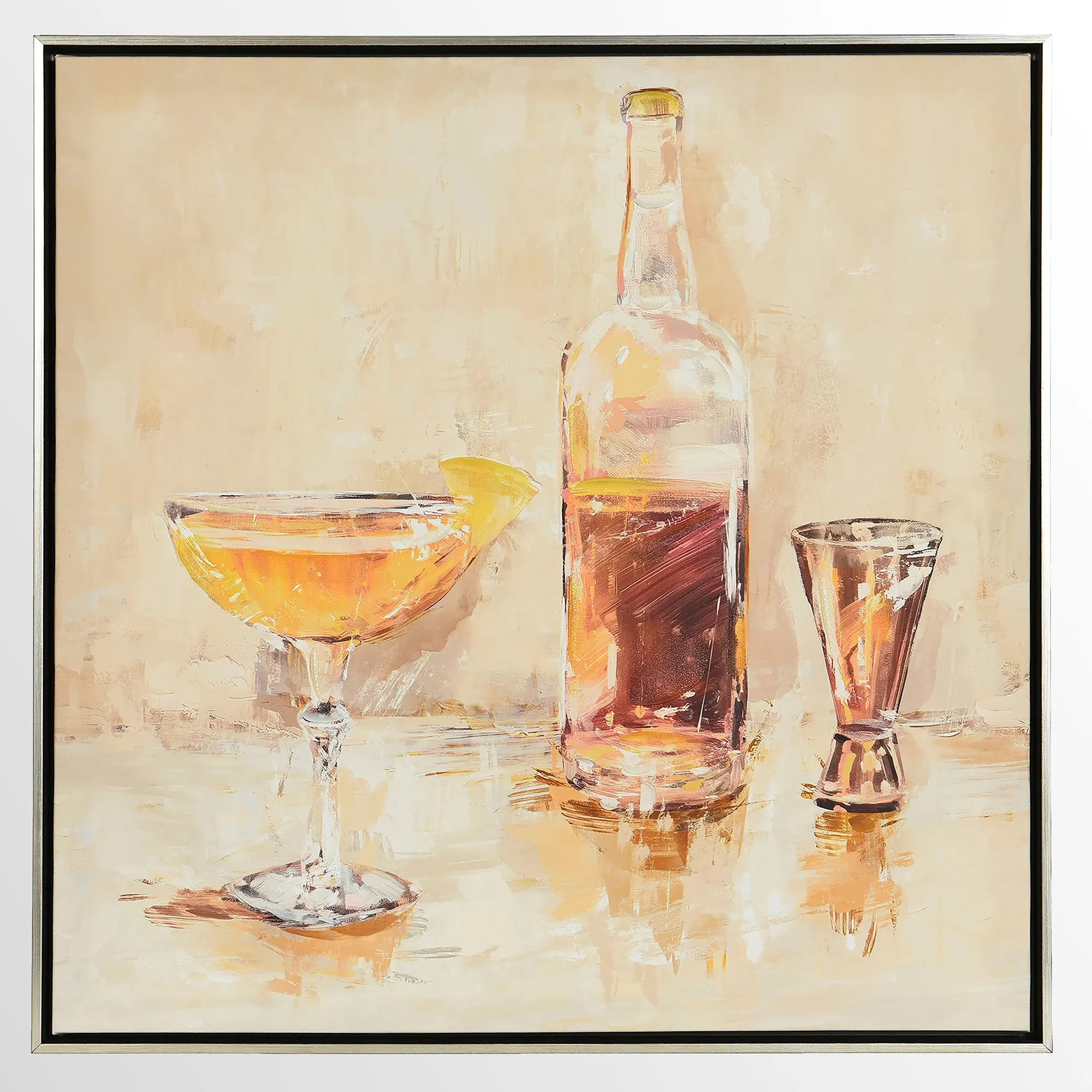The Cocktail Hour Framed Wall Art is a canvas wrapped around wood and surrounded by a polystyrene frame.
