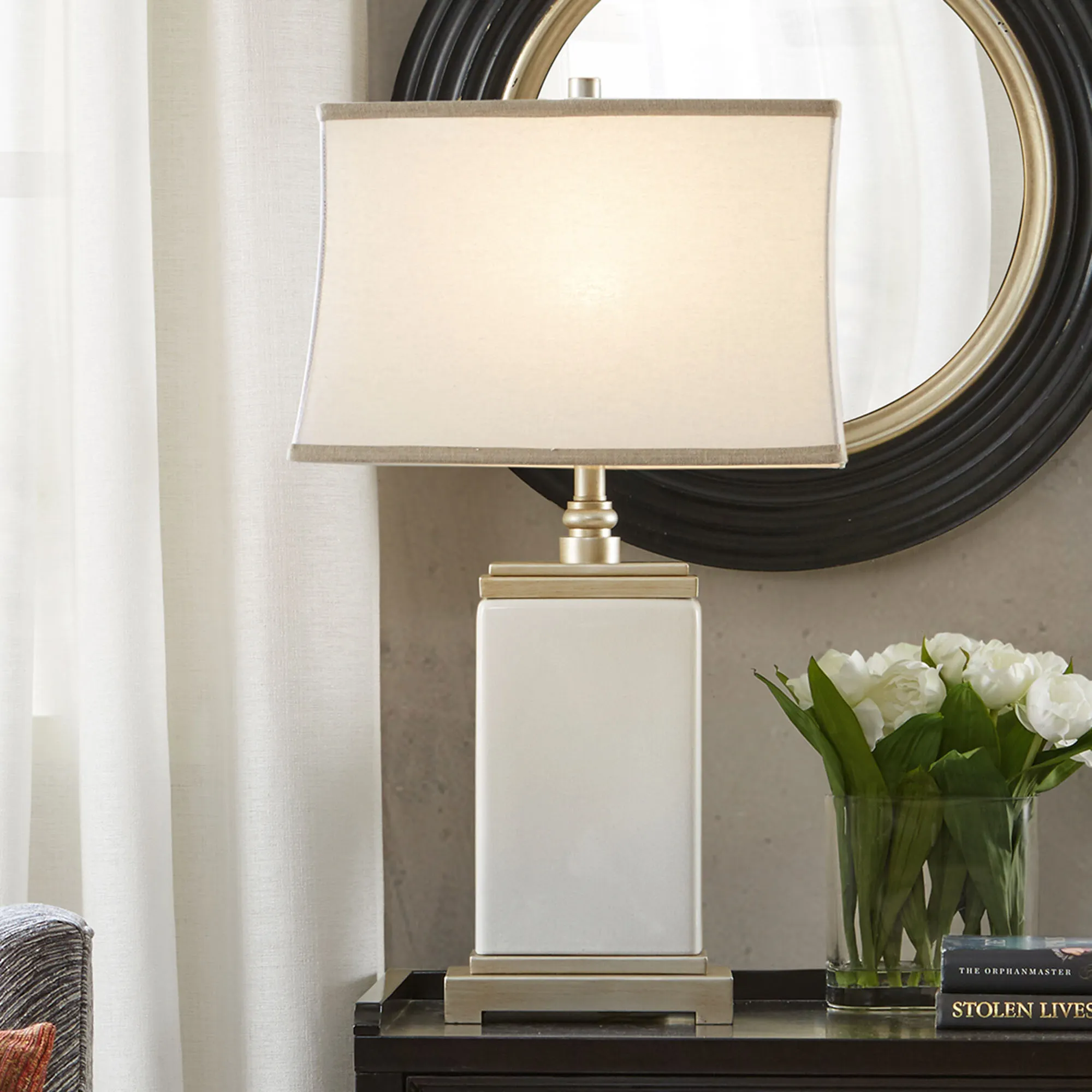 The Colette Table Lamp embellishes a space with sleek, simplistic style. Filled with chic rectangle shapes, the lamp features an antique silver metal footed base, ivory ceramic center, and stepped metal topper. The off-white cotton rectangular shade has gray trim for an embellished, clean look. UL listed. Requires one 60W max. bulb. Overall, the table lamp measures 17"Wx11"Dx29.5"H, including the matching resin cylinder finial.