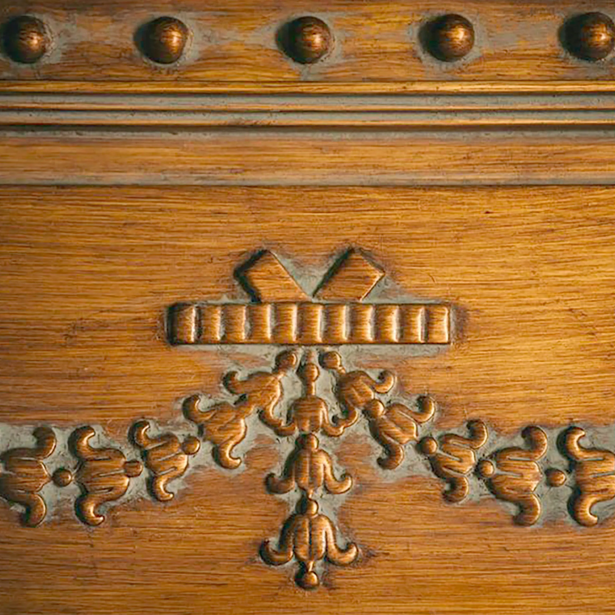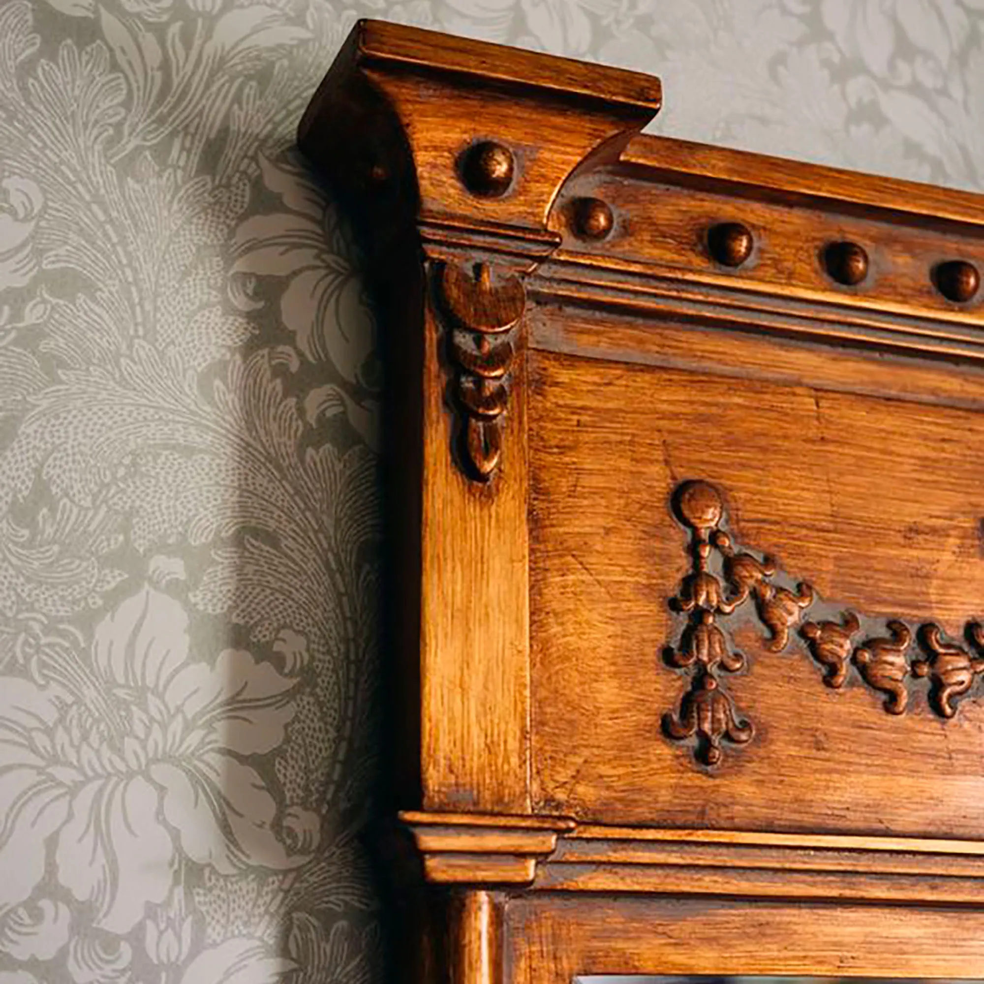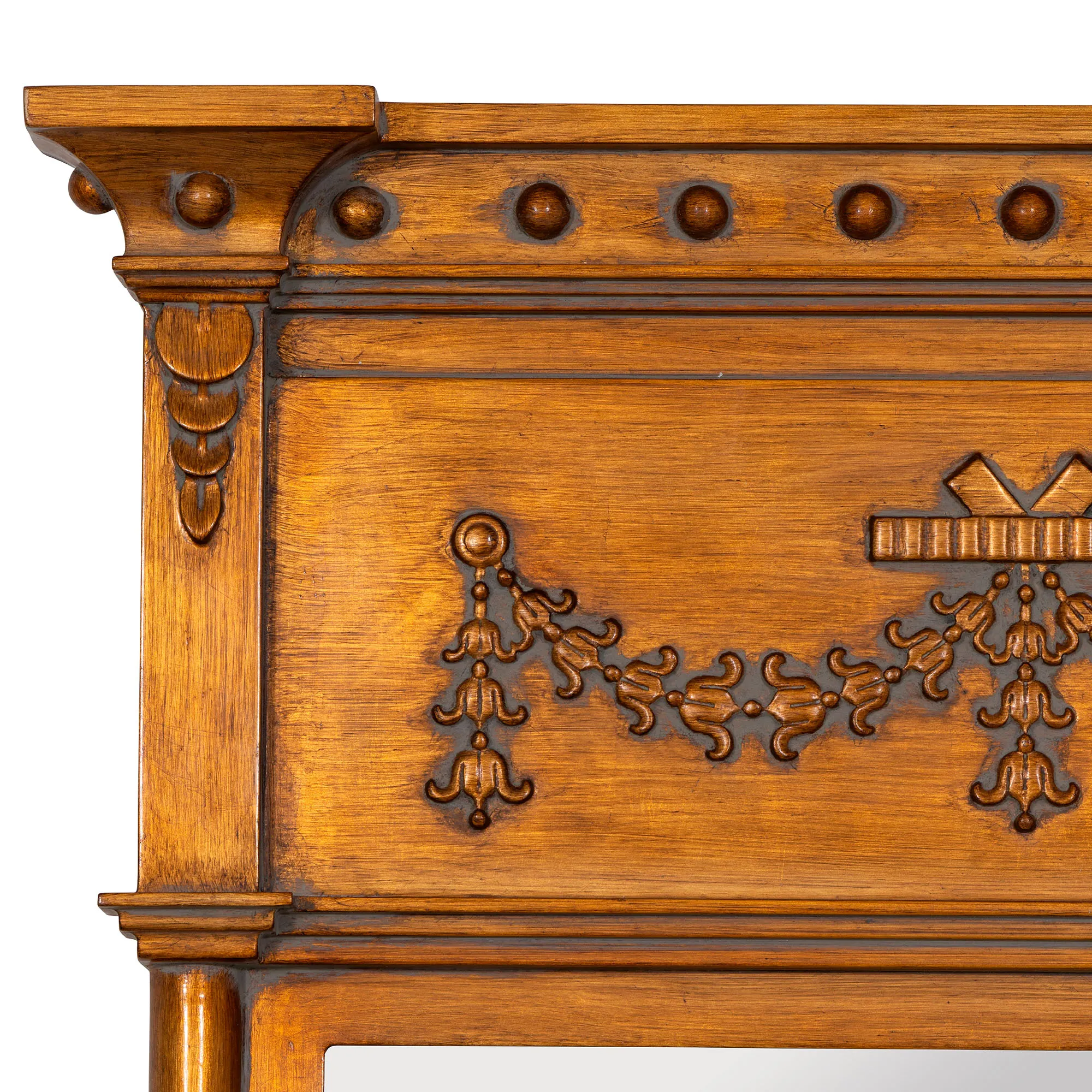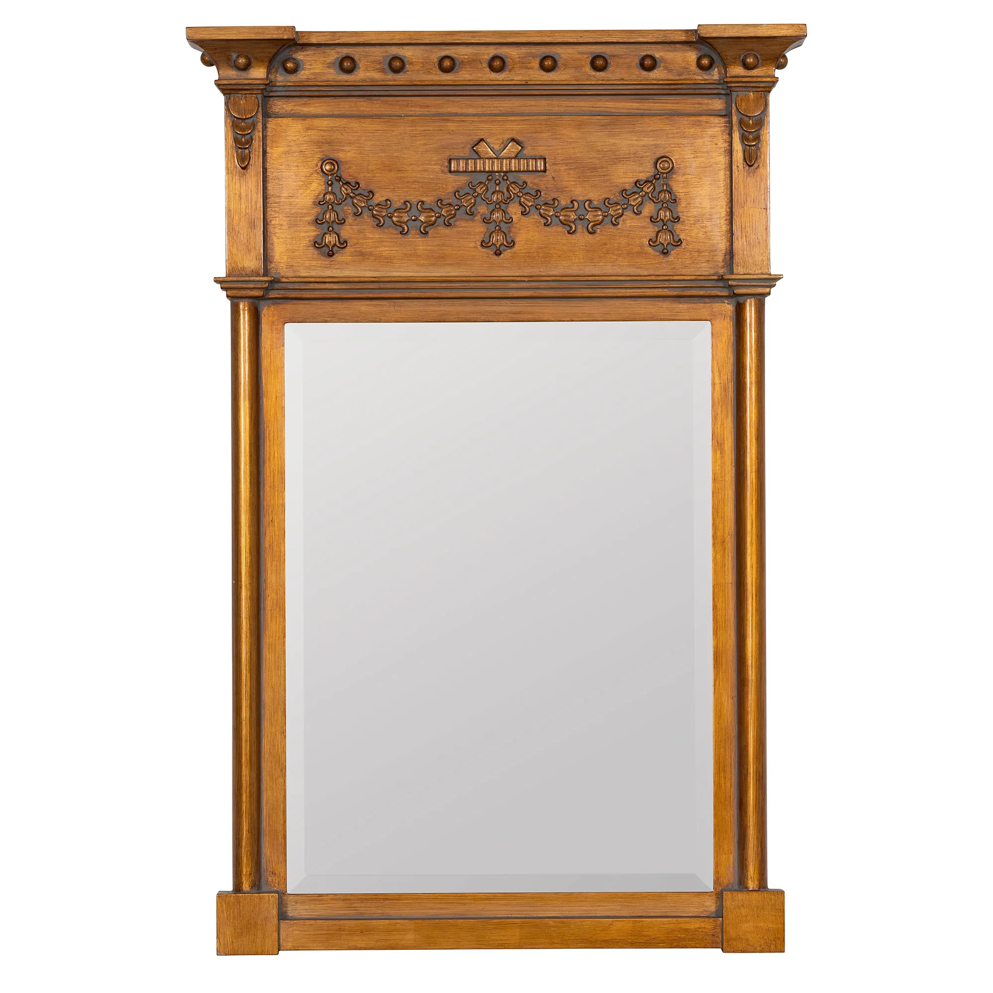 Make a statement with the Colonial Wall Mirror. This polyurethane wall mirror has a burnished gold finish, an antiqued applique design on the top, bead detailing, and a central, beveled glass mirror. Measures 28"Wx3.5"Dx42"H; weighs 30 lbs.