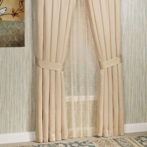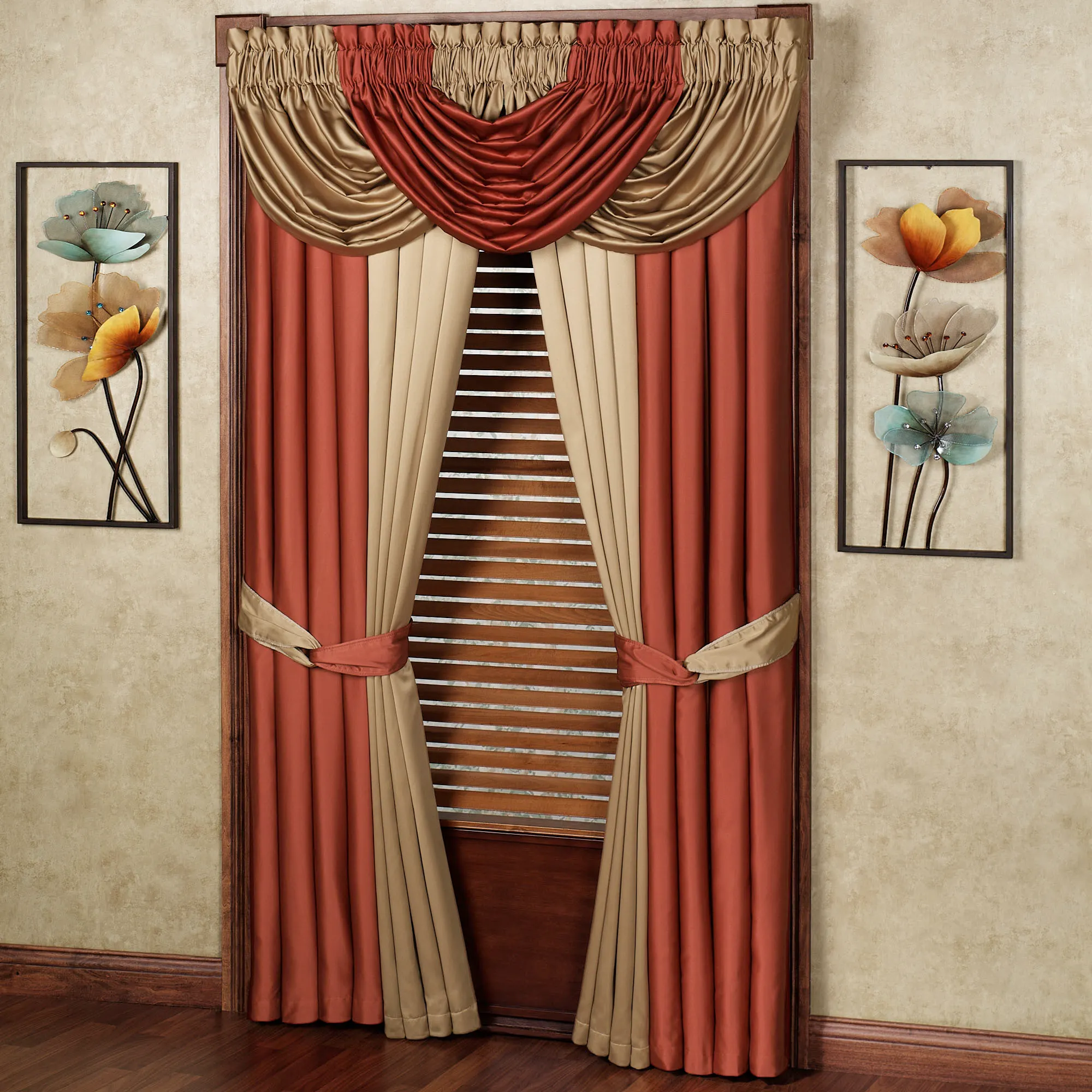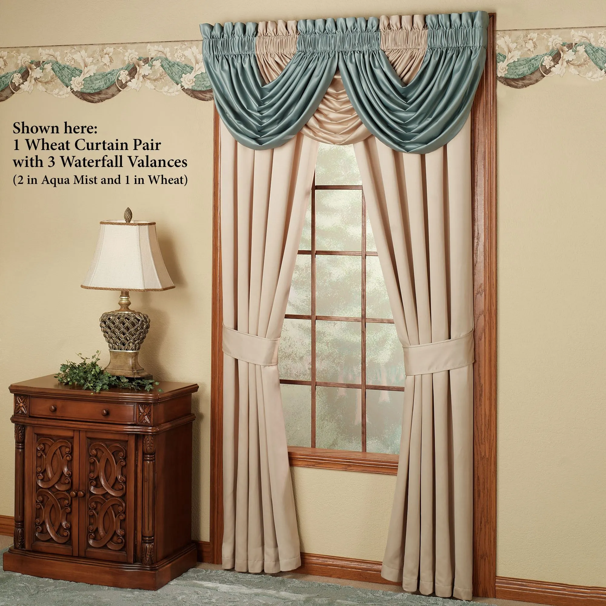Window Treatment has 3" rod pockets. Tailored, lined Curtains are solid color; tiebacks included. Ascot Valance may be layered. Waterfall Valance is threaded through rod pockets on top and bottom to create cascading effect (three shown in More Views). We recommend using one for each 12"-15" of window.
