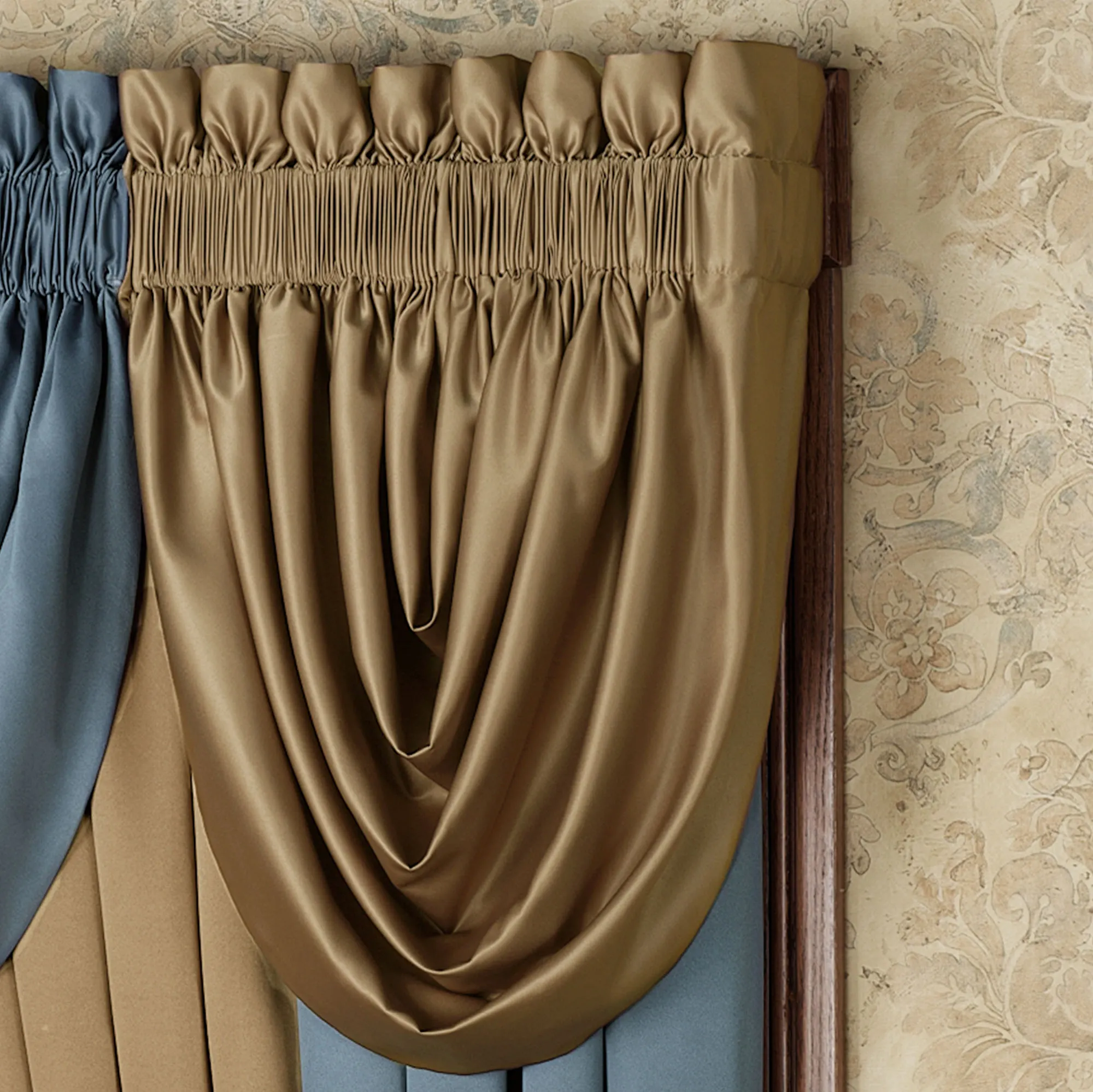 Use the Color Classics(R) Waterfall Valances to create a cascading effect on your window. Lustrous polyester fabric gives this window treatment sumptuous appeal. Curtains are solid color and include tiebacks. 3" rod pockets. Shown in main image: 2 Golden Bronze Waterfall Valances interlaced with 1 Cinnabar Waterfall Valance & 2 Curtain Pairs. Washable. Imported. The curtain pair width is the total width of two panels together.