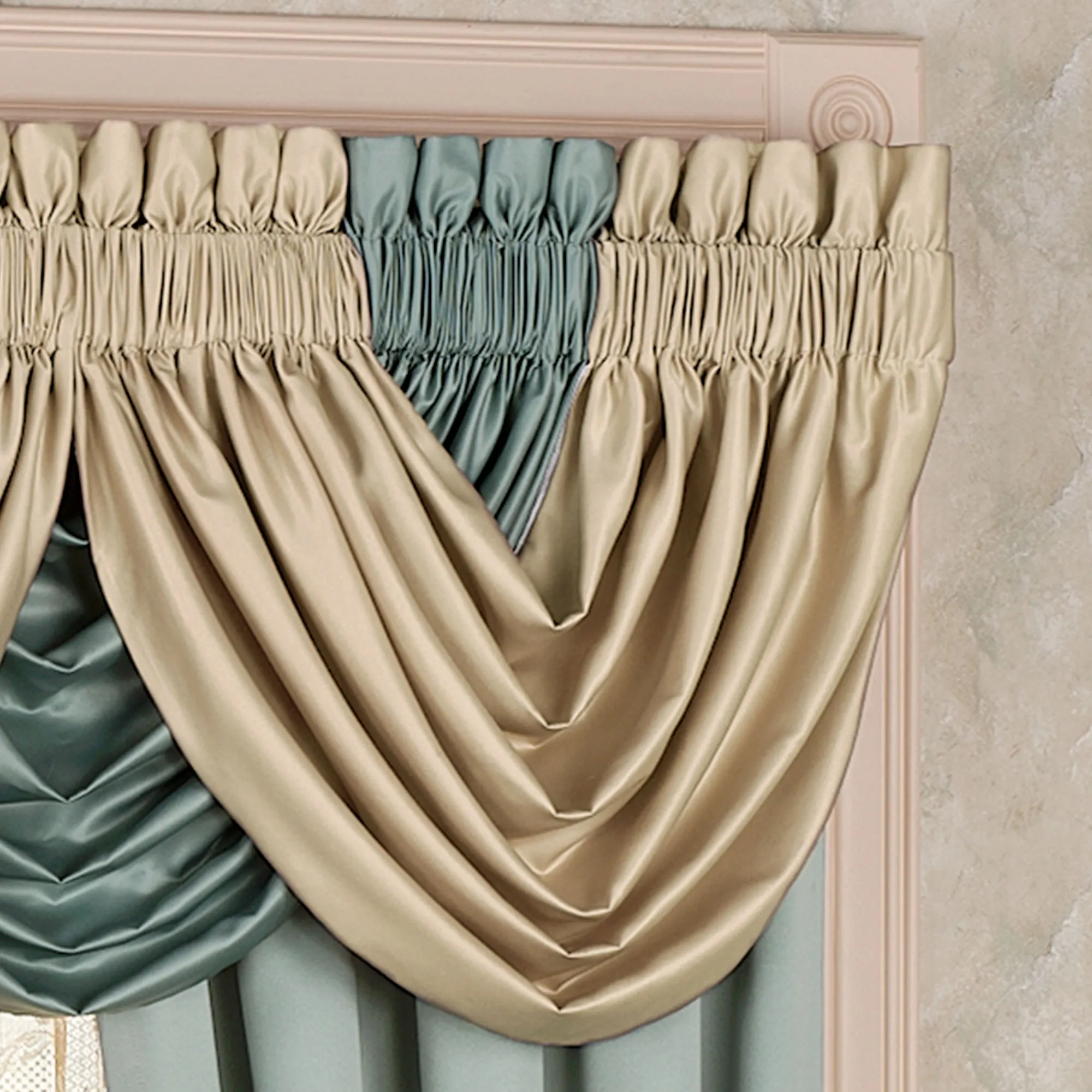 Window Treatment has 3" rod pockets. Waterfall Valance is threaded through rod pockets on top and bottom to create cascading effect (three shown). Use one for each 12"-15" of window. Tailored, lined Curtains are solid color; tiebacks included. Ascot Valance may be layered. Blouson Valance may also be layered for fullness.