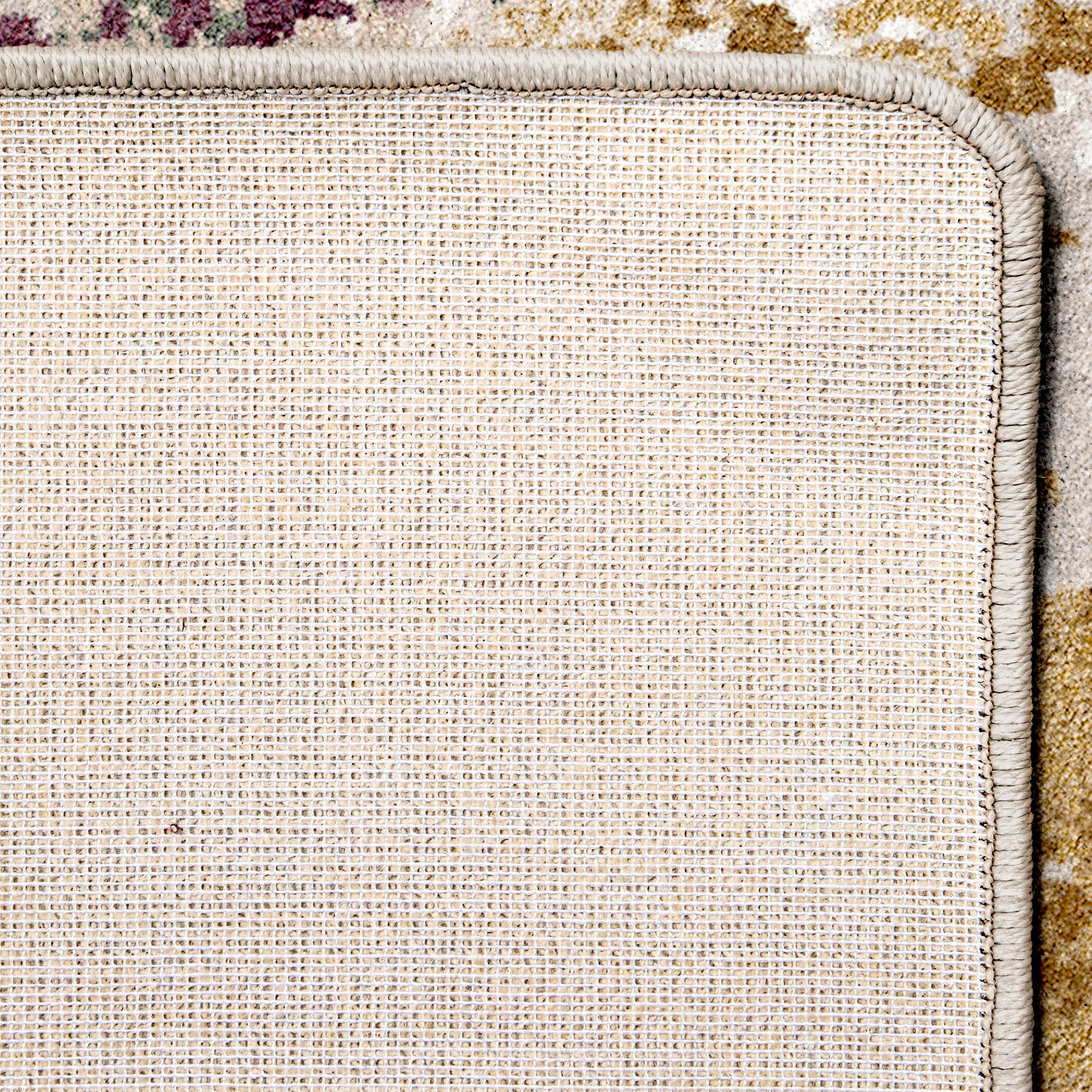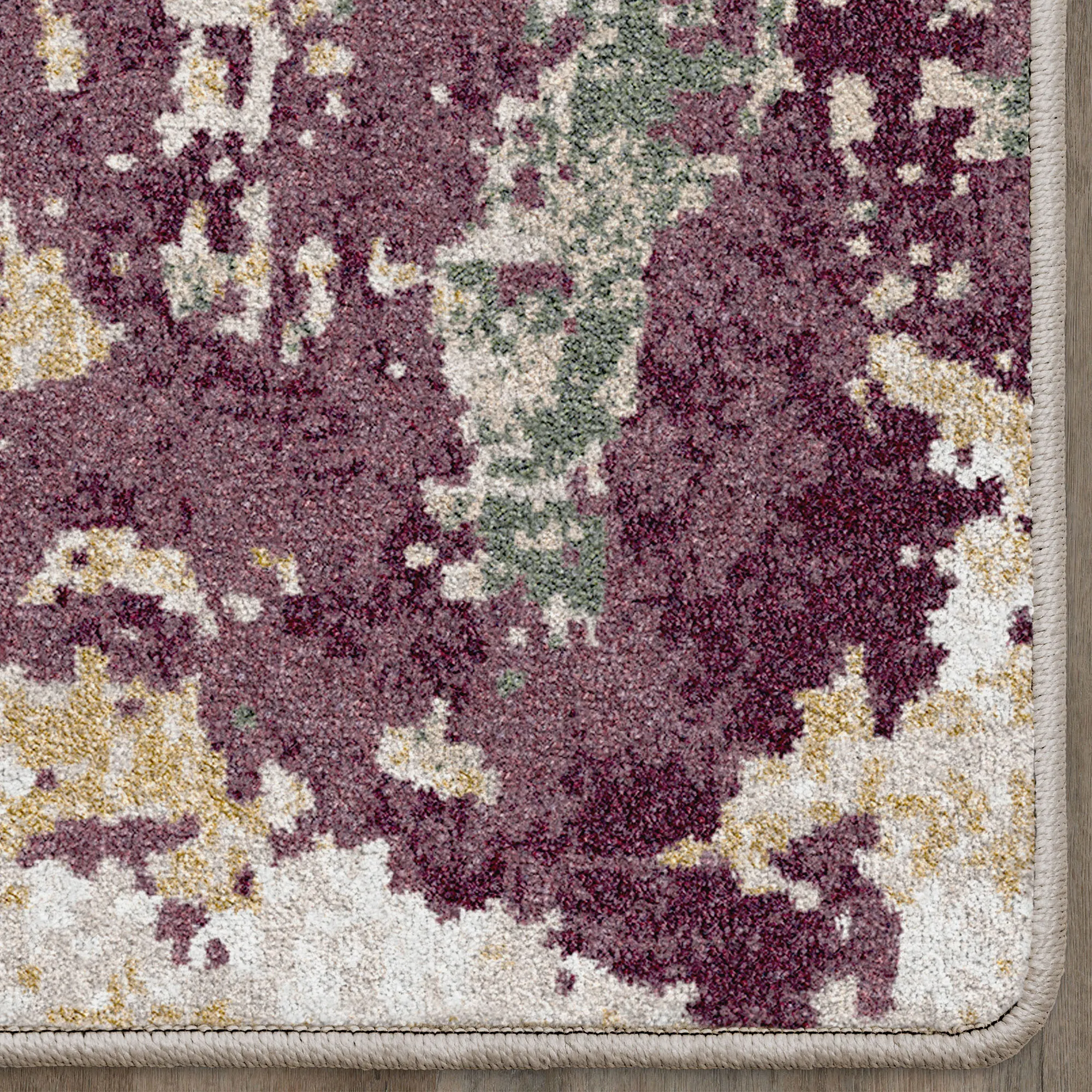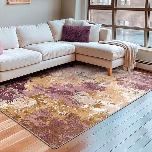 A Color Drift of unique designs creates an intriguing abstract effect. This durable, power-loomed nylon area rug, .375" thick, is kid- and pet-friendly and stain- and warp-resistant. The plum coloration includes shades of parchment, cream, butter, plum, dark amber, and jungle green. Backing is polypropylene and polyester. We recommend professional cleaning by a rug cleaner.