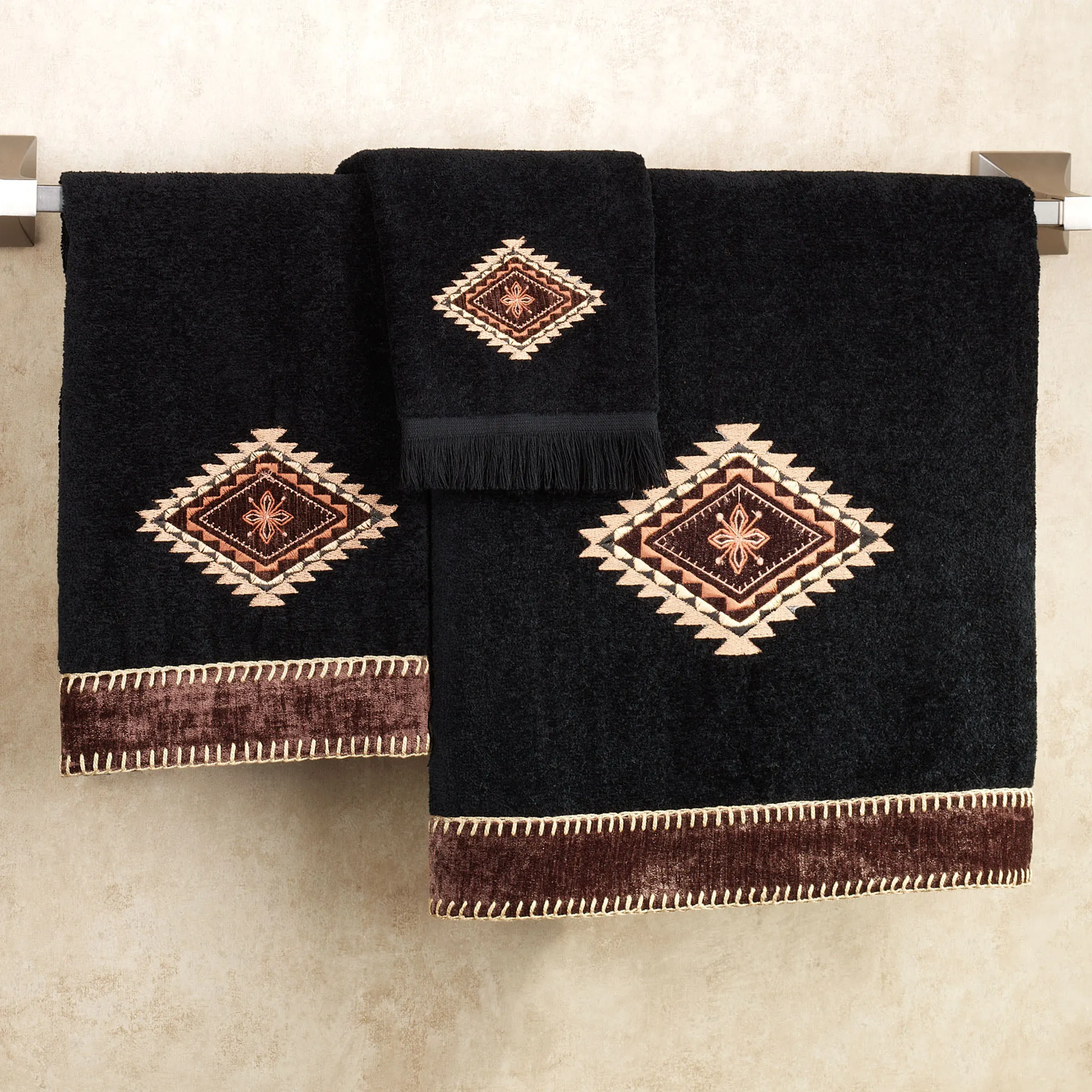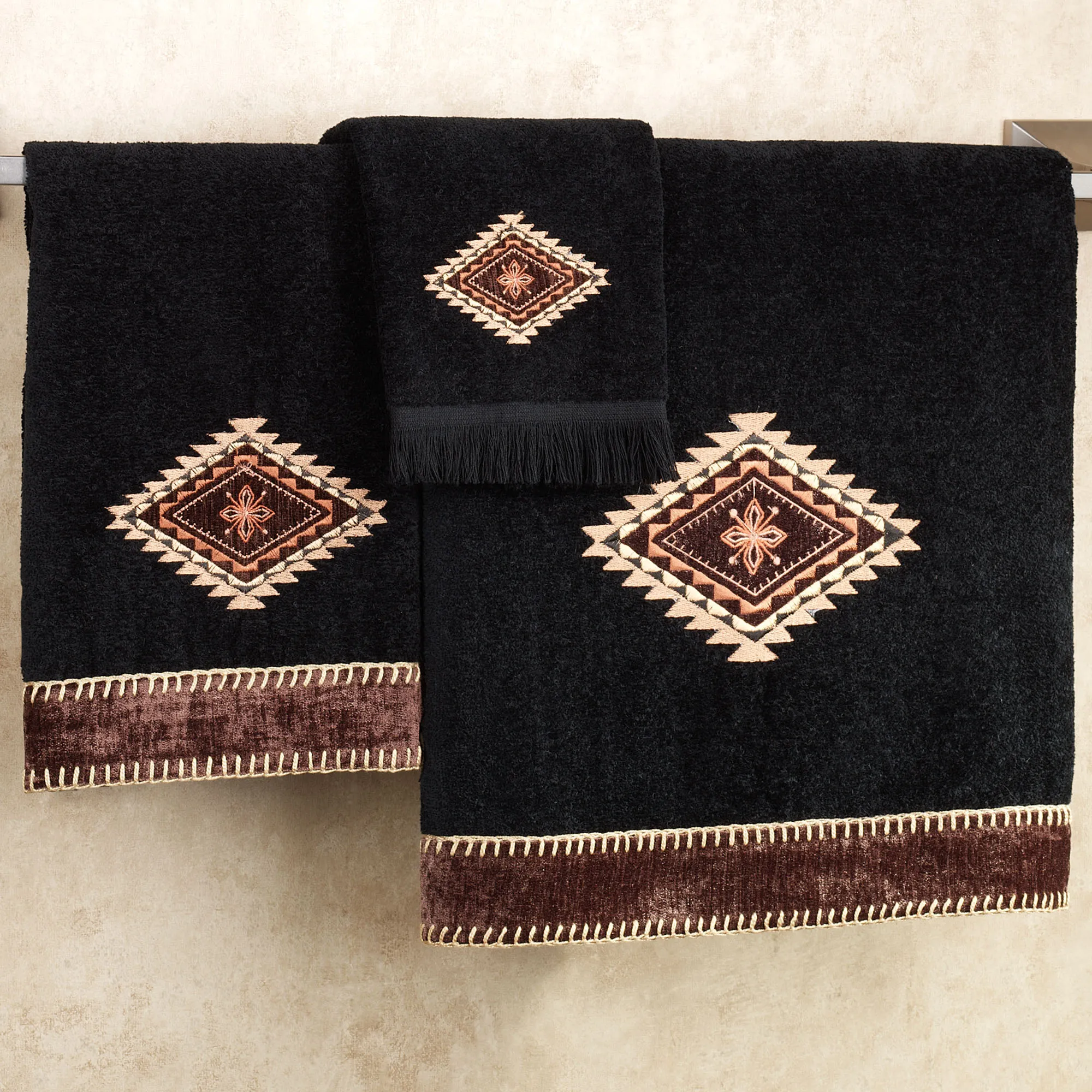 A stunning addition to your bathroom, the Colton Southwest Bath Towel Set feature embroidered medallions on a solid color ground. Cotton Southwest towels have sheared faces. Bath towel and hand towel have brown velvet trim and gold stitching on the bottom. Towel set includes a bath towel, 28"Wx51"L; hand towel, 16"Wx30"L; and fingertip towel, 12"Wx19"L. Machine wash. Imported.