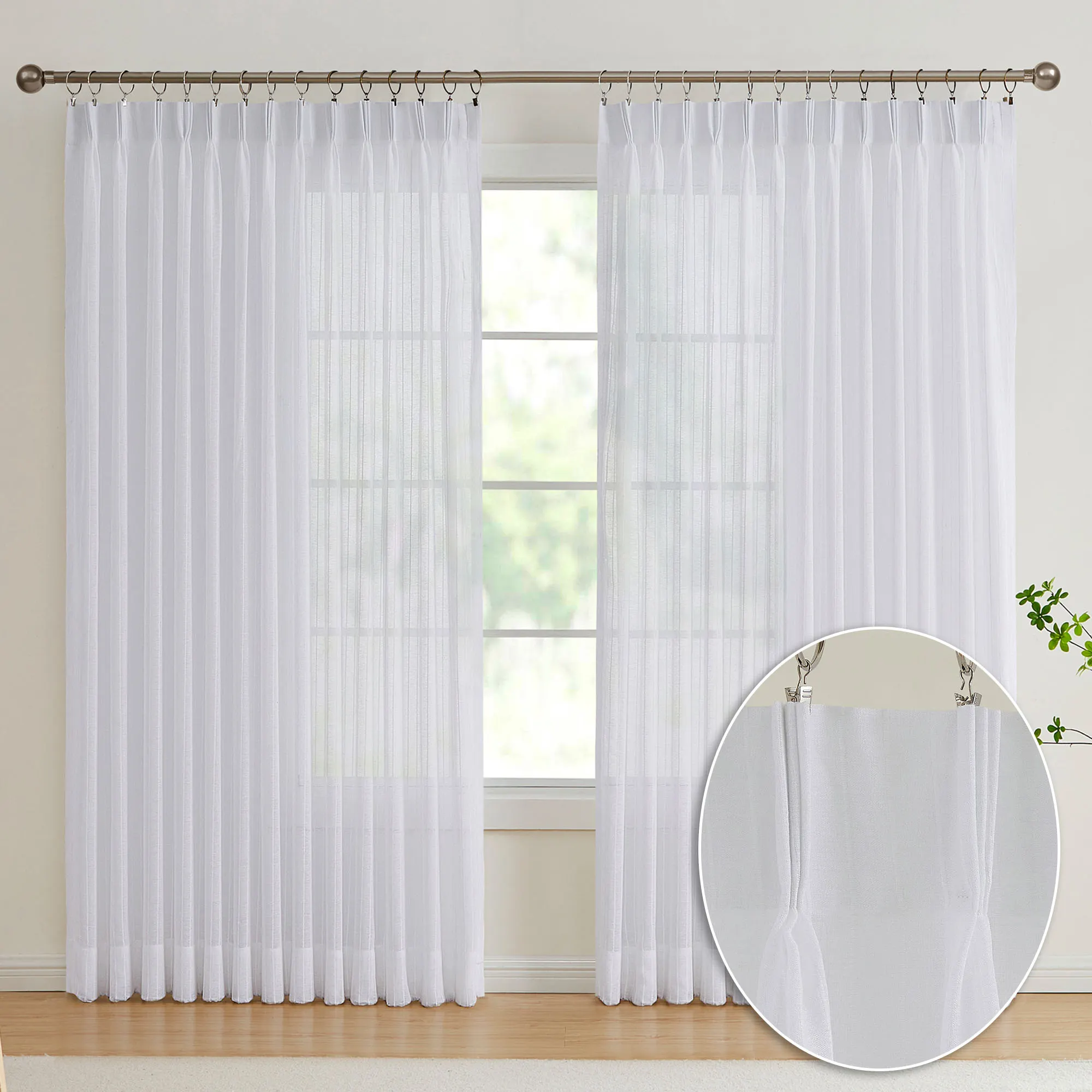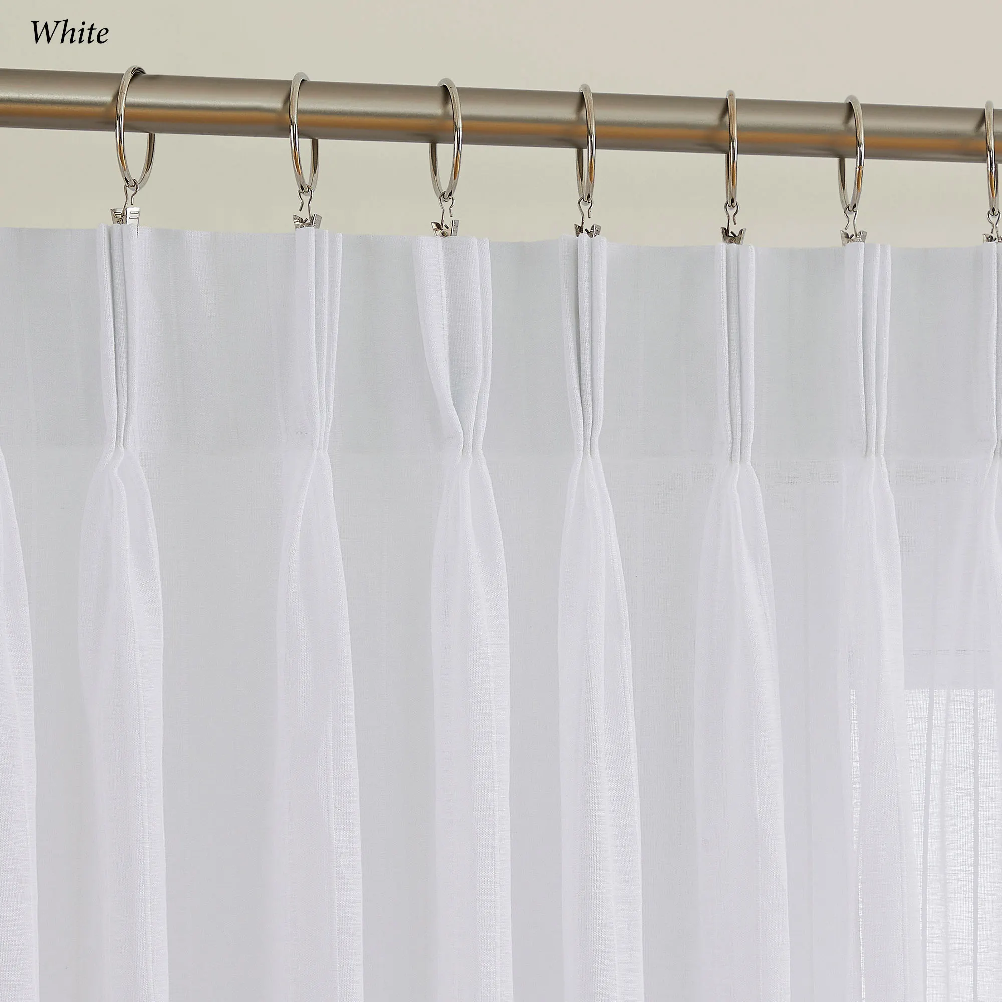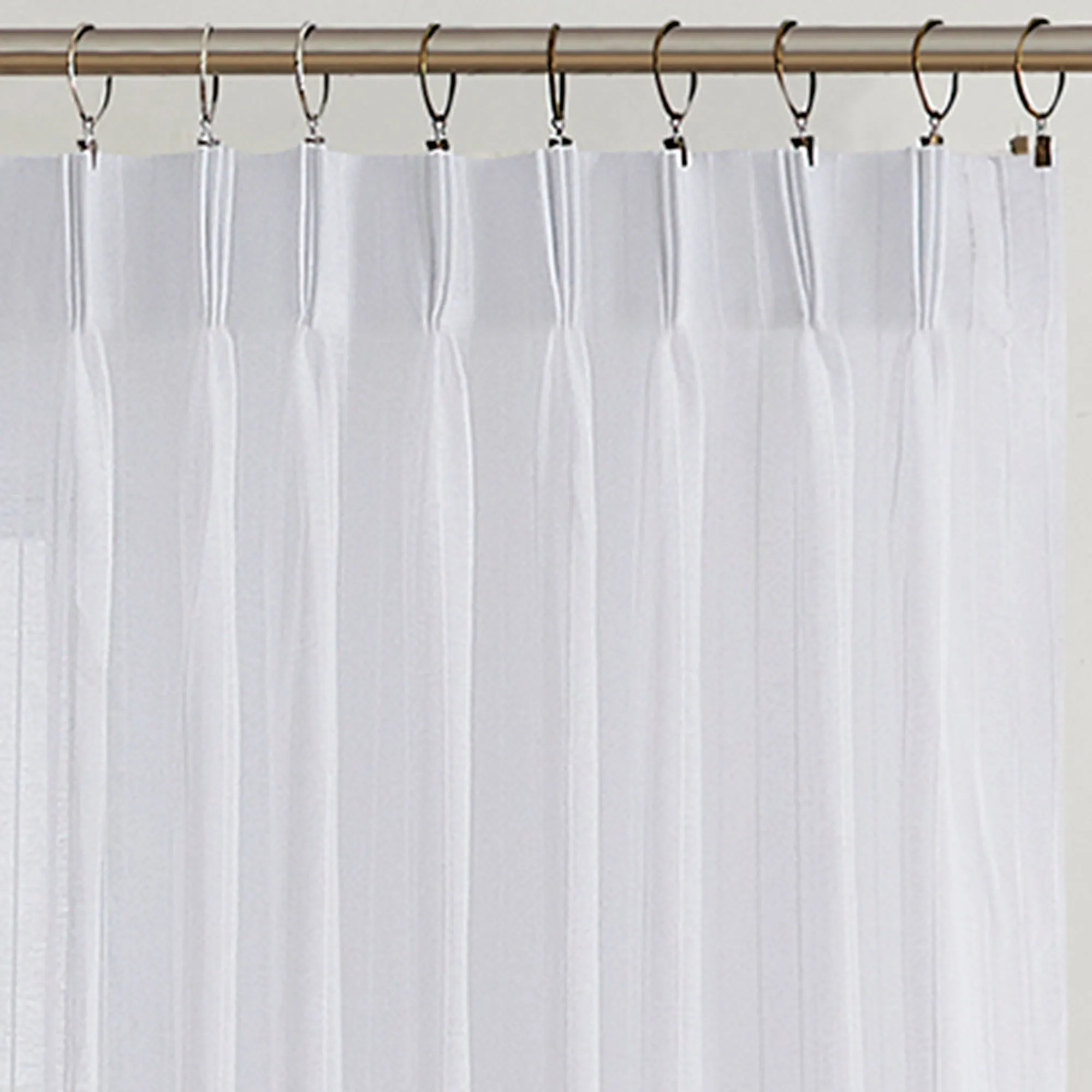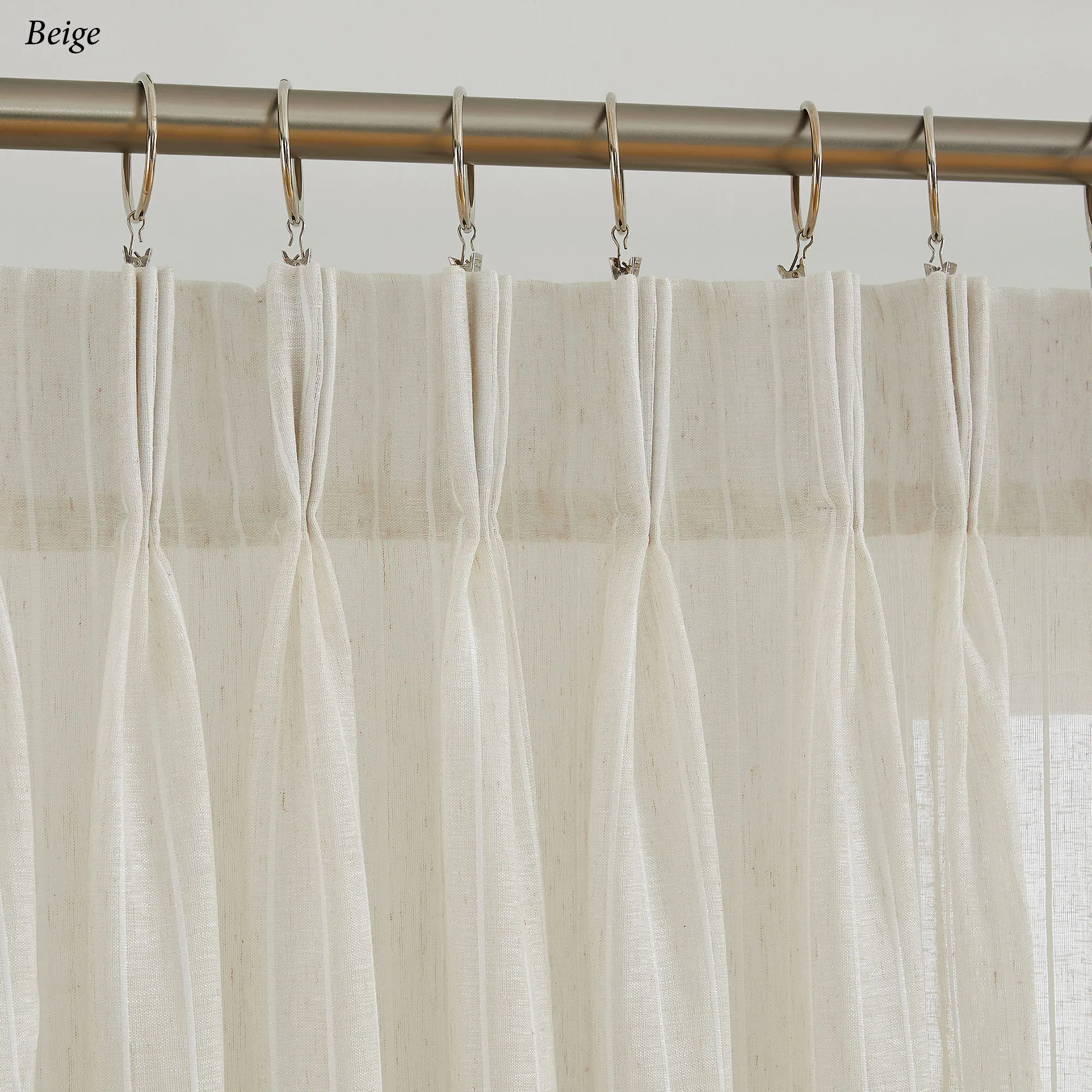 The Colyton Pinch Pleat Curtain Pair adds a simplistic finishing touch to your view. With a semi-sheer design, the 84"L curtains feature vertical dobby-woven stripes and hang via your clip rings. The 72"W Pair requires 22 clip rings. The 96"W Pair requires 30 clip rings. The 120"W Pair requires 36 clip rings. The 144"W Pair requires 44 clip rings. White is polyester. Beige is polyester/linen. Machine washable. Imported. The curtain pair width is the total width of two panels together.
