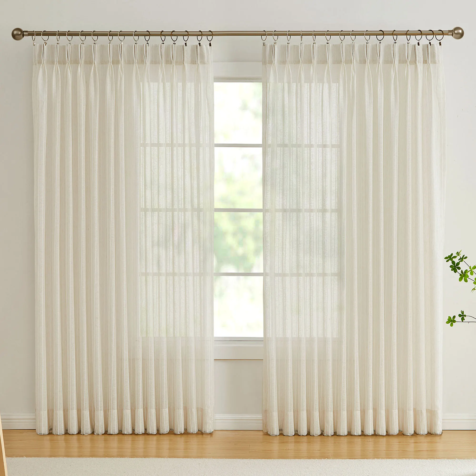 The Colyton Pinch Pleat Curtain Pair adds a simplistic finishing touch to your view. With a semi-sheer neutral hue, the 84"L curtains feature vertical dobby-woven stripes and hang via your clip rings. The 72"W Pair requires 22 clip rings. The 96"W Pair requires 30 clip rings. The 120"W Pair requires 36 clip rings. The 144"W Pair requires 44 clip rings. White is polyester. Beige and Natural are polyester/linen. Machine washable. Imported. The curtain pair width is the total width of two panels together.