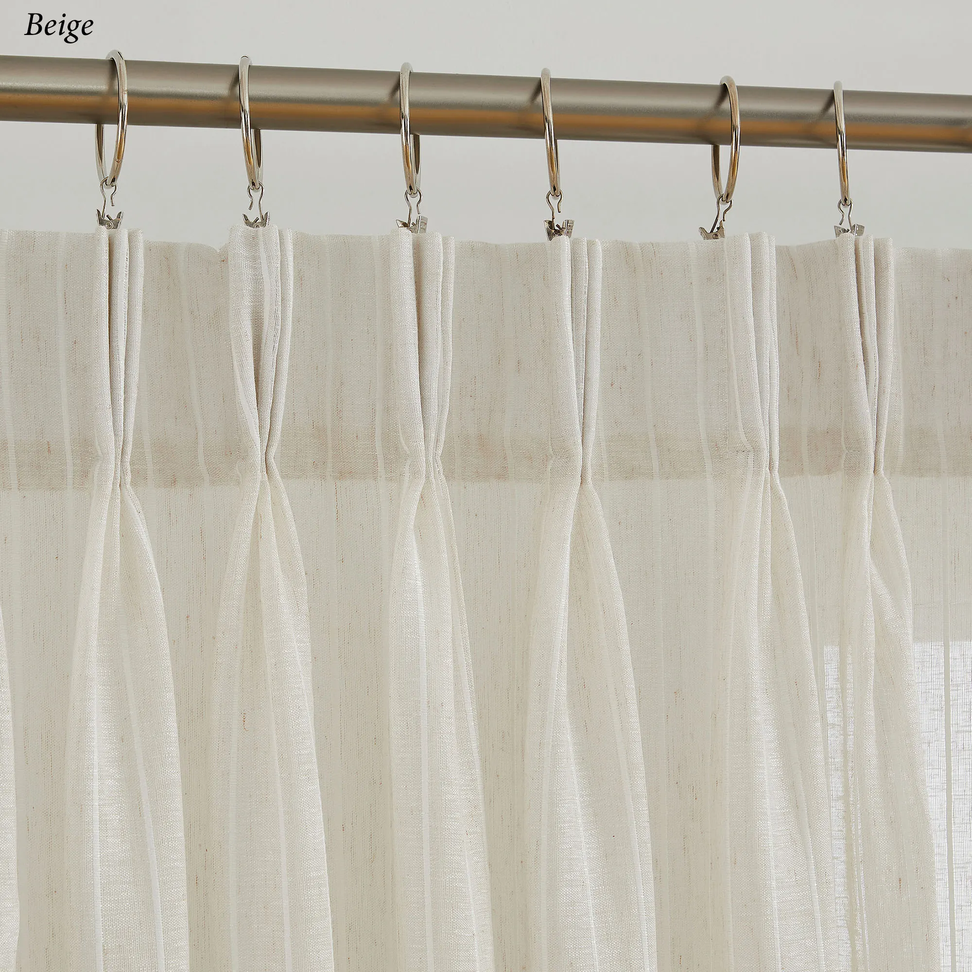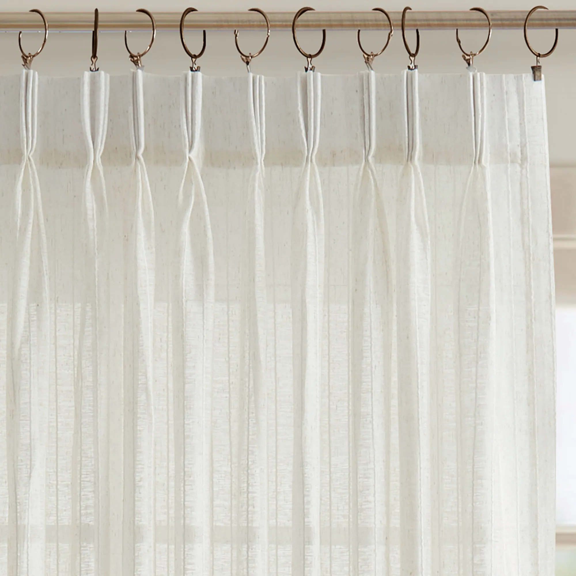 The Colyton Pinch Pleat Patio Panel adds a simplistic finishing touch to your view. With a semi-sheer design, the panel features vertical dobby-woven stripes and hangs via your clip rings. The 96"Wx84"L patio panel requires 30 clip rings. Beige is polyester/linen. White is polyester. Machine washable. Imported.