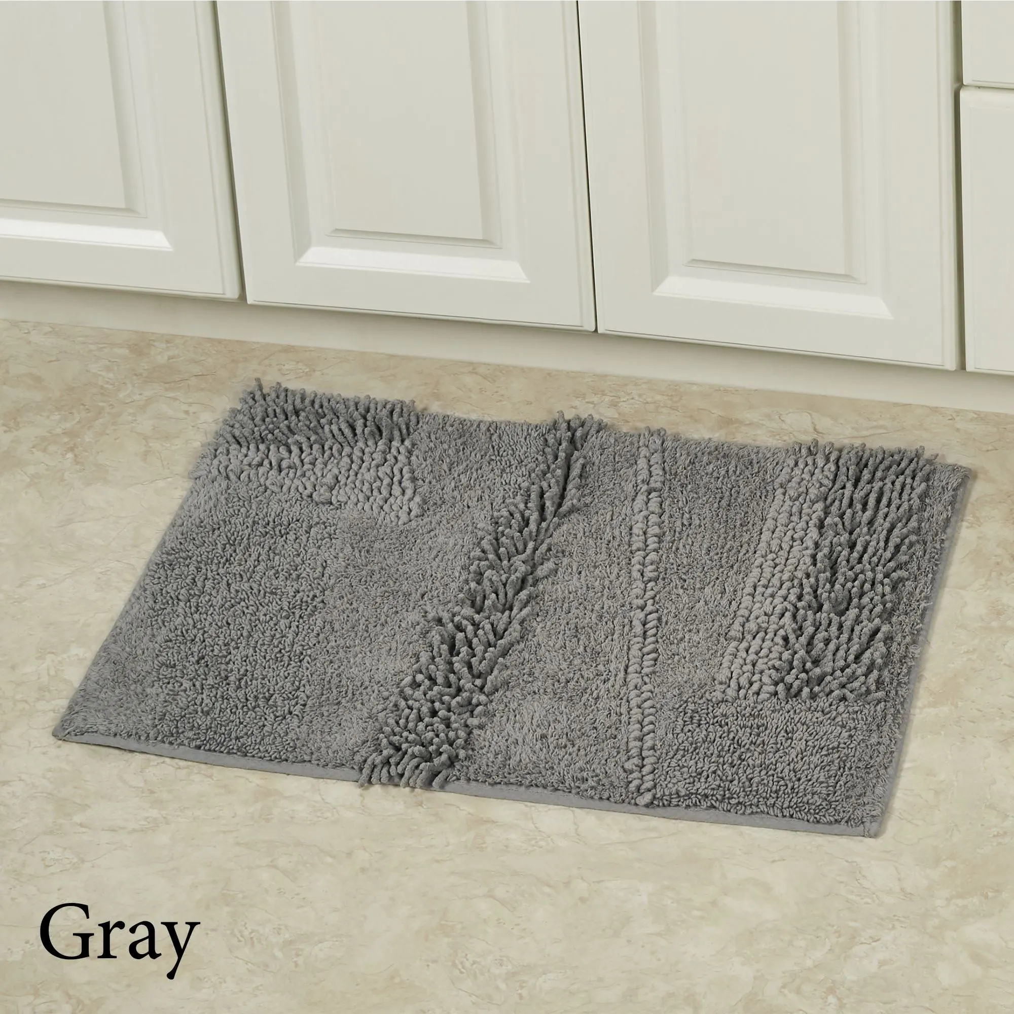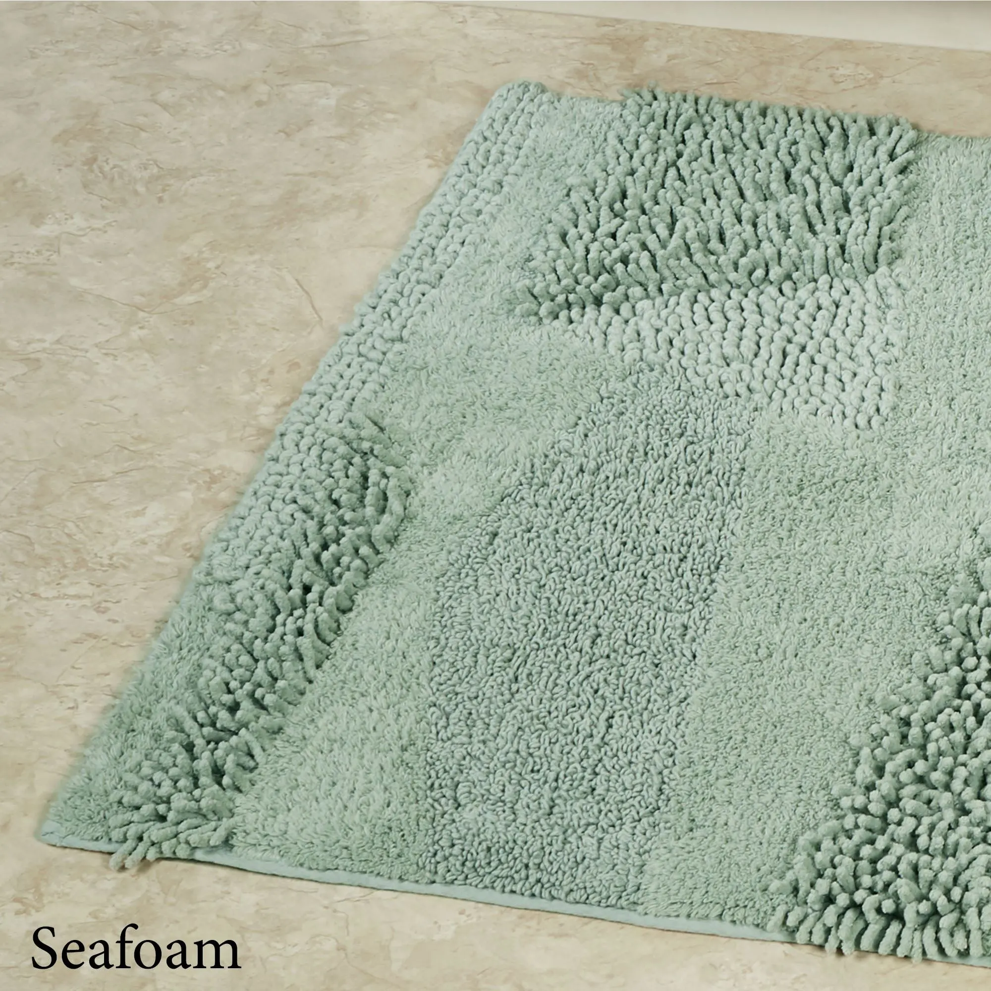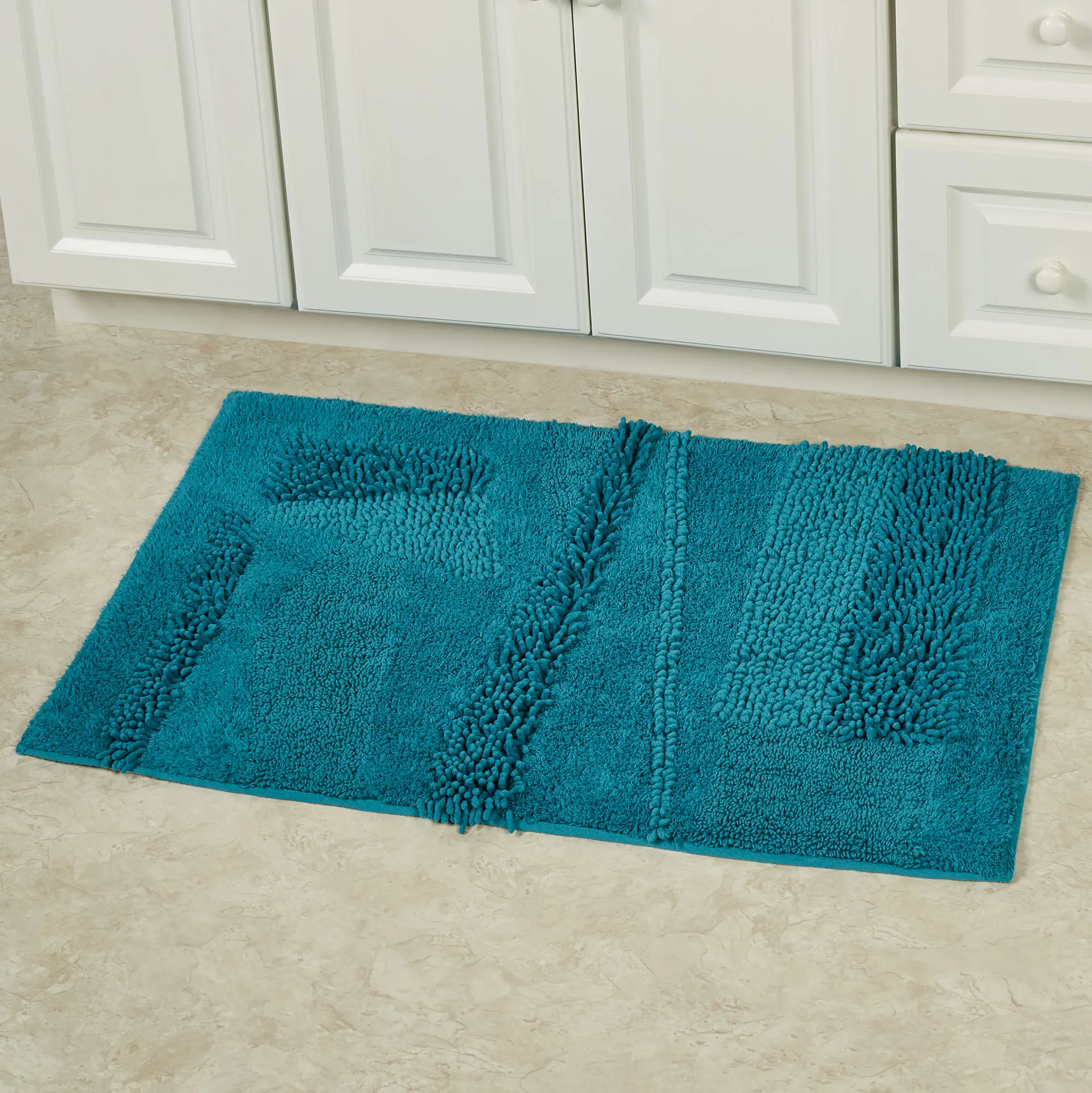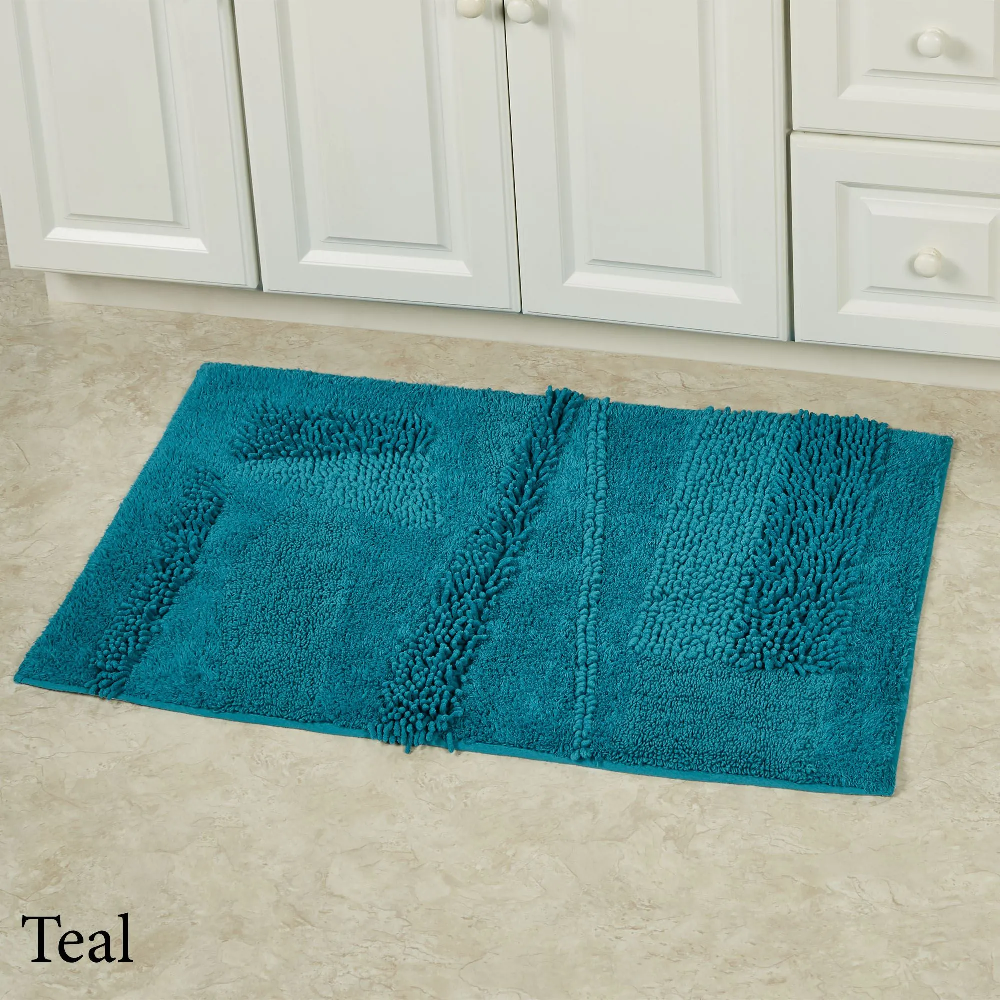 You will love the unique Composition of this bath rug. Machine-tufted of cotton, this solid color rug, .5" thick, has asymmetrical designs with an ultra-soft, plush feel and a nonskid latex backing. Rectangle Rug is available in three sizes. Runner is 24"x60" (2'x5'). Specify Blush, Almond, Charcoal, Glacier, Gray, Ivory, Midnight Blue, Seafoam, Teal, or White. Machine washable. Imported.