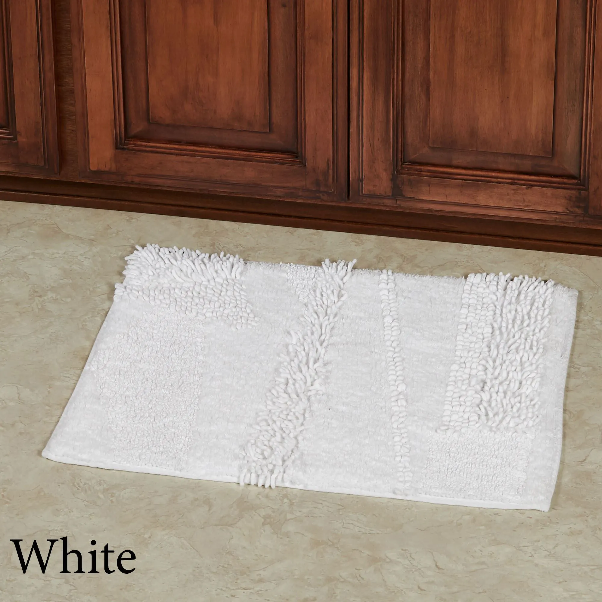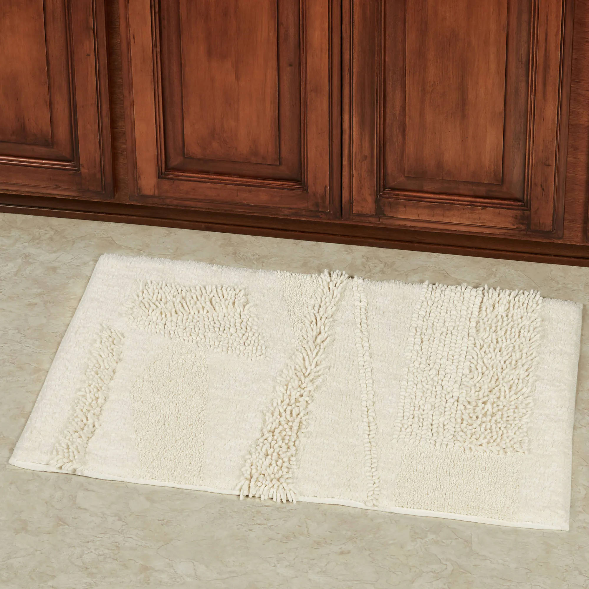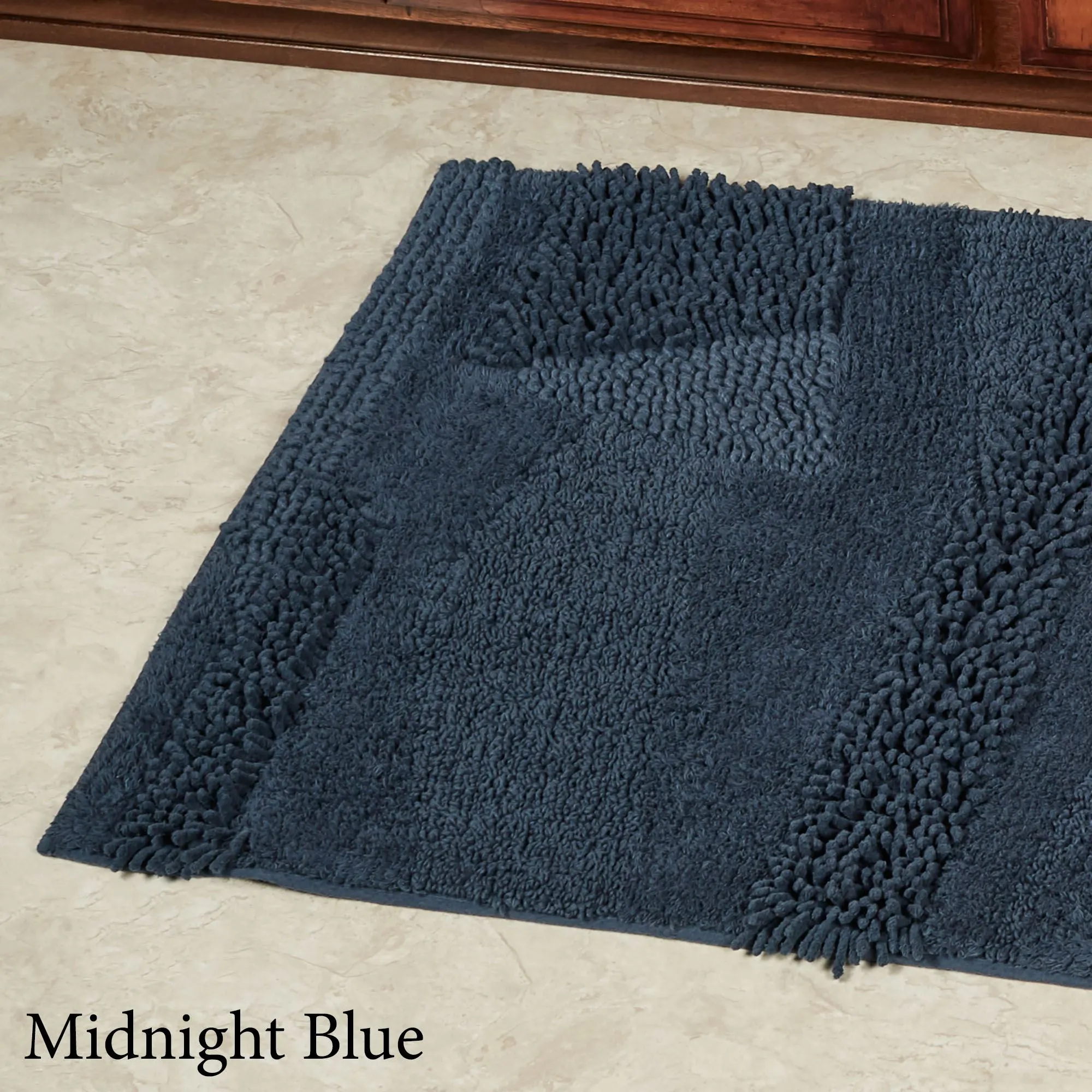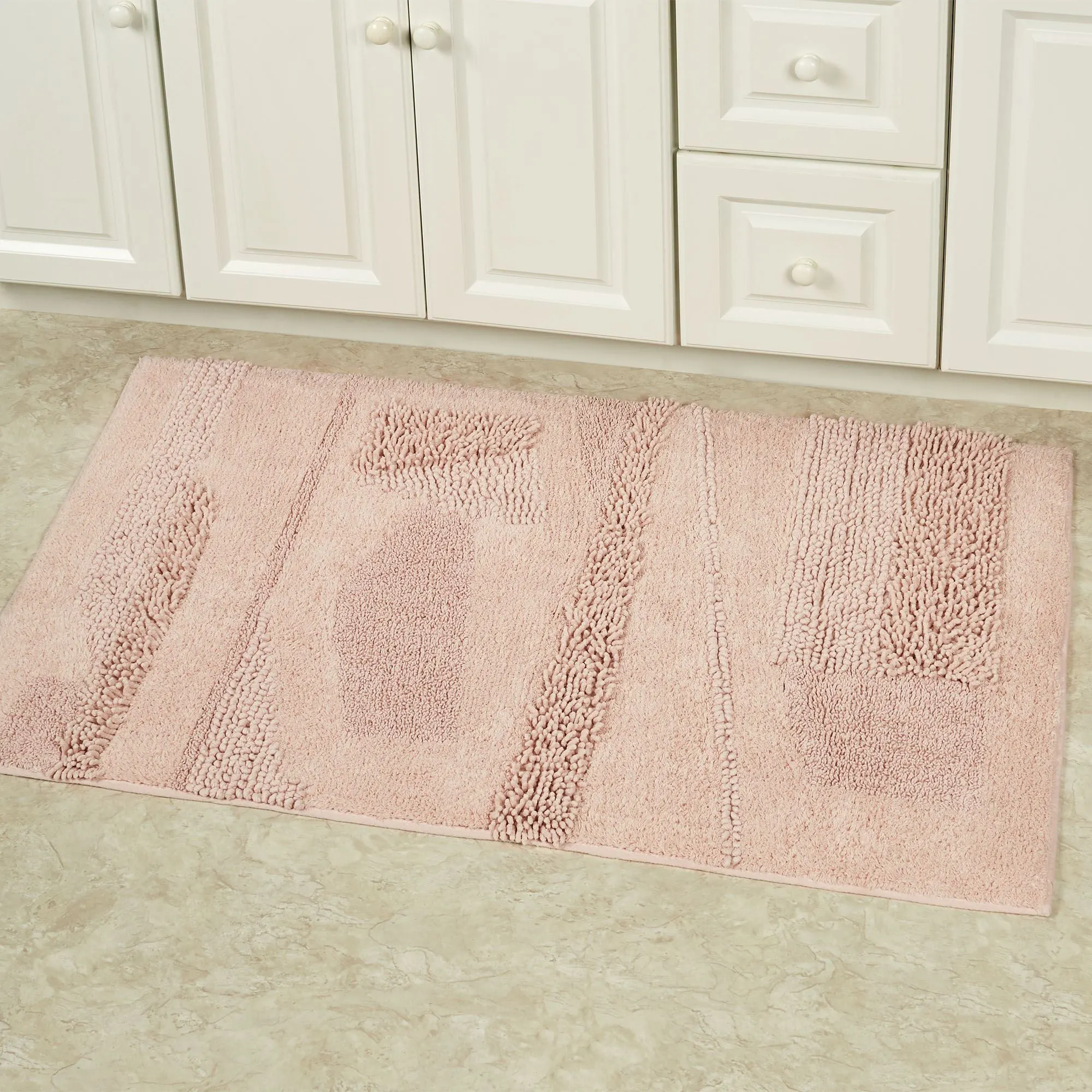 You will love the unique Composition of this bath rug. Machine-tufted of cotton, this solid color rug, .5" thick, has asymmetrical designs with an ultra-soft, plush feel and a nonskid latex backing. Rectangle Rug is available in three sizes. Runner is 24"x60" (2'x5'). Specify Blush, Almond, Charcoal, Glacier, Gray, Ivory, Midnight Blue, Seafoam, Teal, or White. Machine washable. Imported.