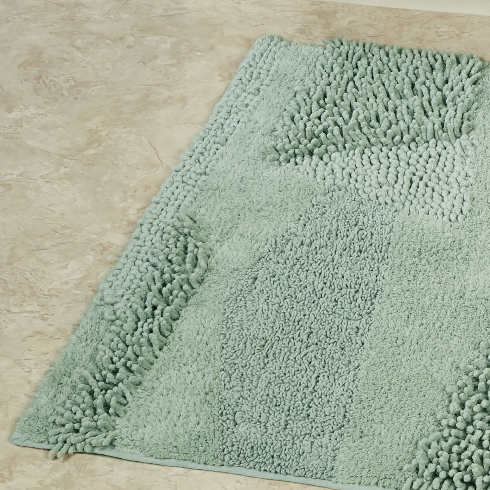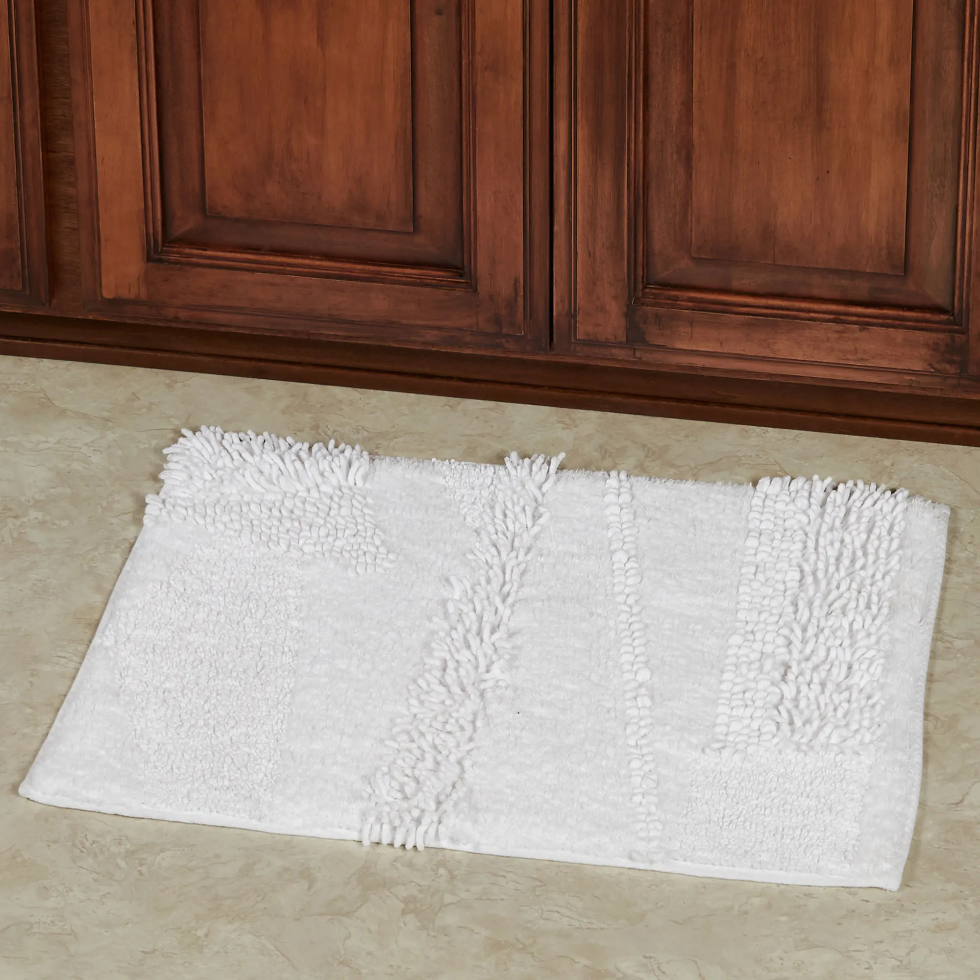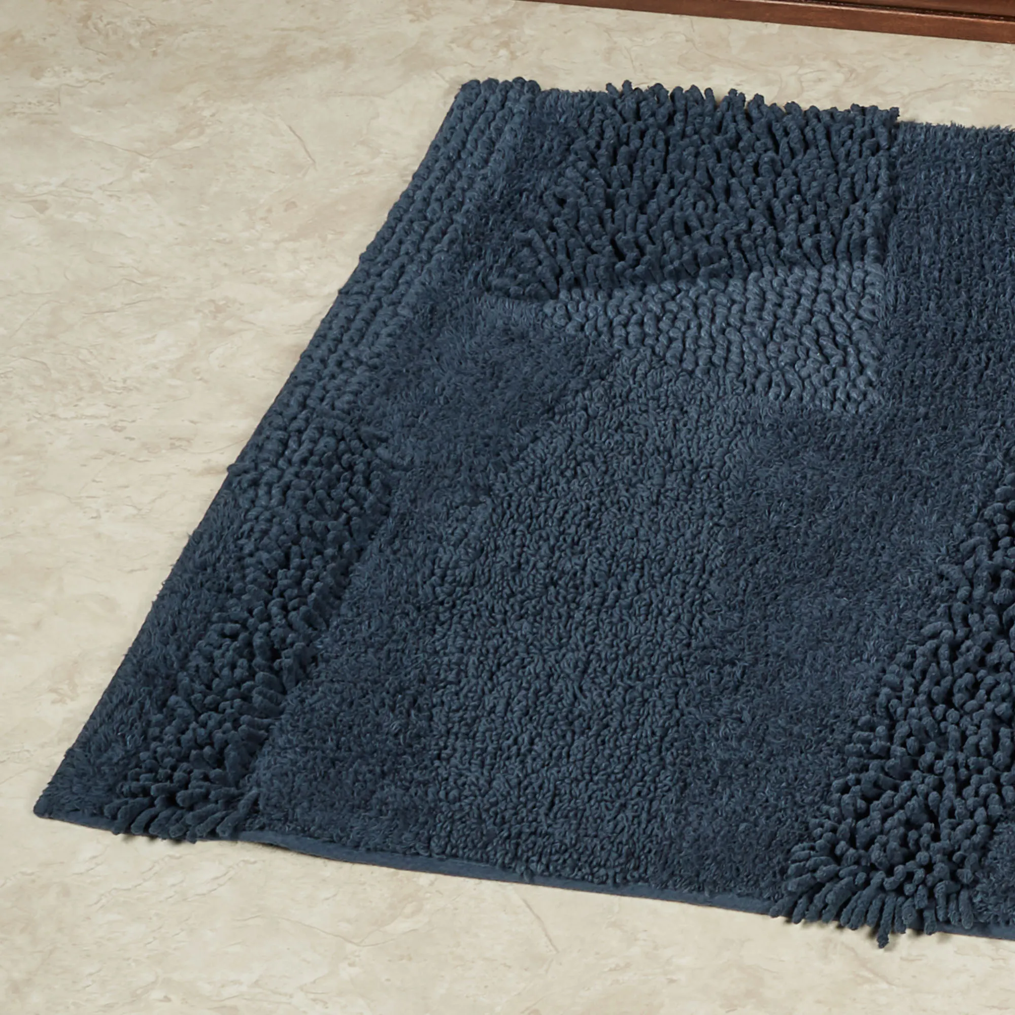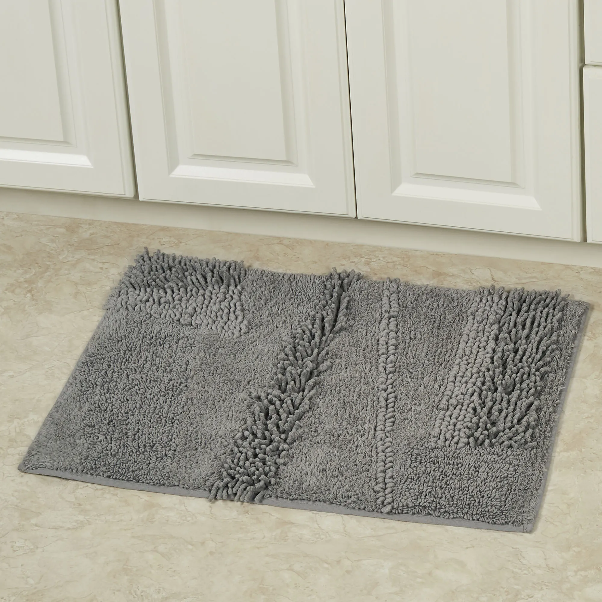 You will love the unique Composition of this bath rug. Machine-tufted of cotton, this solid color rug, .5" thick, has asymmetrical designs with an ultra-soft, plush feel and a nonskid latex backing. Rectangle Rug is available in three sizes. Runner is 24"x60" (2'x5'). Specify Blush, Almond, Charcoal, Glacier, Gray, Ivory, Midnight Blue, Seafoam, Teal, or White. Machine washable. Imported.