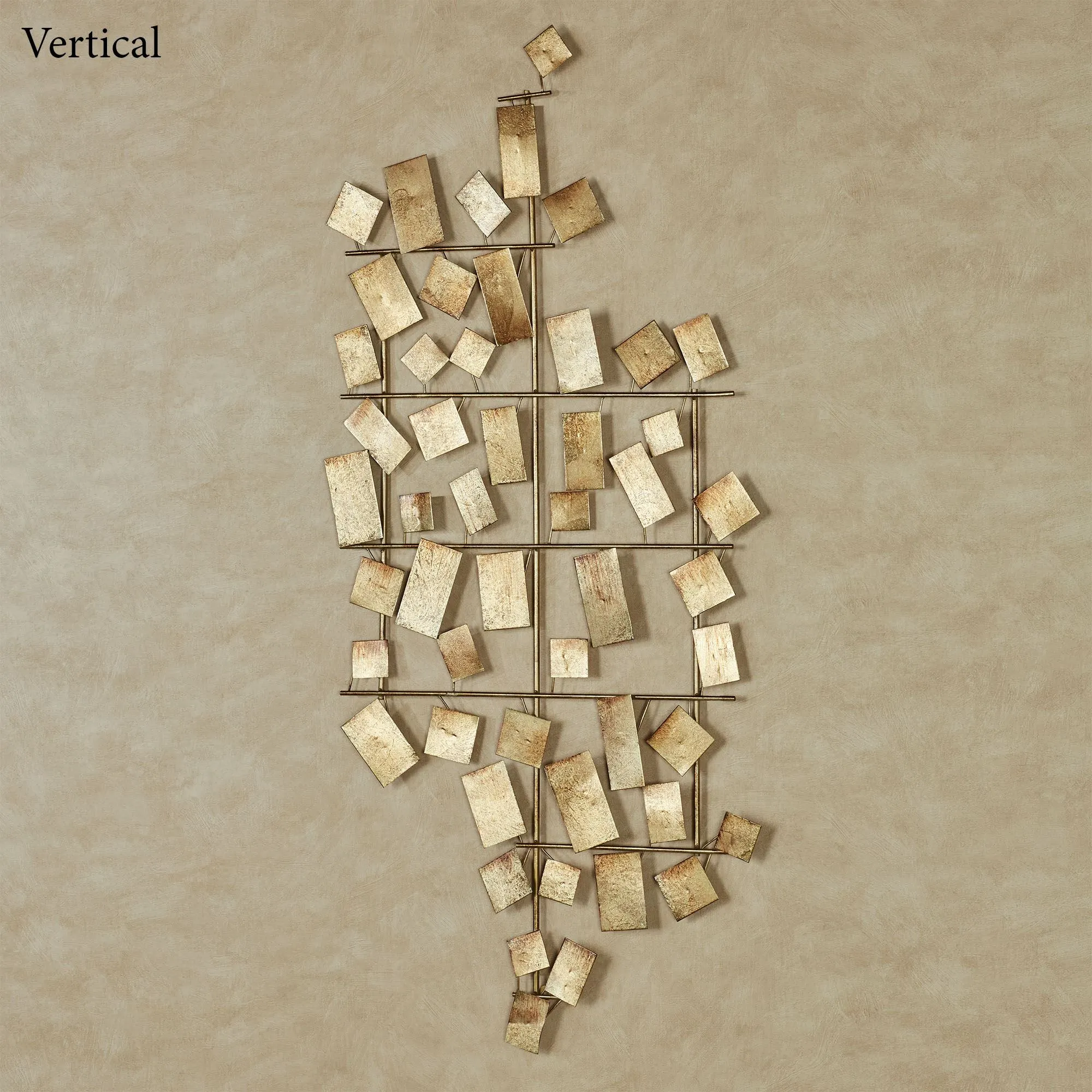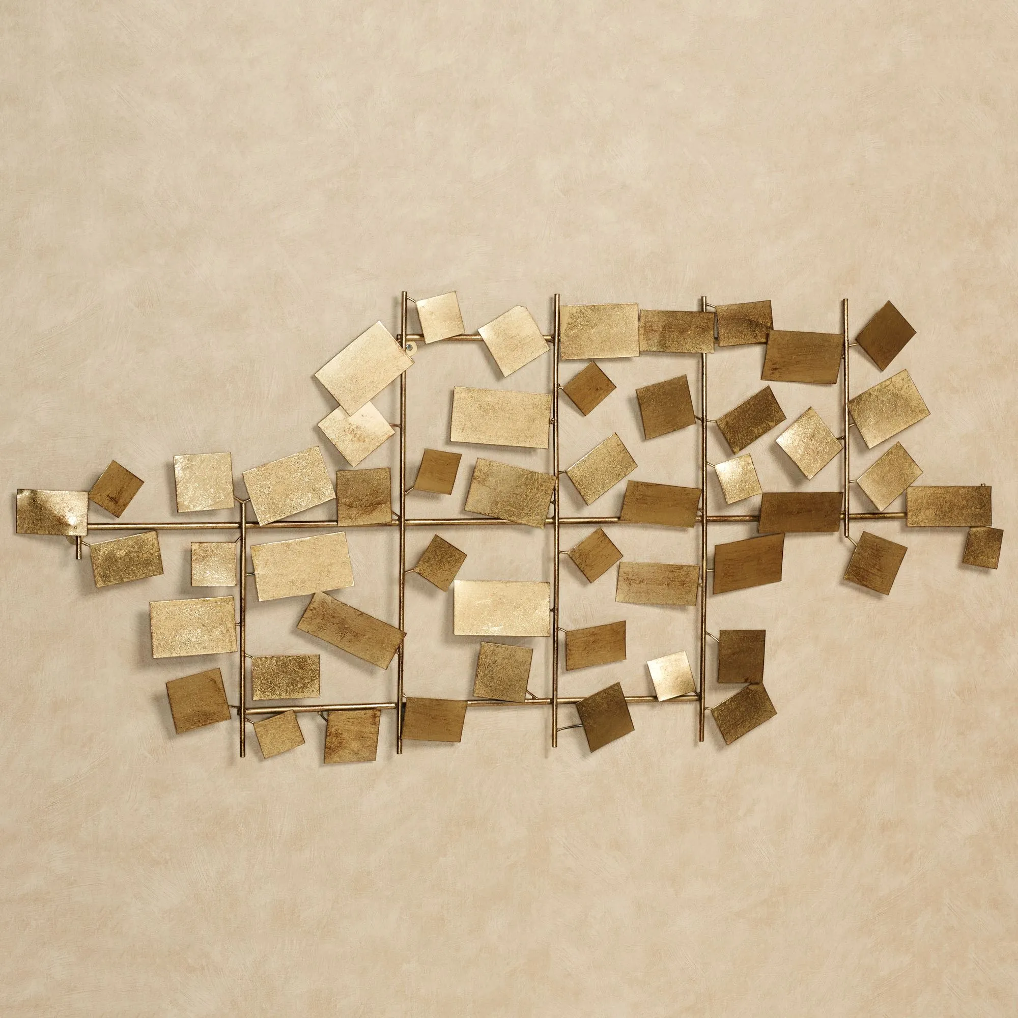Abstract beauty shines from the Connections Metal Wall Art in a grand eclectic affair. Reflecting the light at various angles, each metal geometric piece features a radiant gold leaf finish that shimmers with metallic splendor from the open framework. Wall art can hang horizontally or vertically. Measures 50"Wx1.5"Dx22"H.