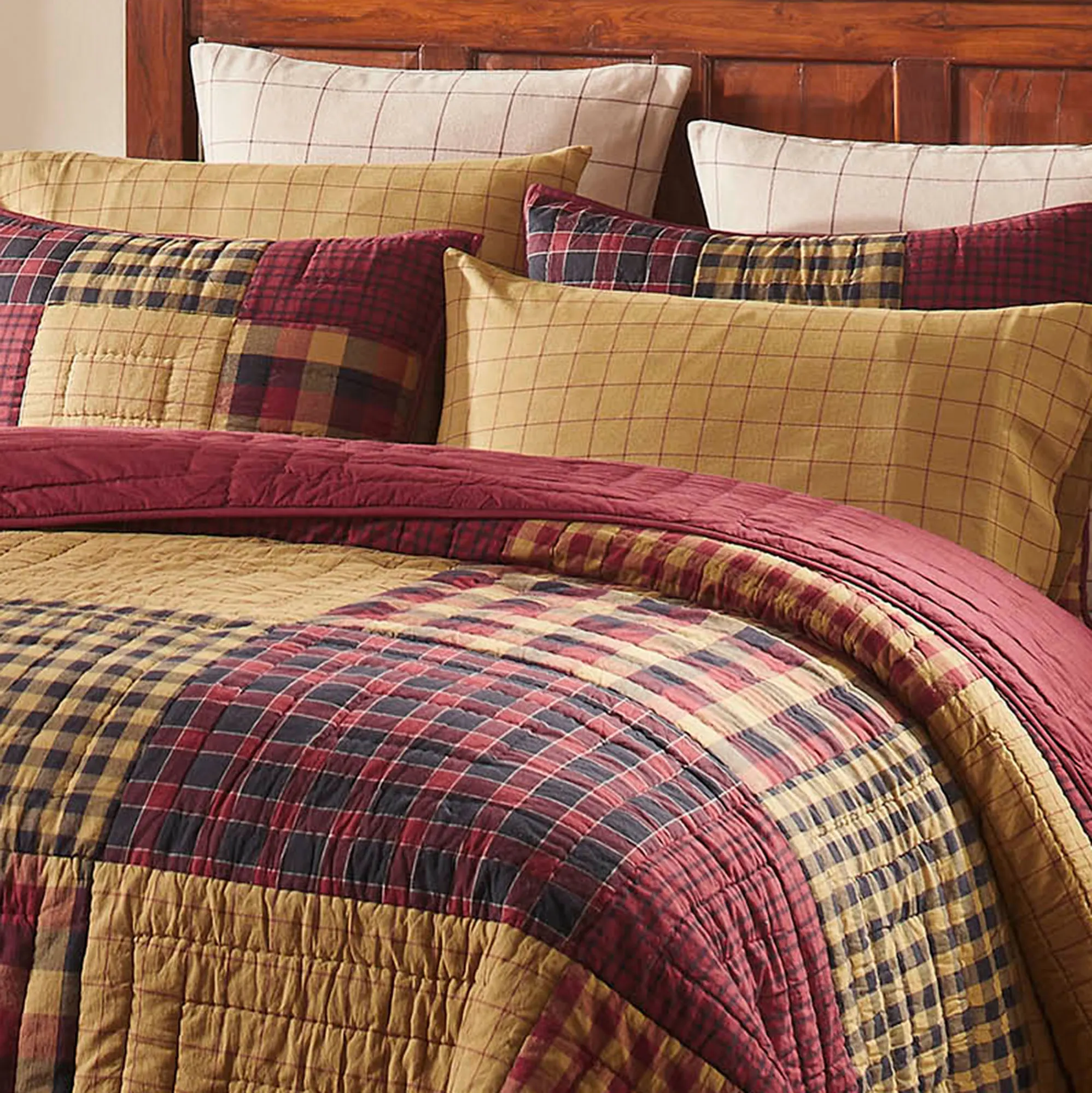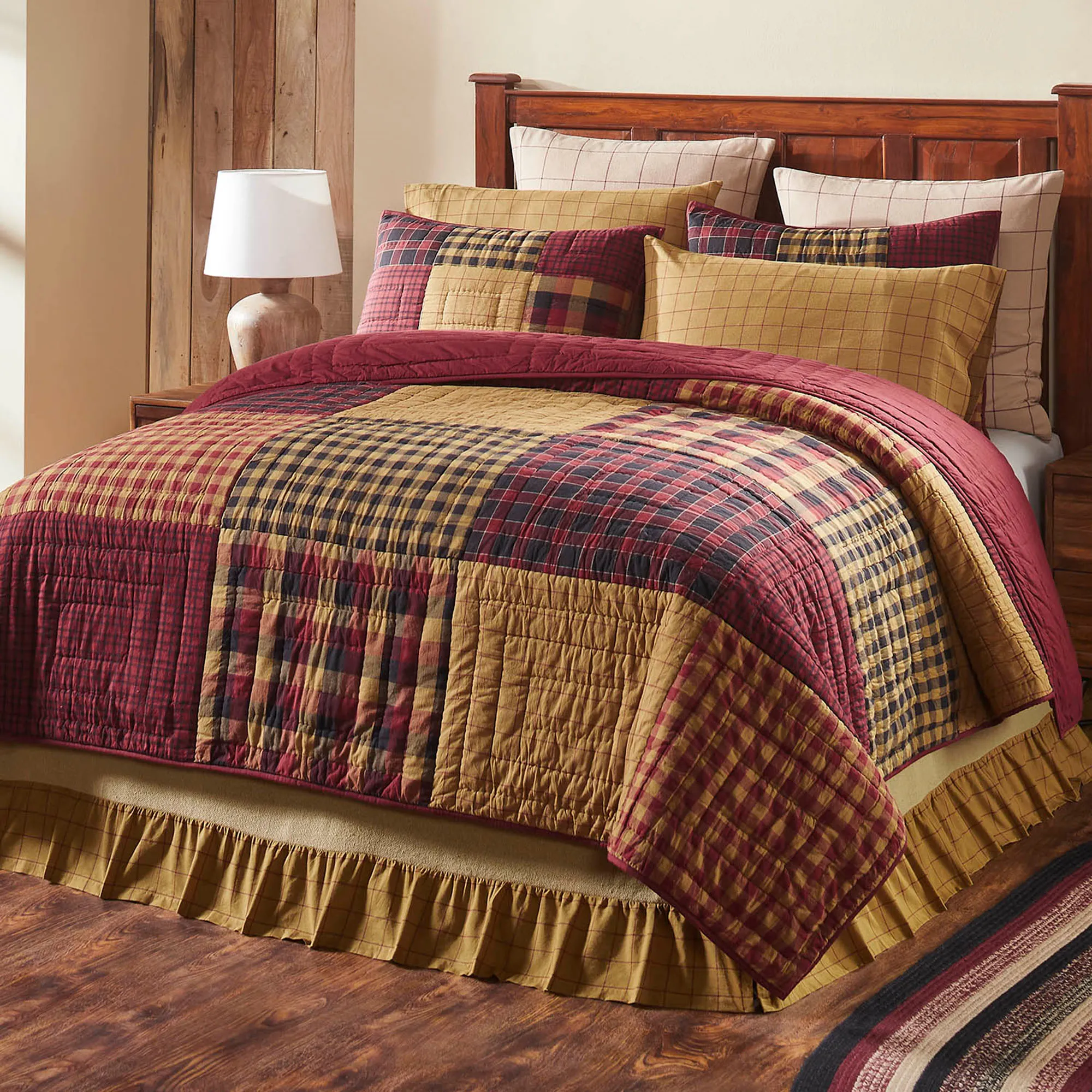 Connell Hand Quilted Cotton Burgundy and Gold Plaid Patchwork Quilt Bedding