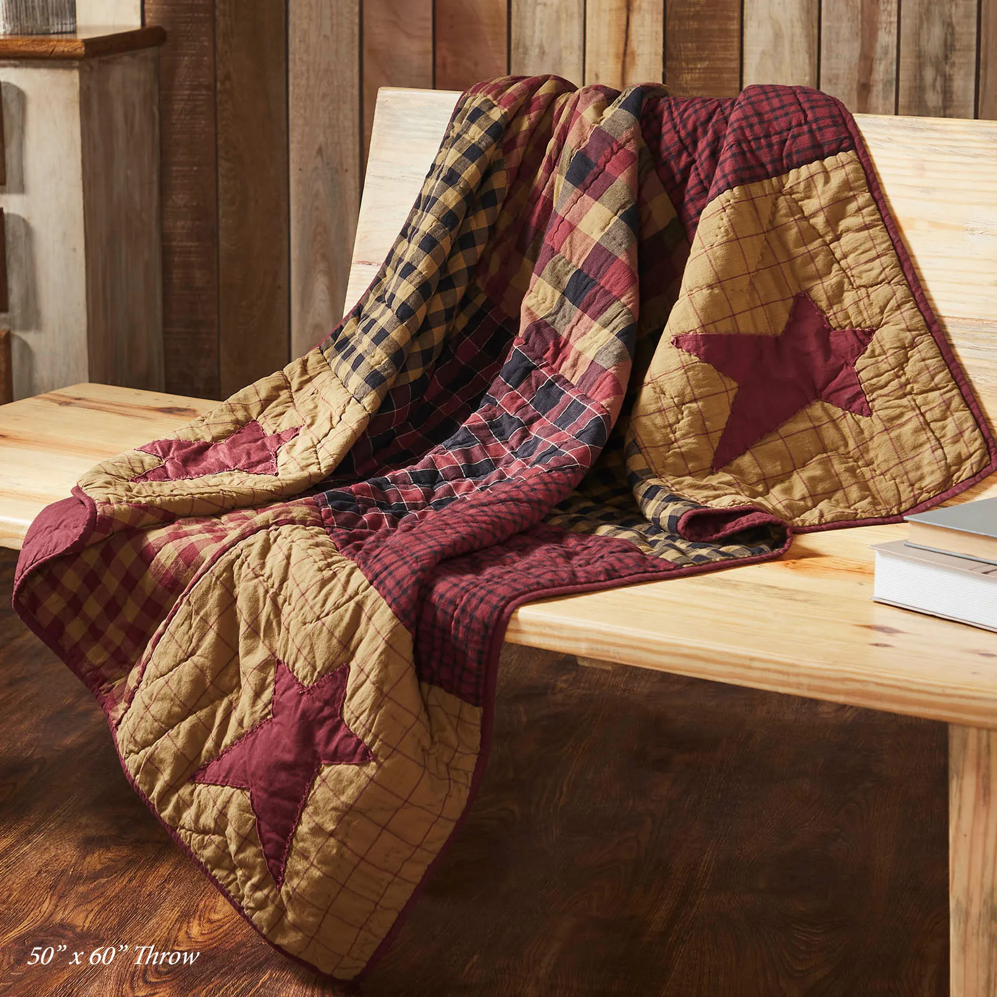 Throw has plaid designs, star accents, hand-quilted block quilting, and bound ends. Throw has a 2.75" rod pocket on the back for hanging.