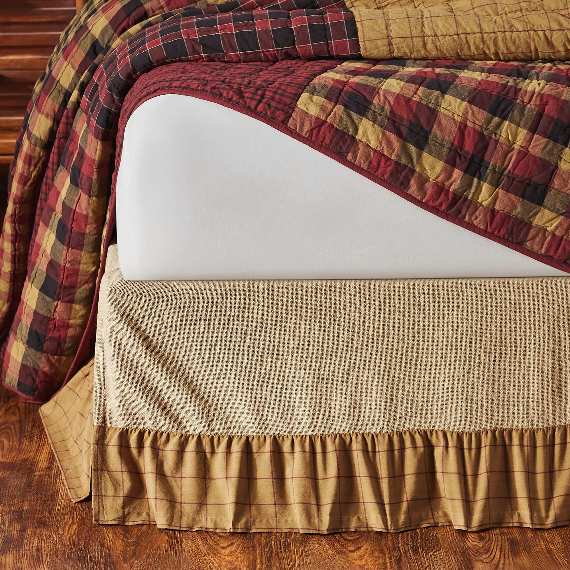 The cotton burlap Gathered Bedskirt is natural with a woven texture pieced with a windowpane design on gold. Bedskirt has a 16" drop with split corners. Hand wash. Choose Twin, Queen, or King.