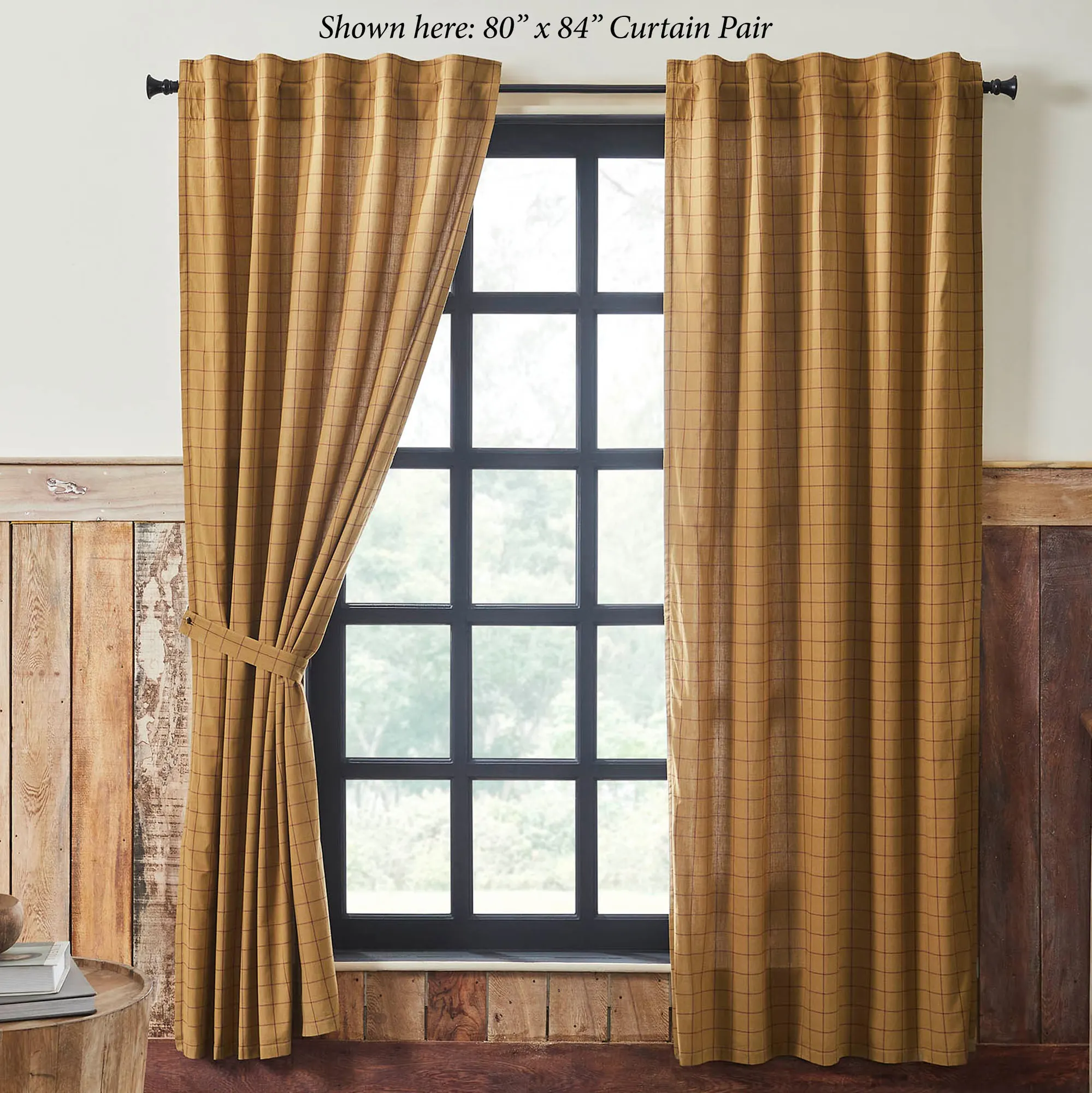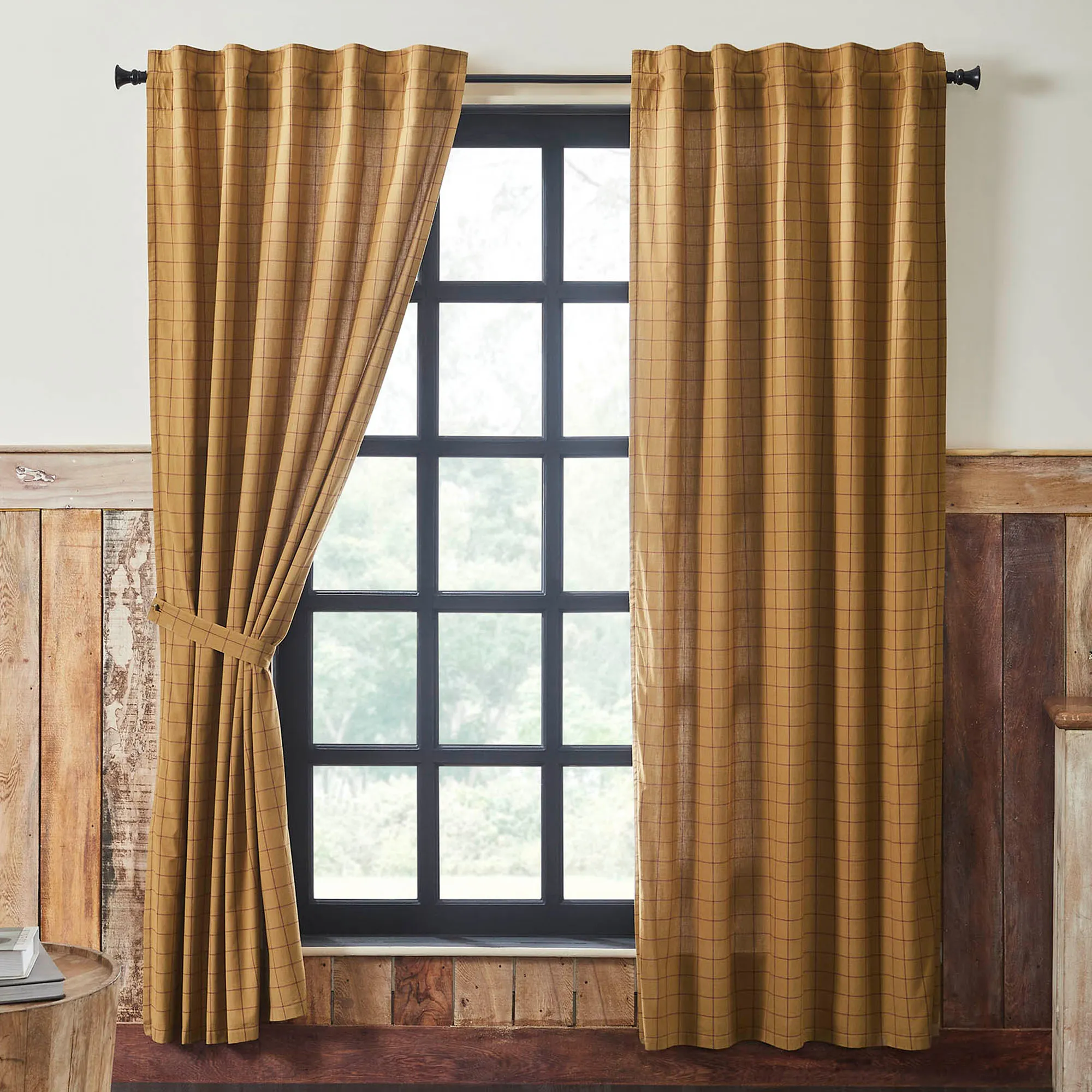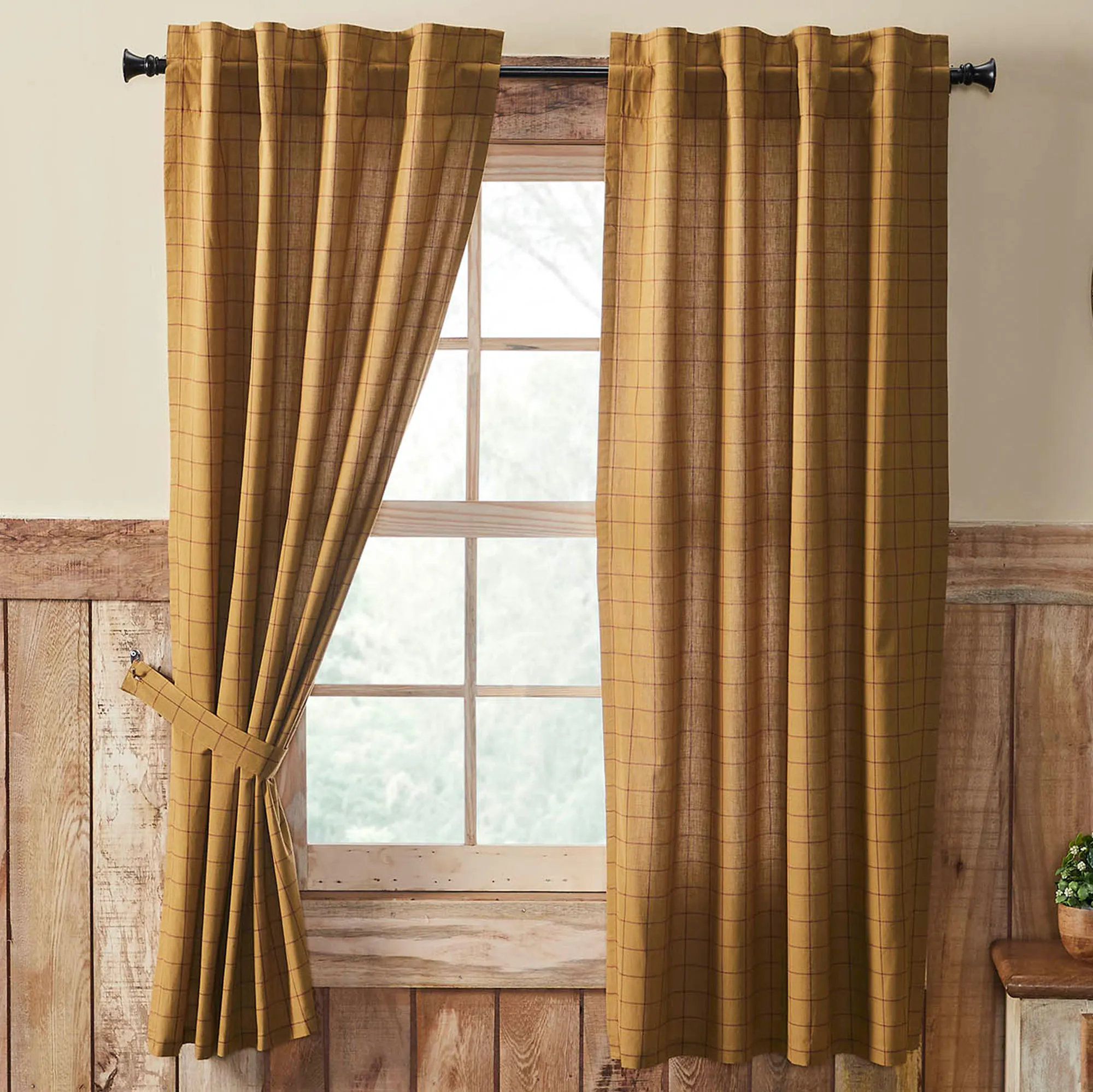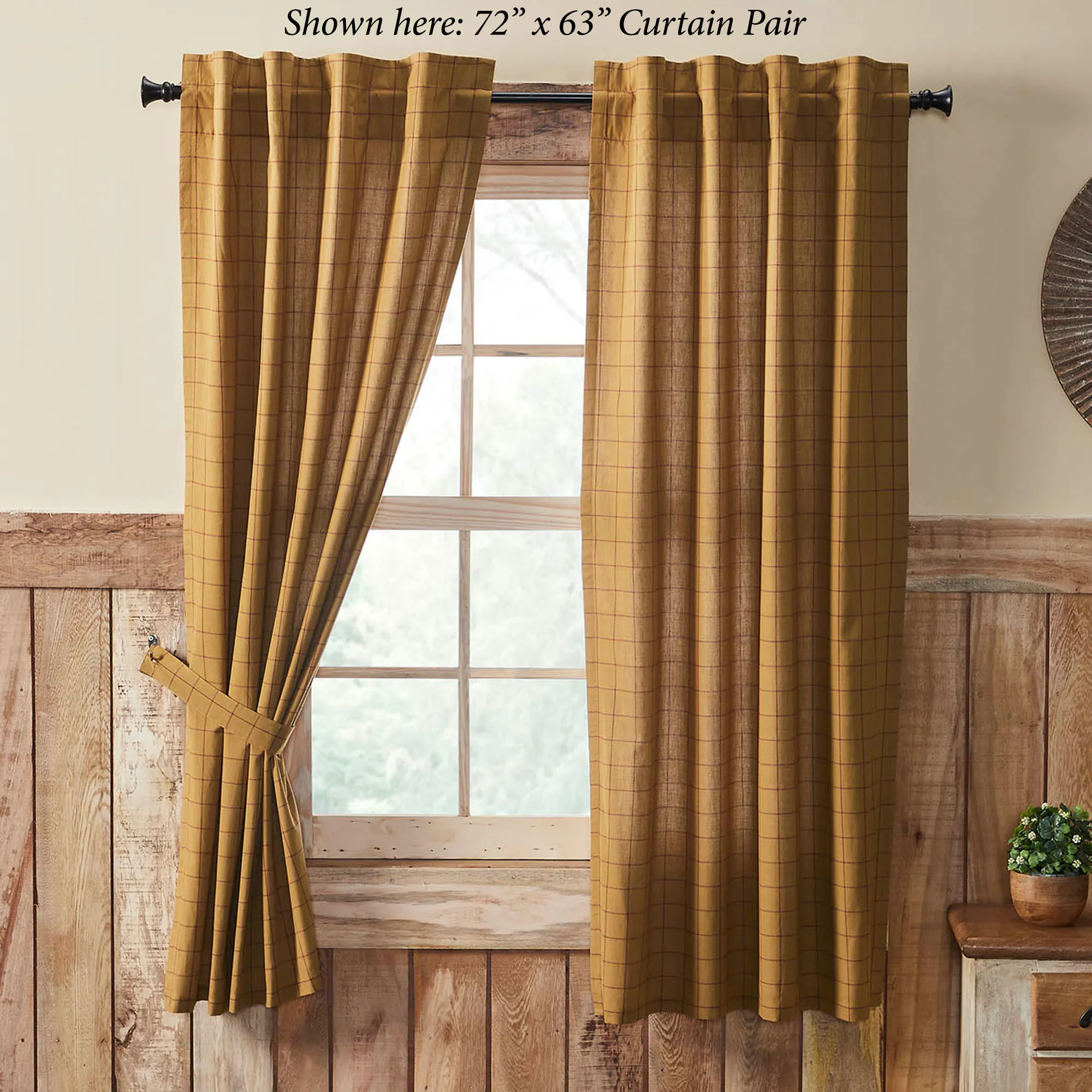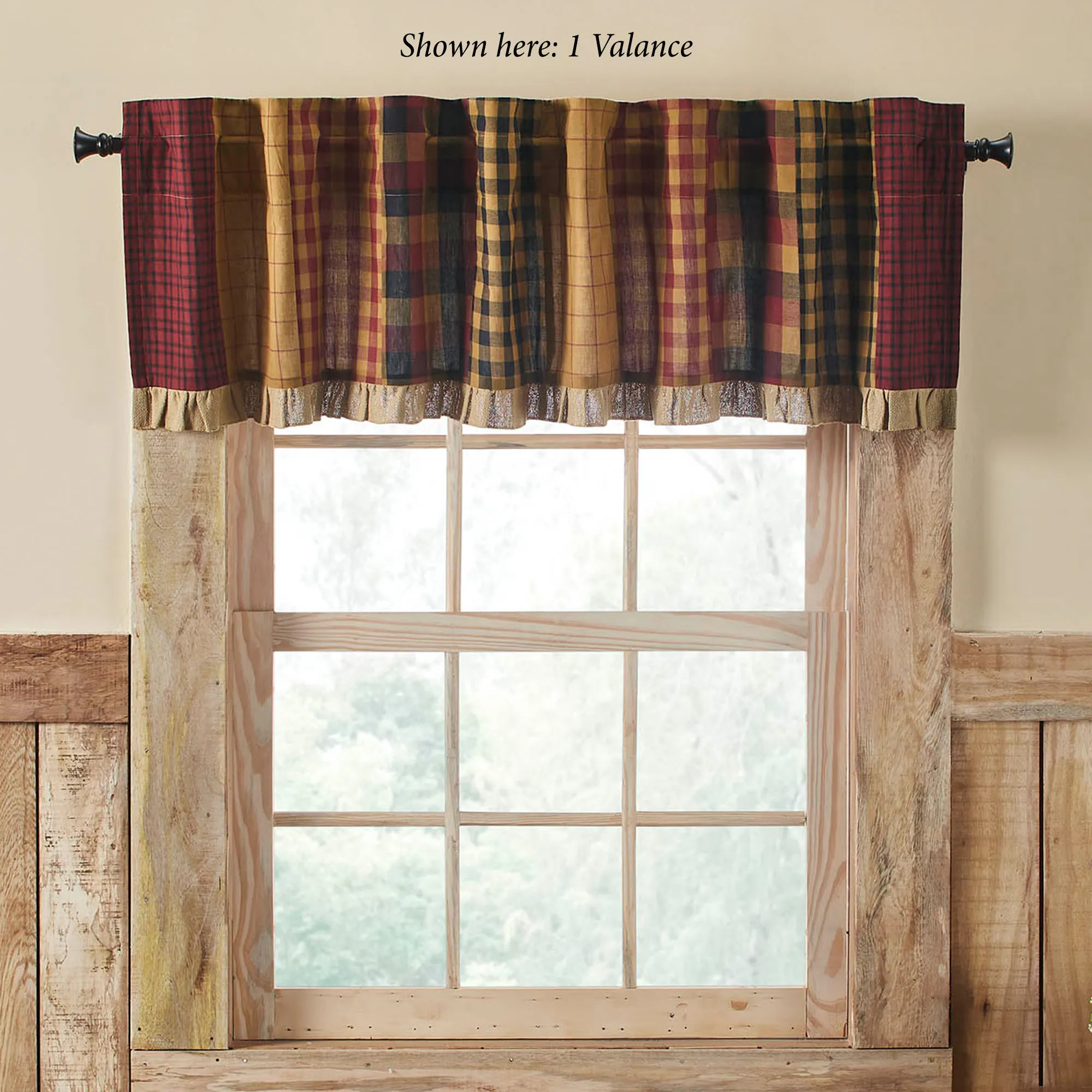 Lined Window Treatments have 3.25" rod pockets and 3.25"L back tabs for hanging. Tailored Curtain Pair has a burgundy windowpane design on gold and includes tiebacks. Curtains are available in two sizes. Valance has a patchwork pattern with plaid designs and a cotton burlap ruffle at the bottom.