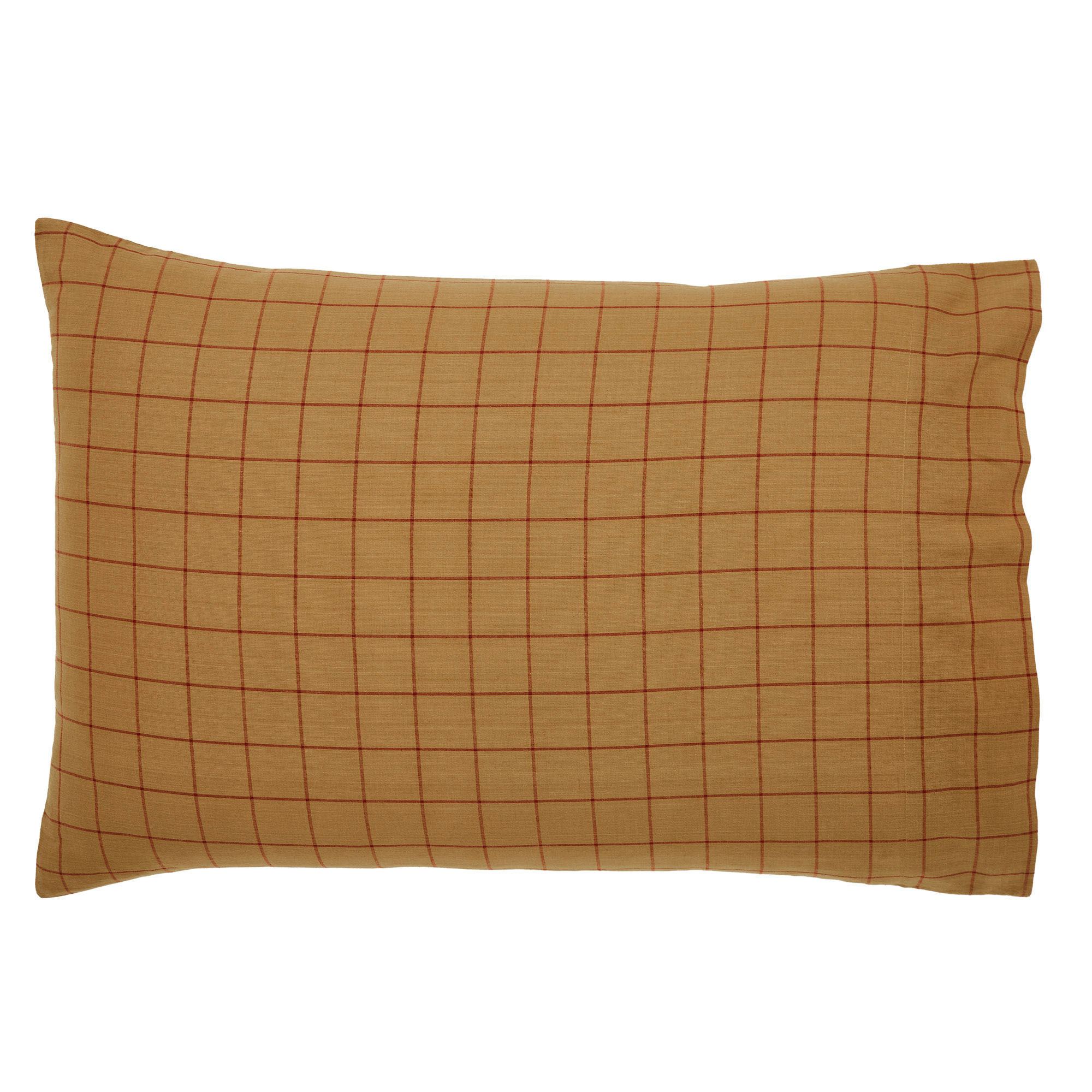Tailored Pillowcase Pair has a burgundy windowpane design on gold. Specify Standard/Queen Pair or King Pair.