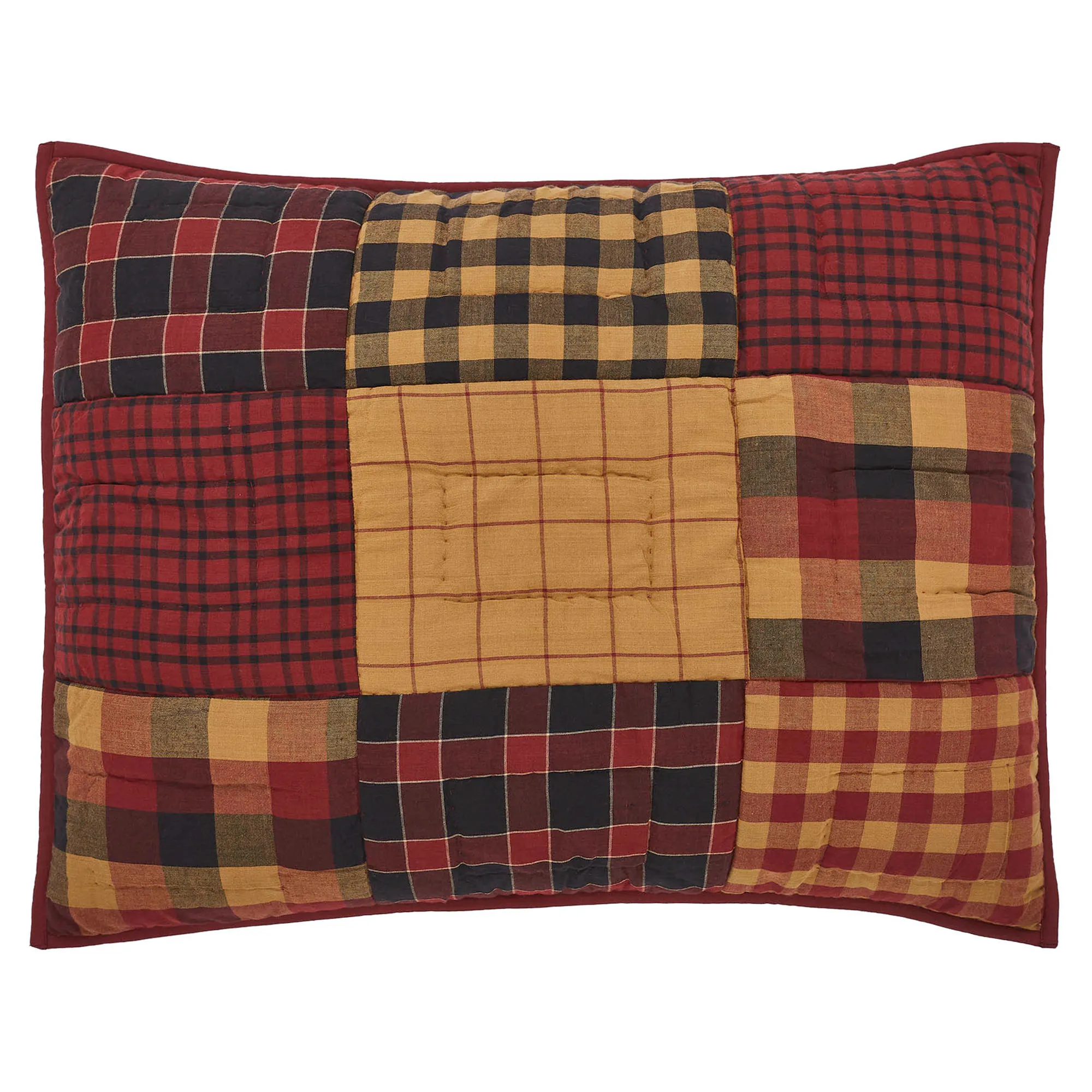 Sham has plaid designs, hand quilting, bound ends, and a French back closure. Choose Standard/Queen or King.
