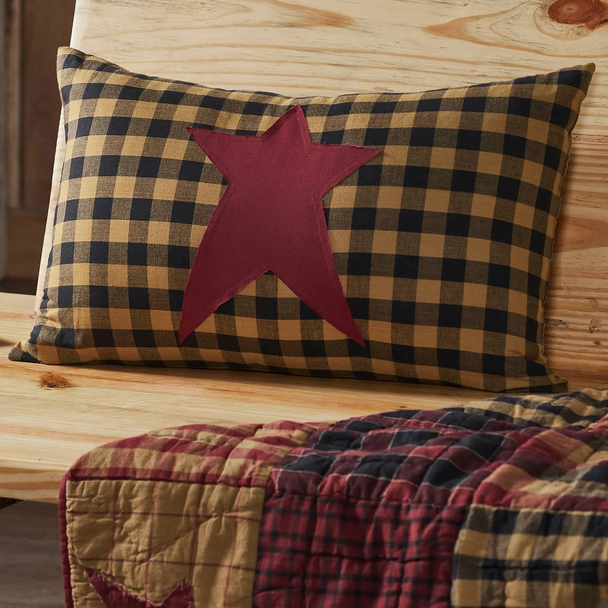 Tailored Rectangle Pillow has a burgundy star applique attached to a black and gold plaid print. Fill is polyester. Spot clean.