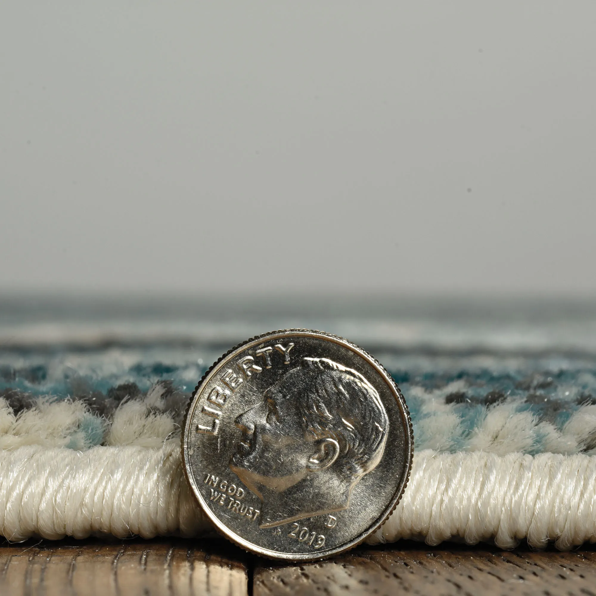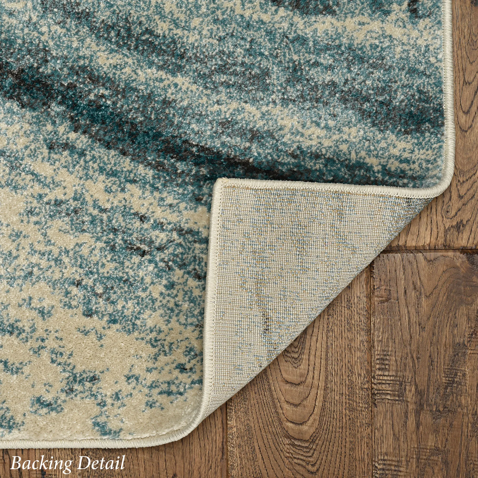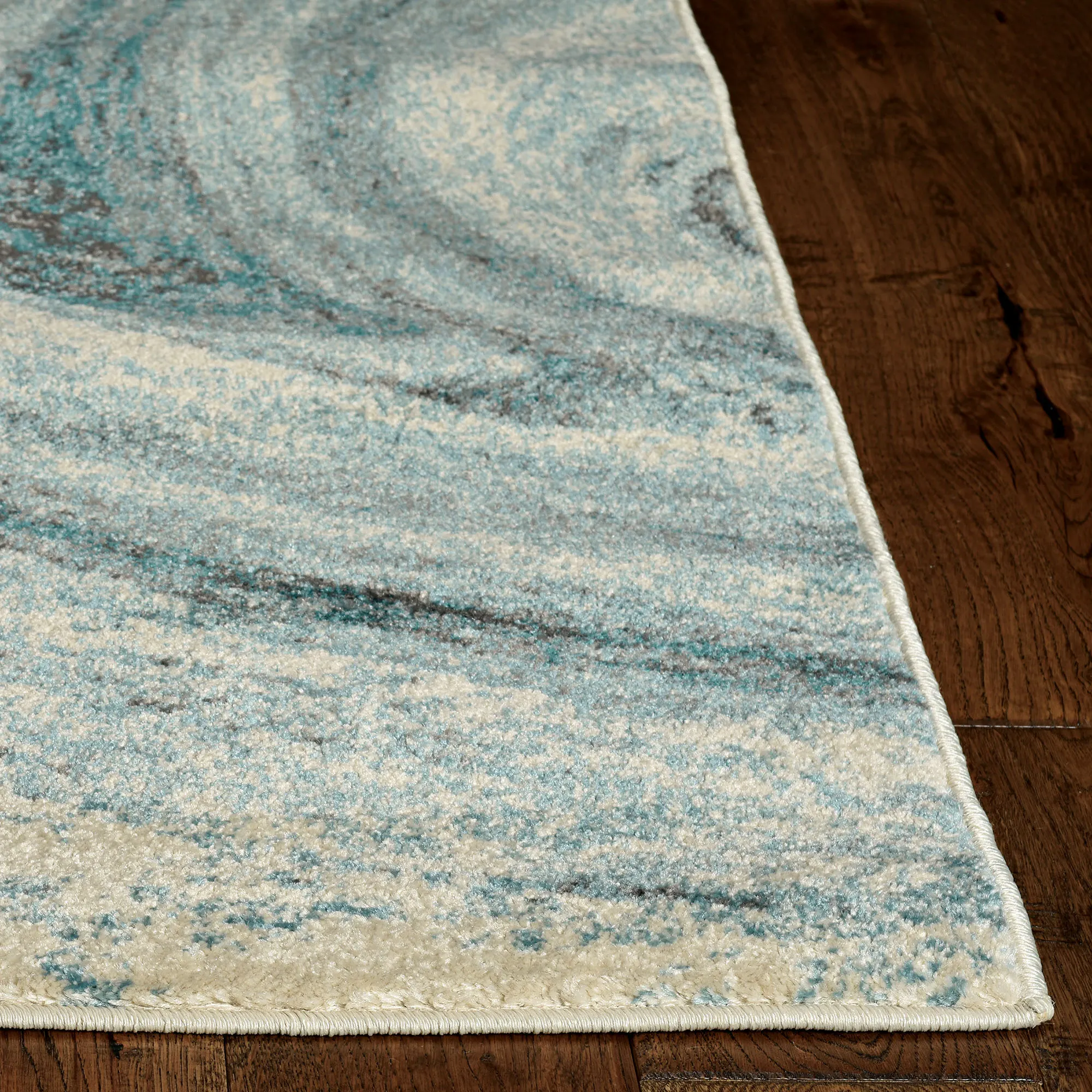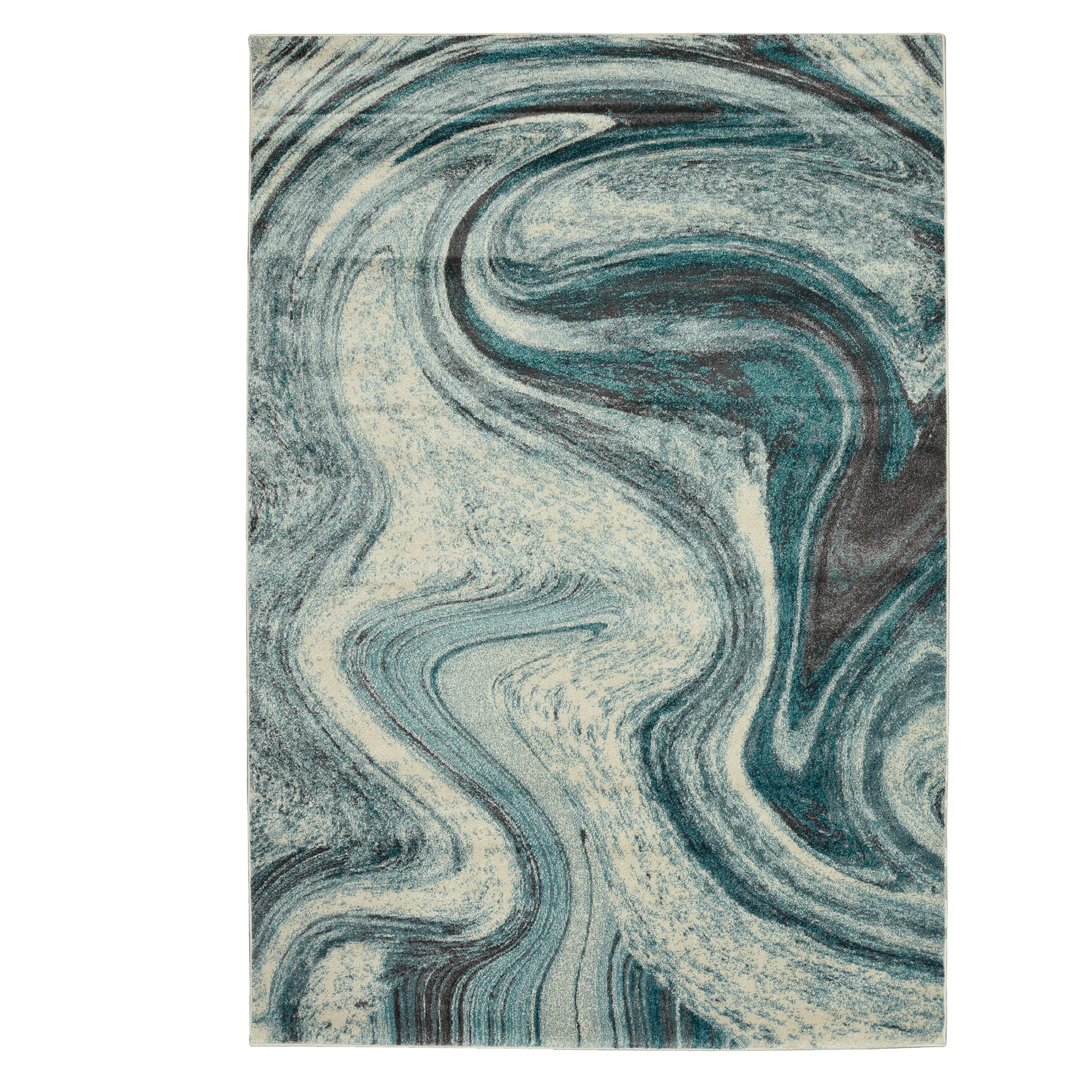 The Contempo Illusion Area Rug swirls with beautiful hues. Power-loomed from heat-set polypropylene, the .5" thick rug features teal, ivory, and charcoal hues that churn with abstract beauty. We recommend professional cleaning by a rug cleaner. Imported.