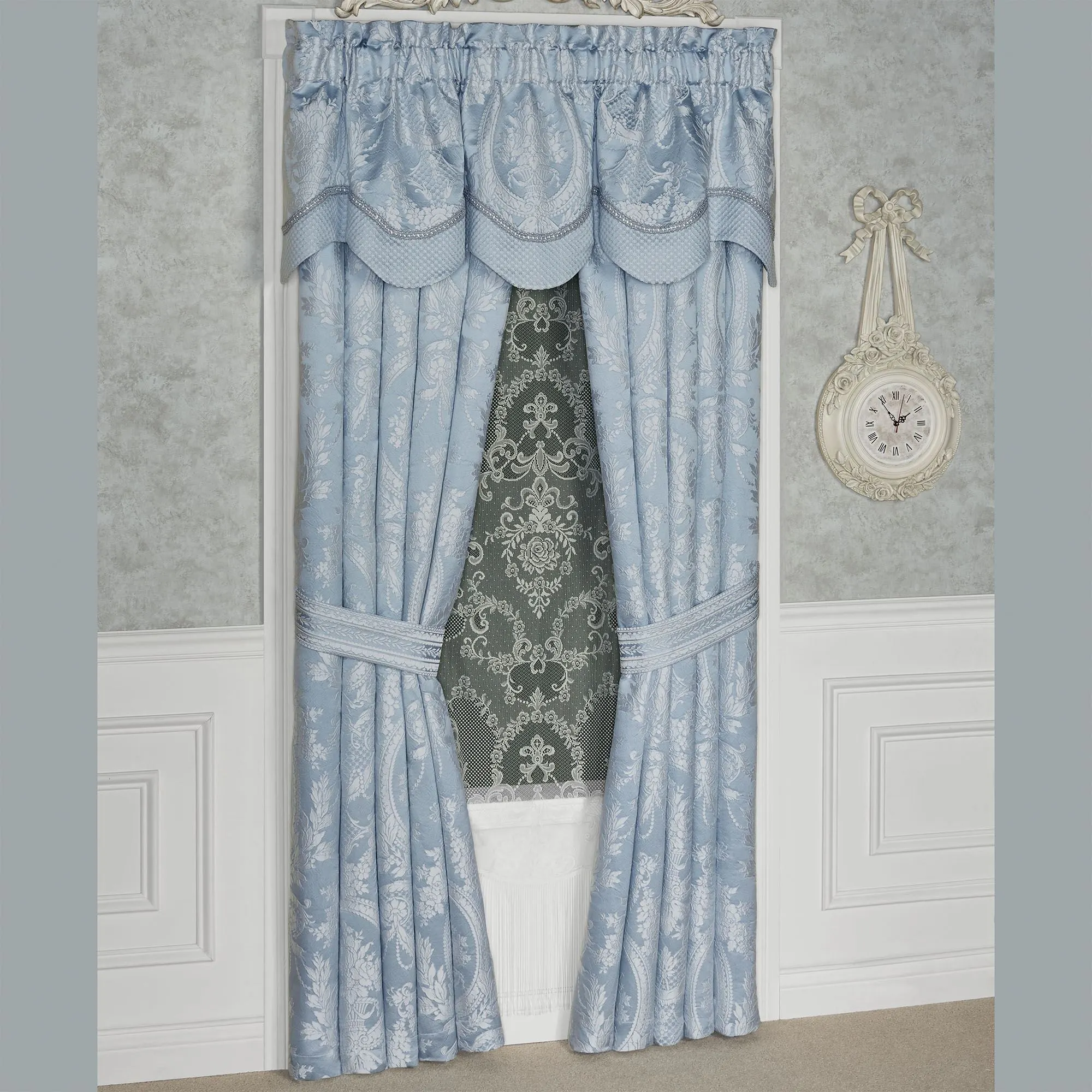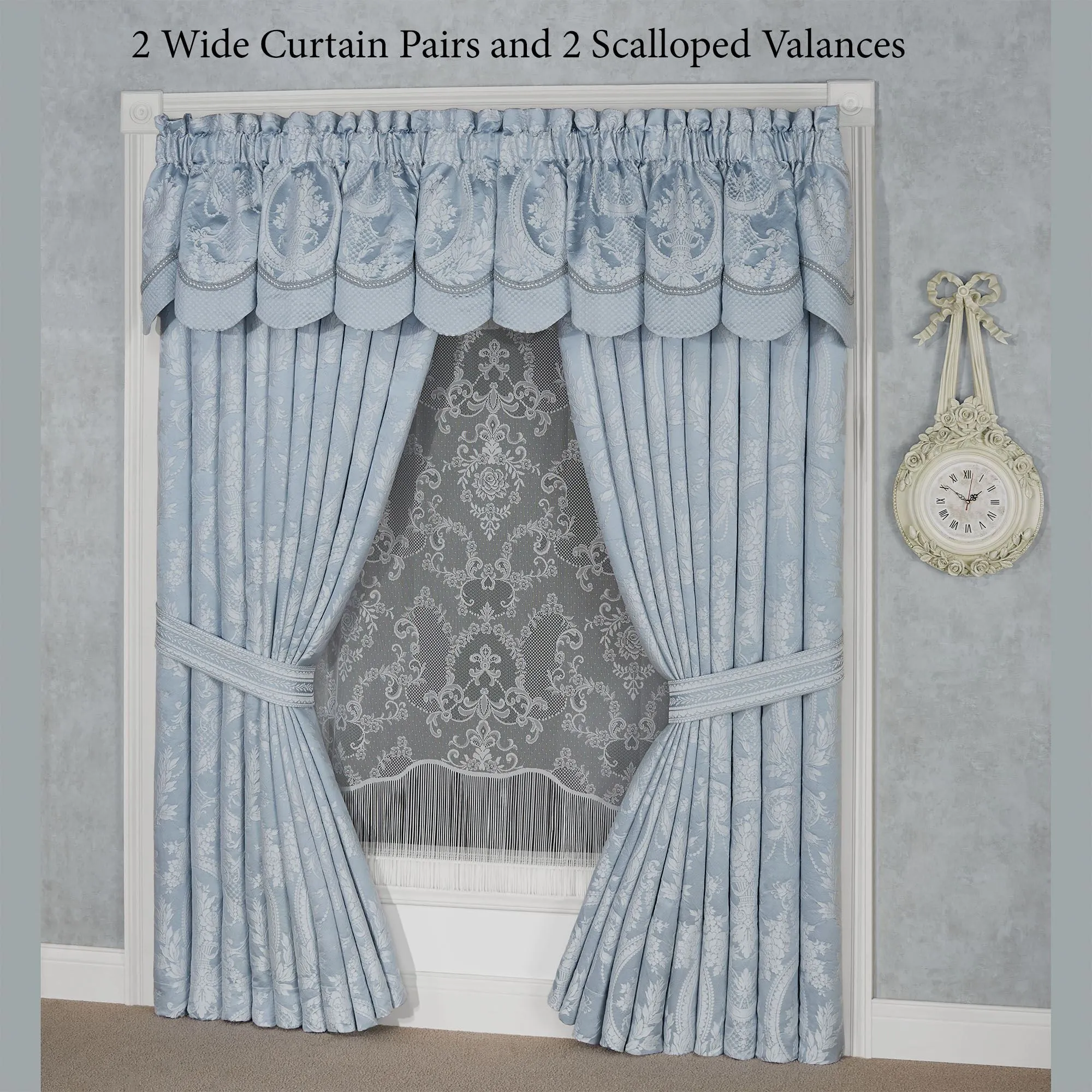 Colors of iced platinum and powder blue give the Contessa Window Treatment an undeniably cool grace. The puff jacquard-woven polyester window treatment features lovely blossoming floral bouquets and swags fit for grand classic tastes. Specify Scalloped Valance or Wide Curtain Pair. Scalloped Valance is pieced with gimp trim and a star bottom. The lined Wide Curtain Pair has tailored edges. Tiebacks are included. Window treatment hangs via 3" rod pockets. Dry clean only. Imported. The curtain pair width is the total width of two panels together.