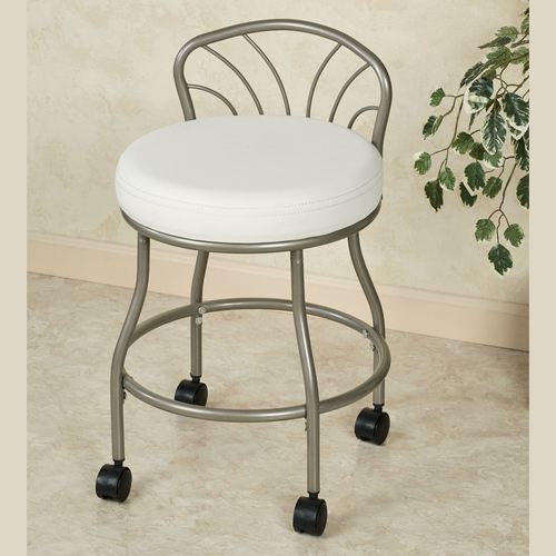 Any bath area or dressing room will benefit from the sleek style of the Nickel Contour Back Upholstered Vanity Chair. This metal chair has a nickel finish with a protective powder coat, a textured vinyl cushioned seat in eggshell white, and a low back with an open fan shape. Four black casters swivel 360 degrees for easy mobility. Seat-to-floor height is 20". Weight limit is 250 lbs. Overall, the vanity chair measures 16"dia.x27"H; weighs 11 lbs. Spot clean the cushion.