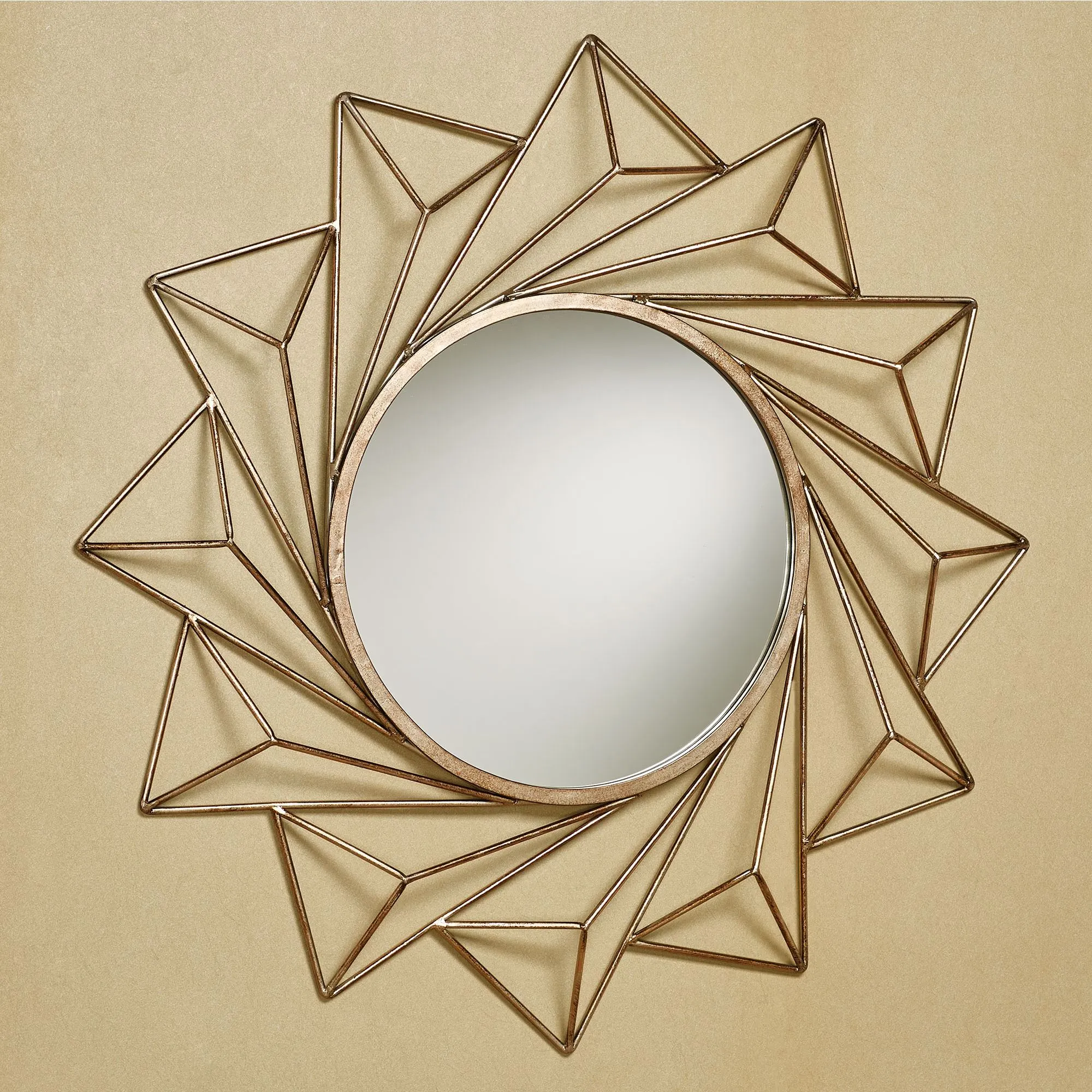 Dimensional metal triangle shapes merge together in Convergence around the central glass mirror. This modern-style openwork wall mirror has a rose gold finish. Measures 32"dia.x2.5"D.