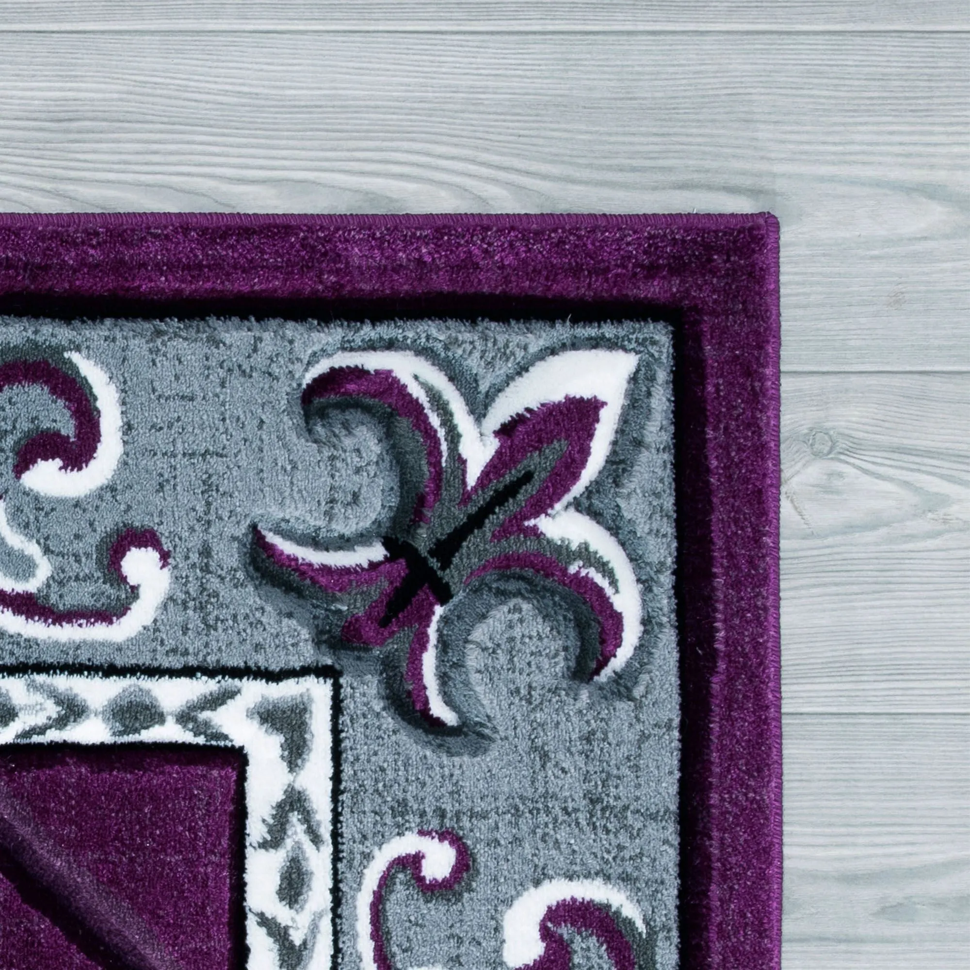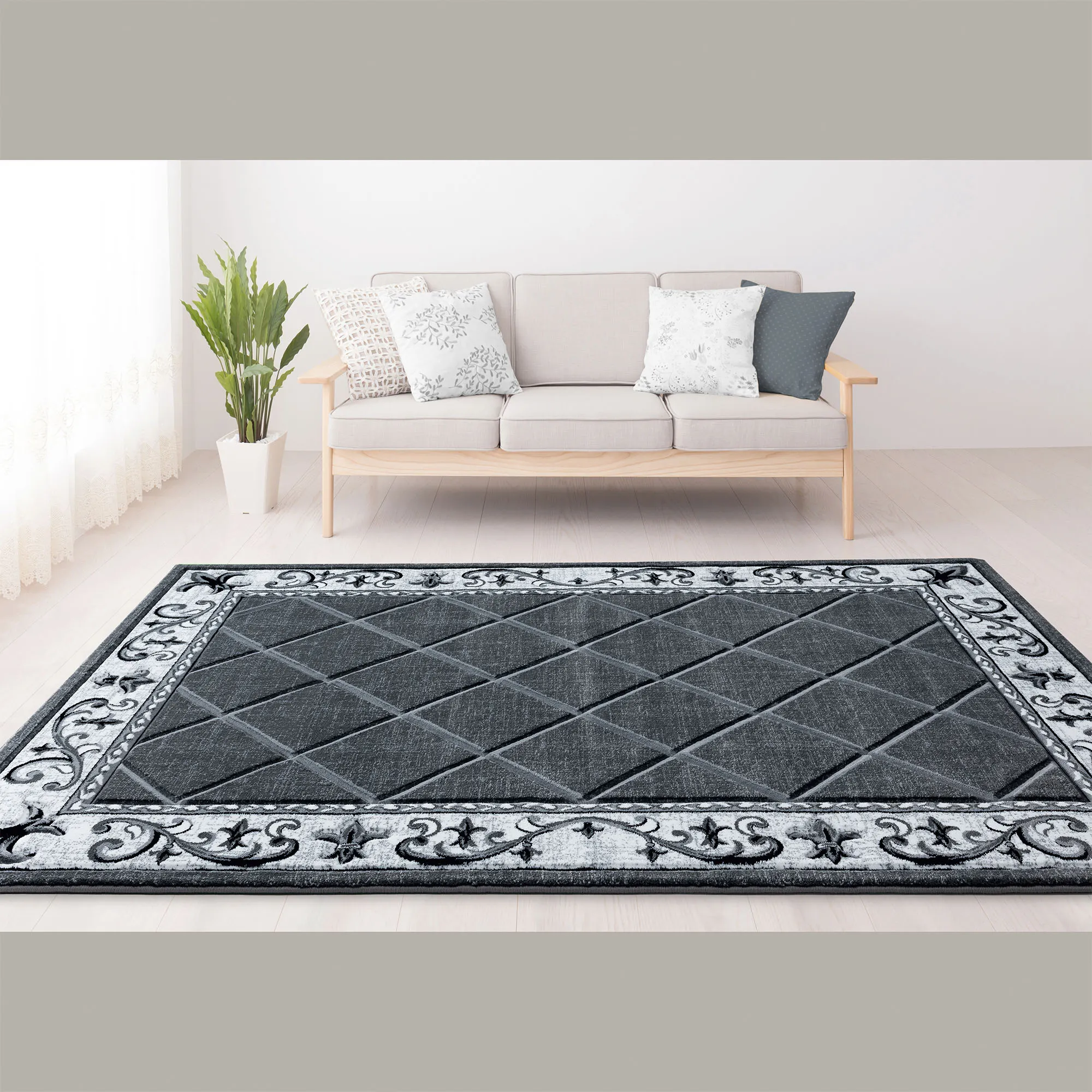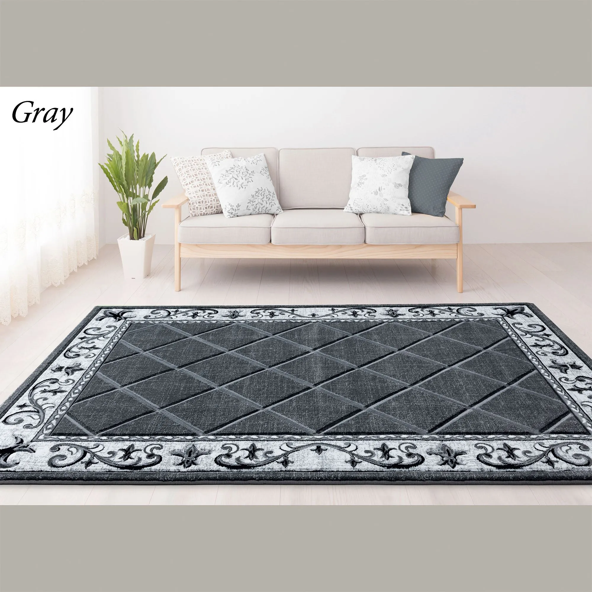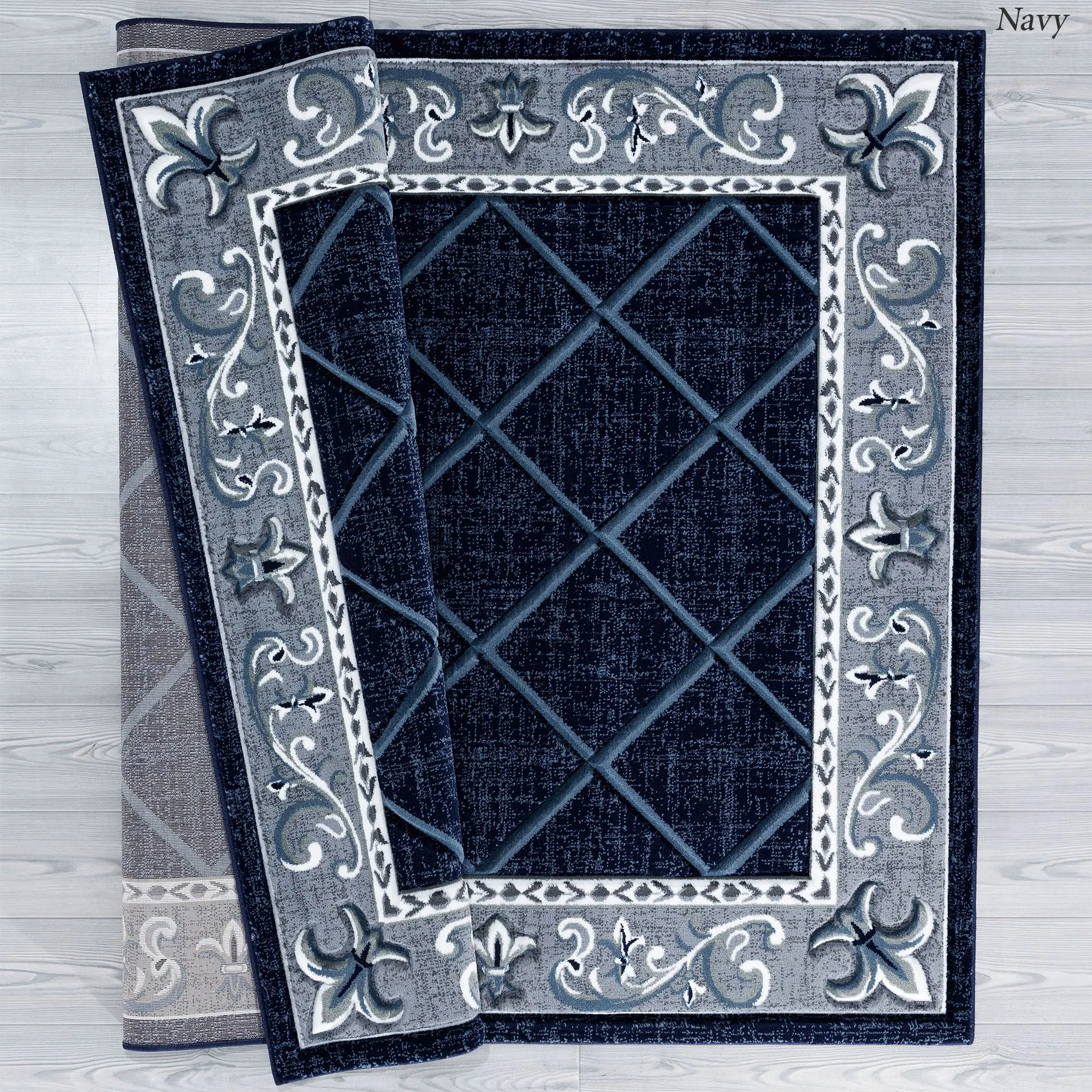 The Coopland Area Rug defines your floor with classic splendor. Power-loomed from polypropylene, the .75" thick rug features a solid color, handcarved diamond latticework field surrounded by an elegant gray scrollwork and fleur-de-lis frame. We recommend professional cleaning by a rug cleaner. Imported.