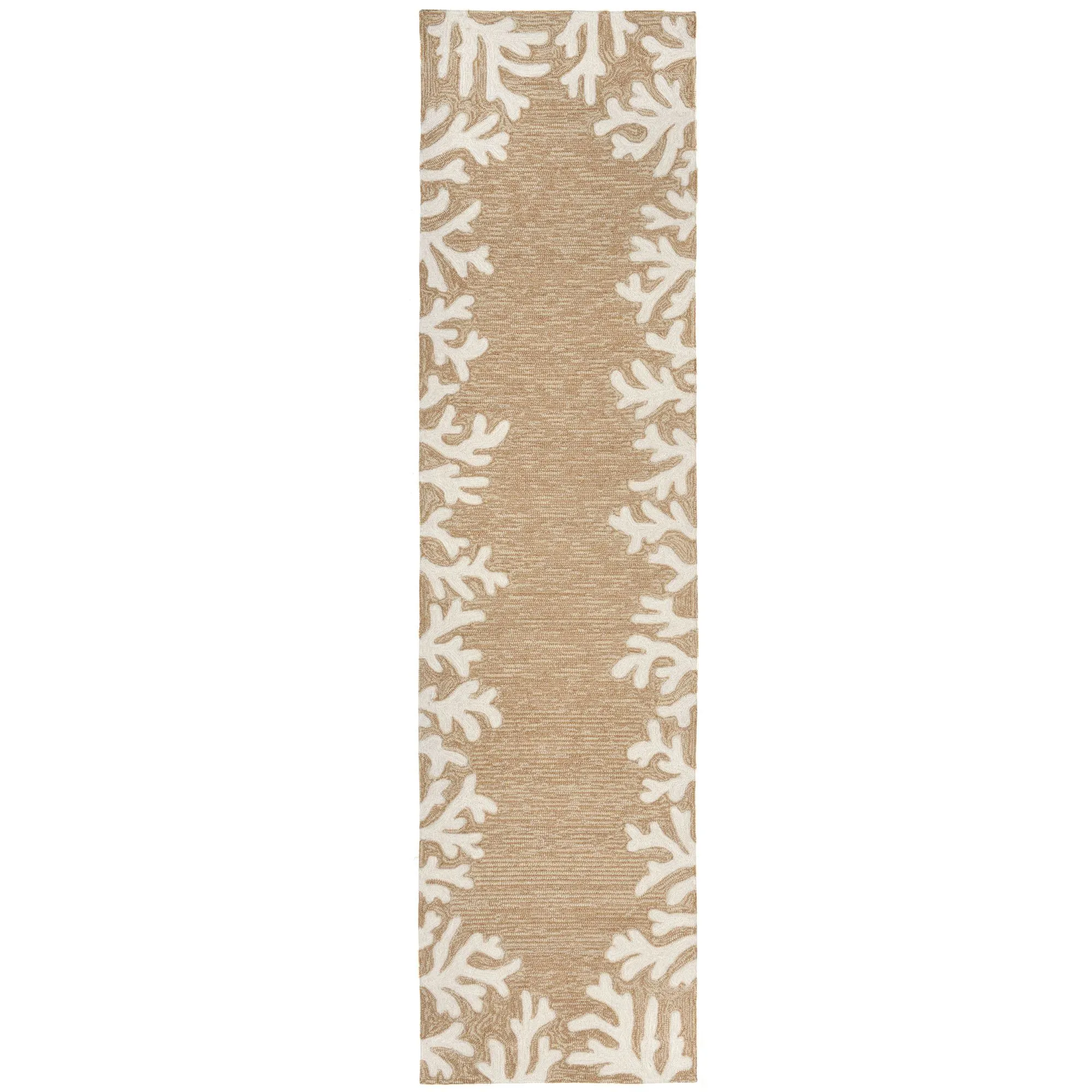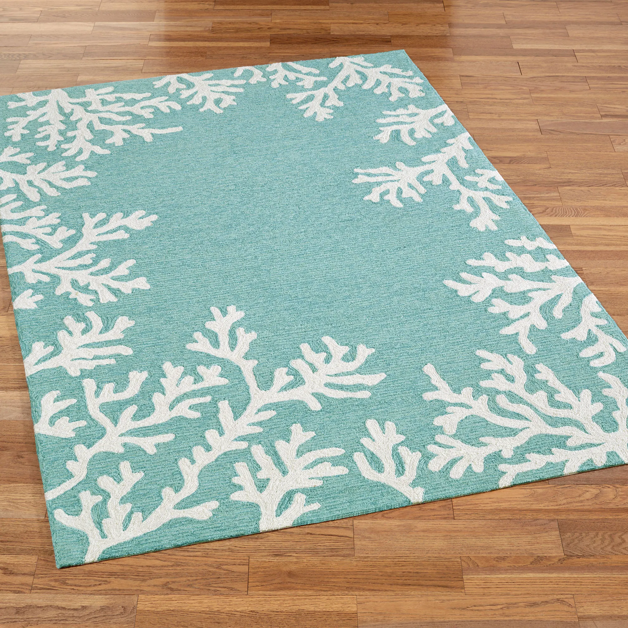 Framed with a Coral Reef Border, these aquatic-style area rugs feature treasures from the ocean's floor. Hand-tufted of polyester/acrylic, these indoor/outdoor Everywear(TM) rugs, .625" thick, are UV-stabilized and have an ivory design. Spot clean and rinse with a garden hose; for stubborn stains, we recommend professional cleaning by a rug cleaner. Do not expose these rugs to freezing temperatures. Imported.
