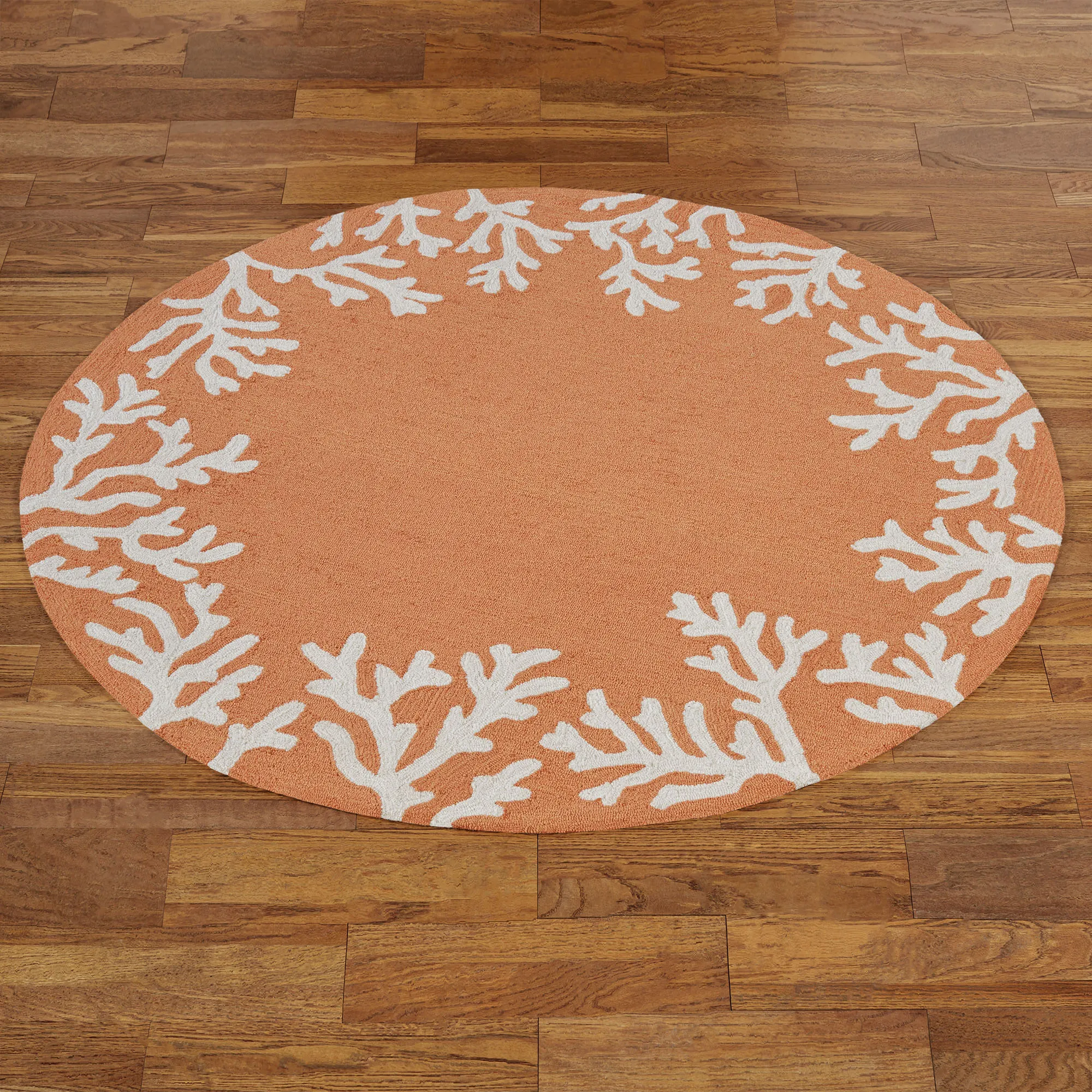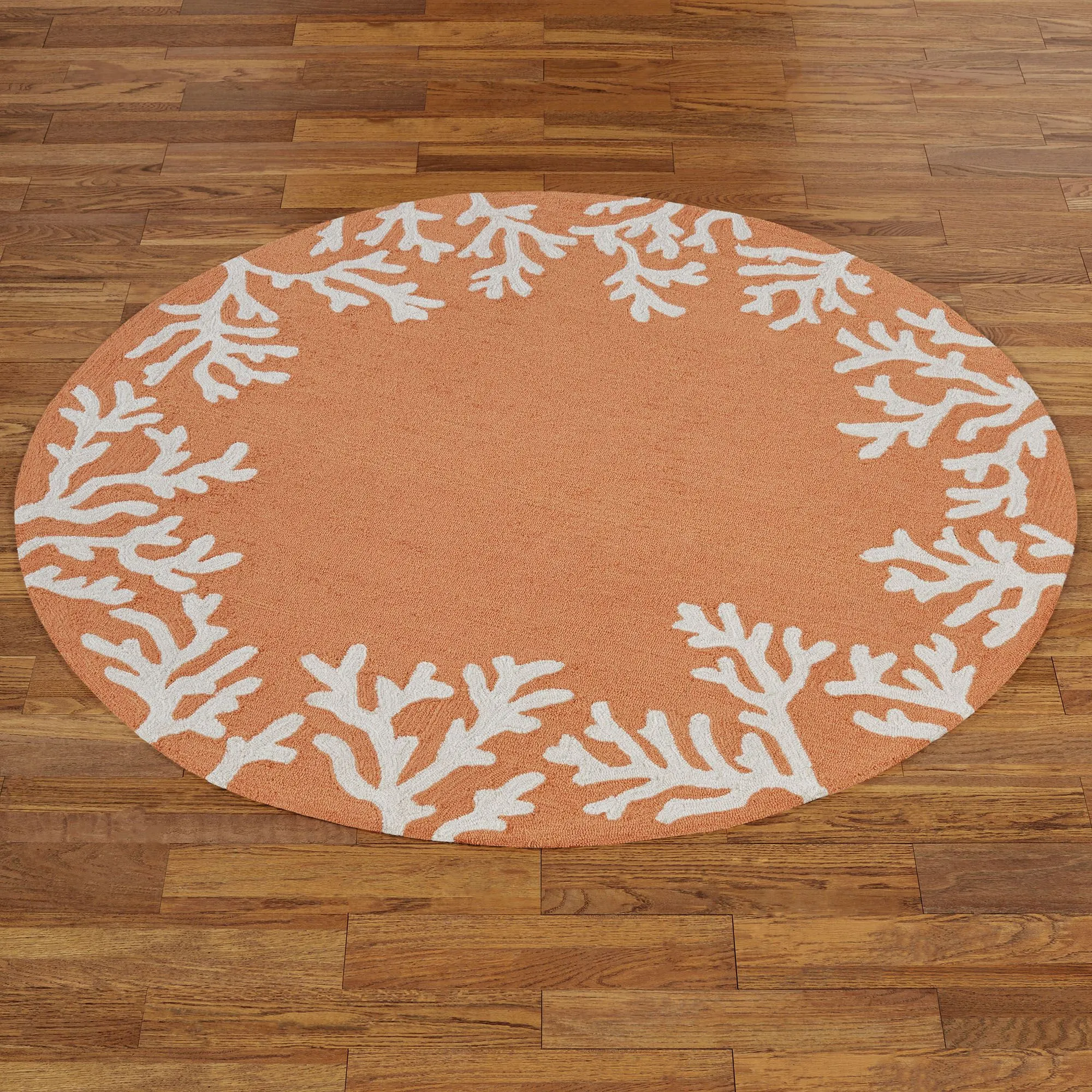 The Coral Border Round Rugs are polyester/acrylic. Imported.