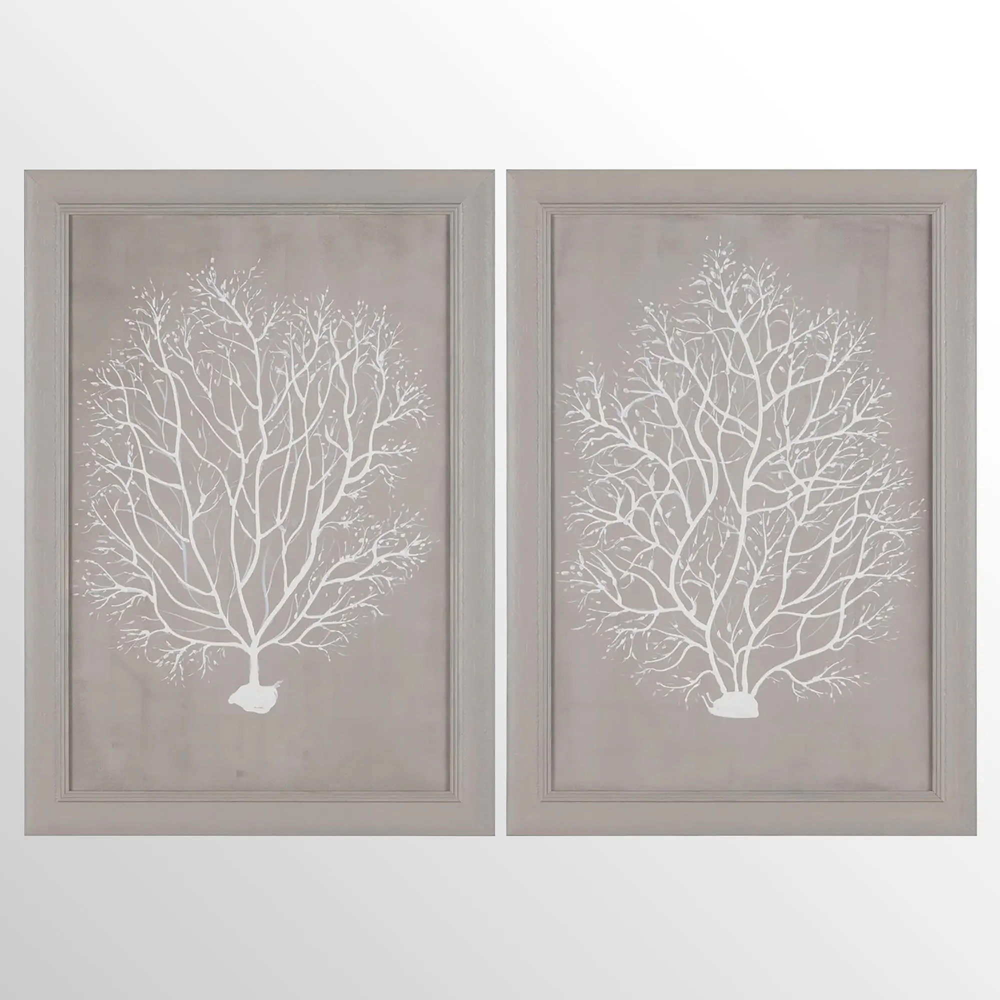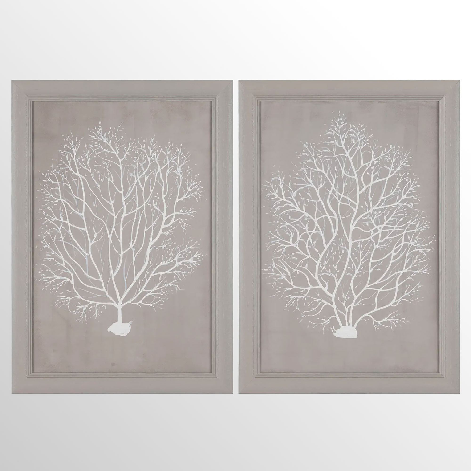 Capture the natural beauty of this amazing sea treasure with the Coral Cove Framed Wall Art. This handpainted wall art set features flowing, white coral trees on a beige canvas background. The textured wood frame has a beige finish. Each measures 24"Wx1.5"Dx34"H. Set weighs 11 lbs.