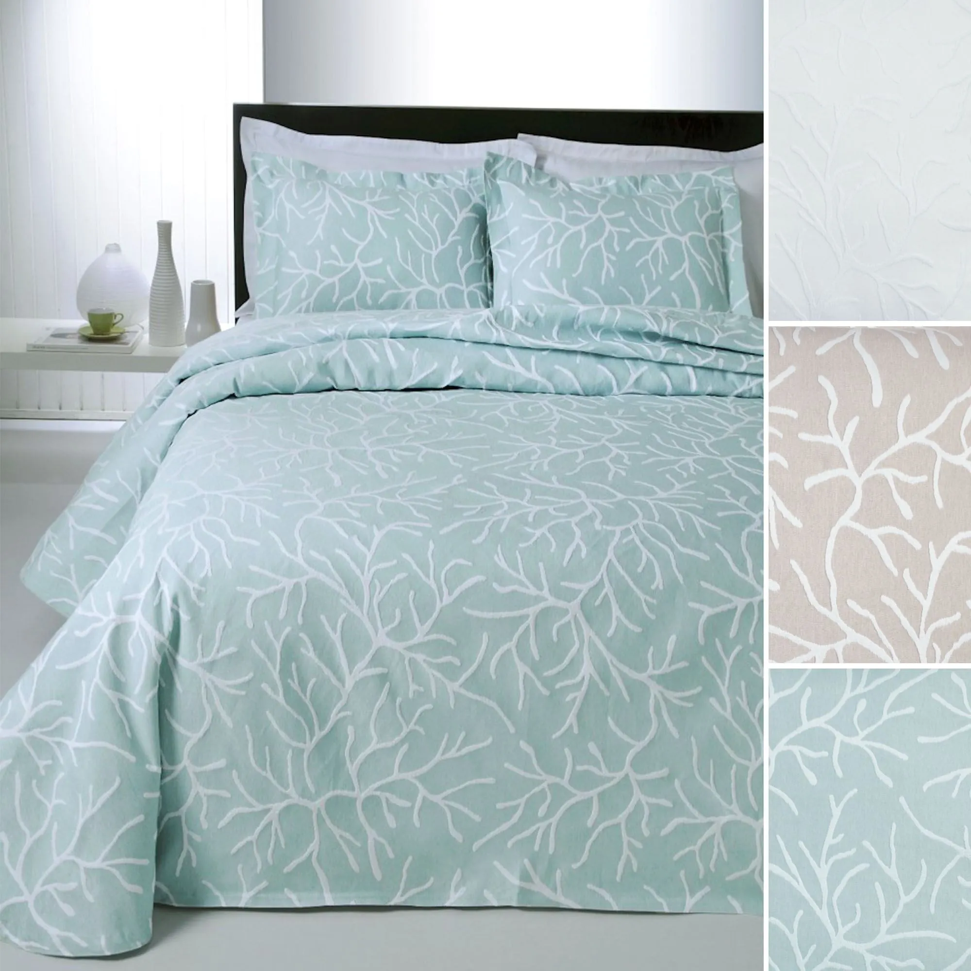 The Coral Delight Woven Matelasse Coverlet from Belle Epoque(TM) exudes an undersea simplicity. The oversized, cotton/polyester blend coverlet features white woven matelasse coral branches that fan across a solid color ground. Coverlet has mini-flange edges. Machine washable. Imported.