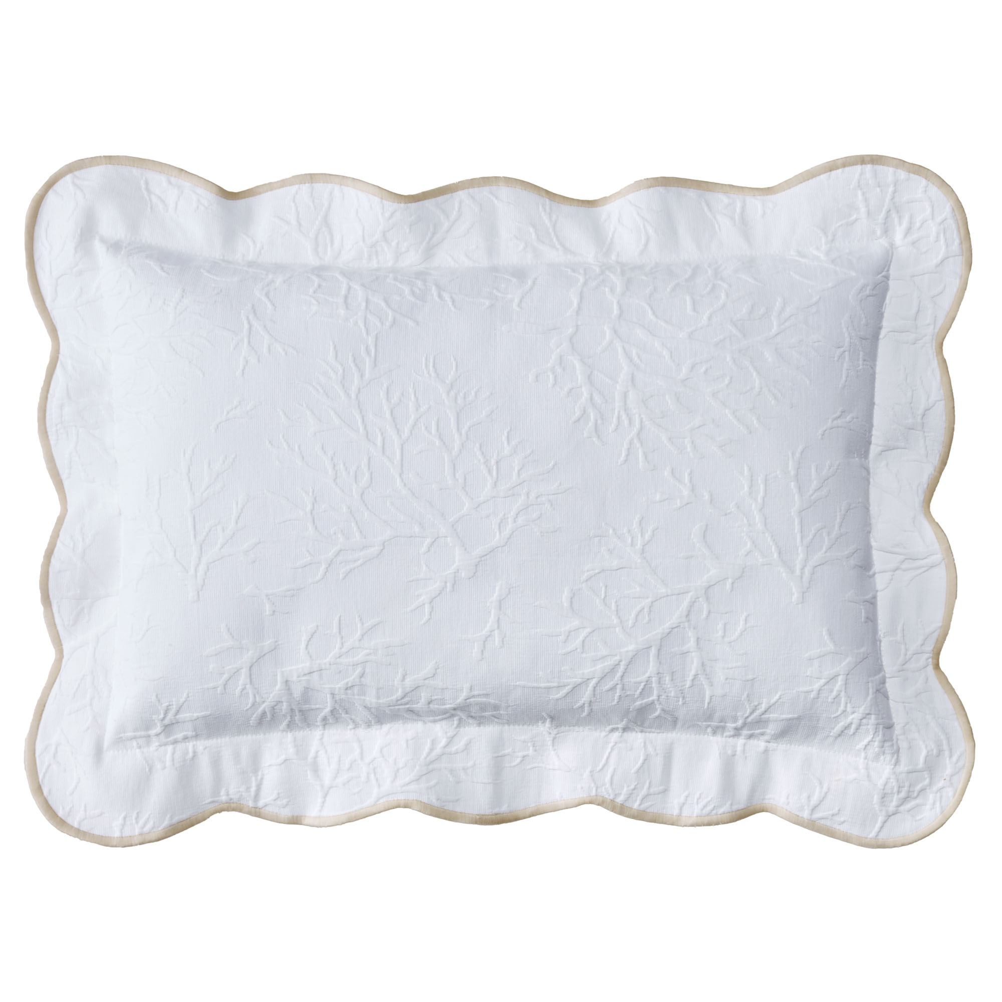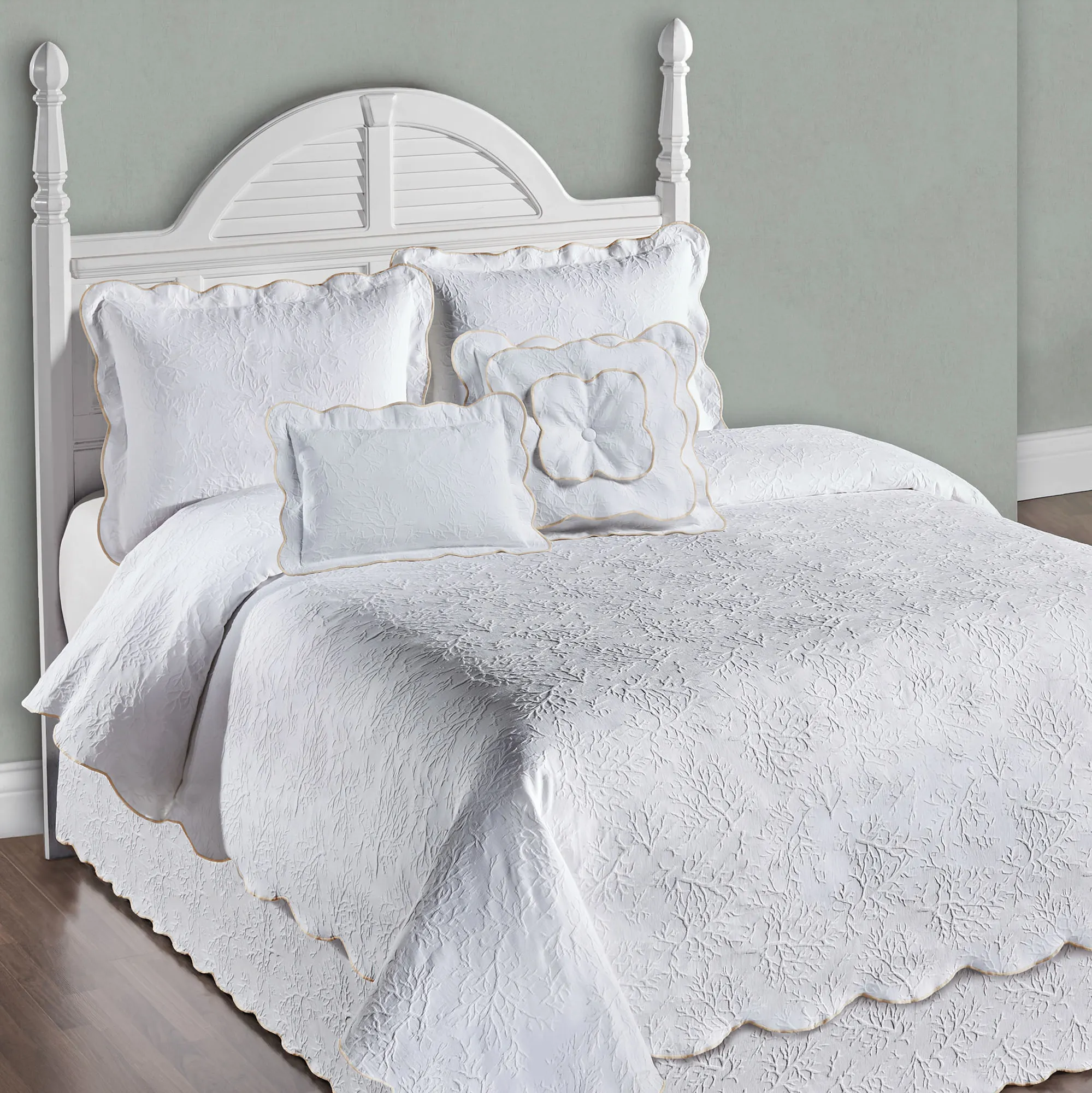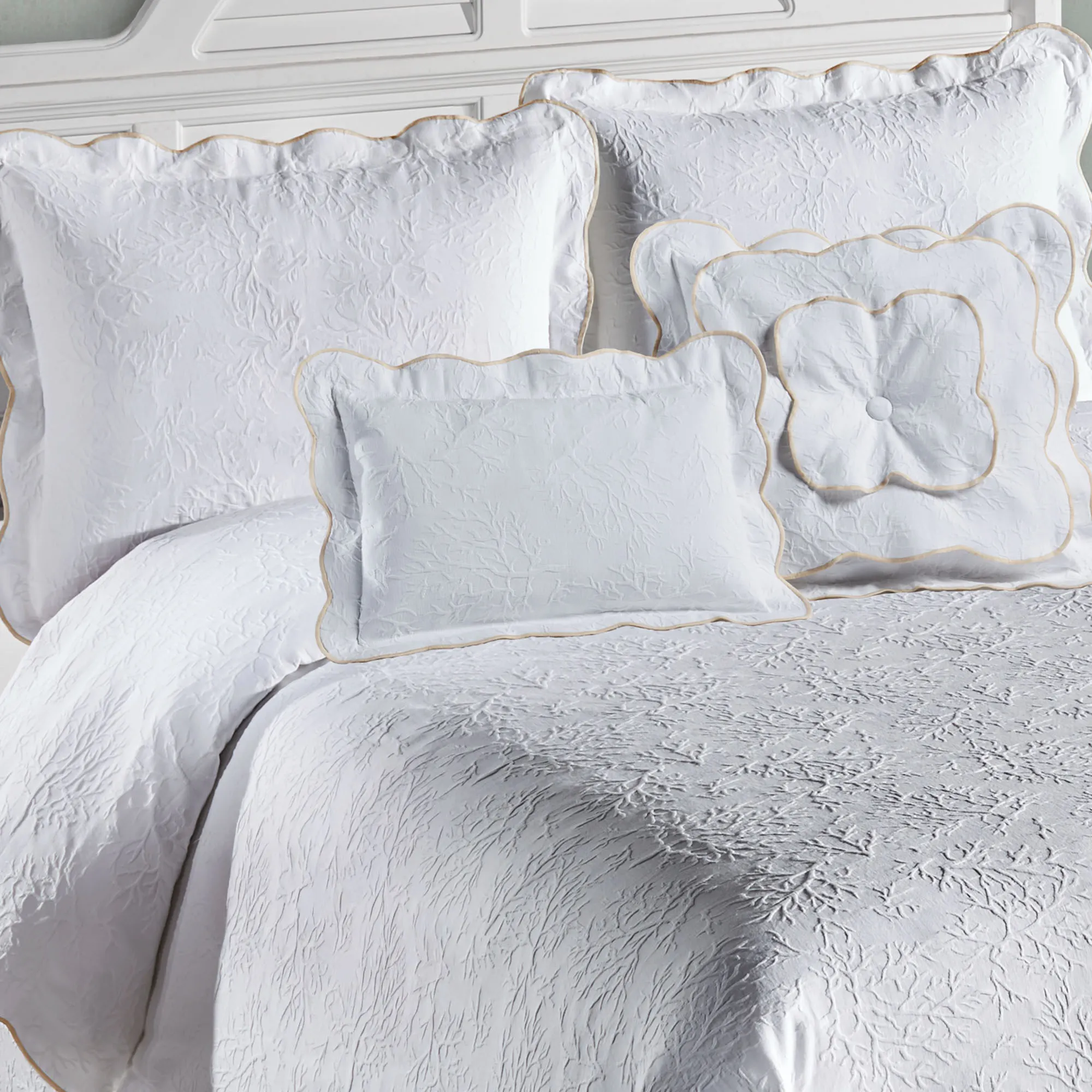 The Coral Matelasse Bedding displays an enchanting wonder of the sea. This cotton/polyester bedding features intricate coral designs on a white, woven matelasse background, along with scalloped motifs with sand stitching.