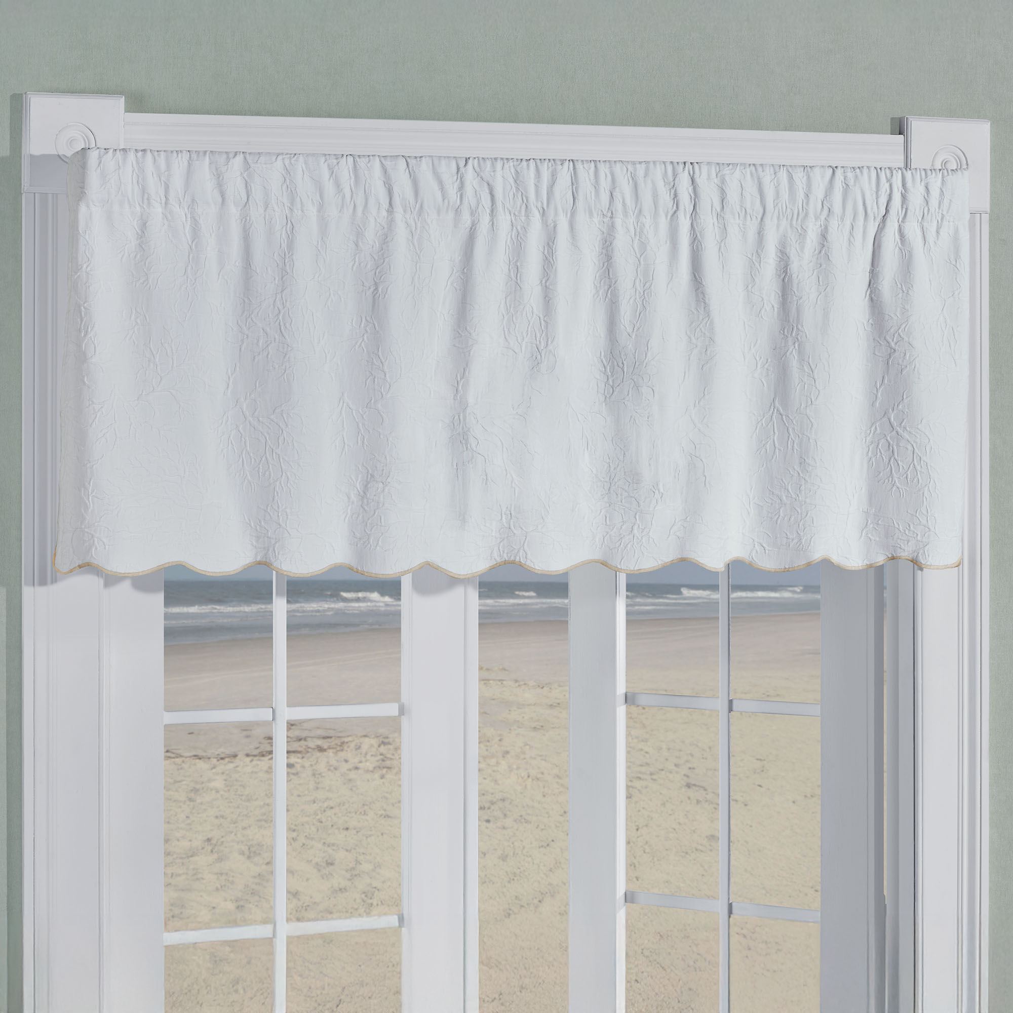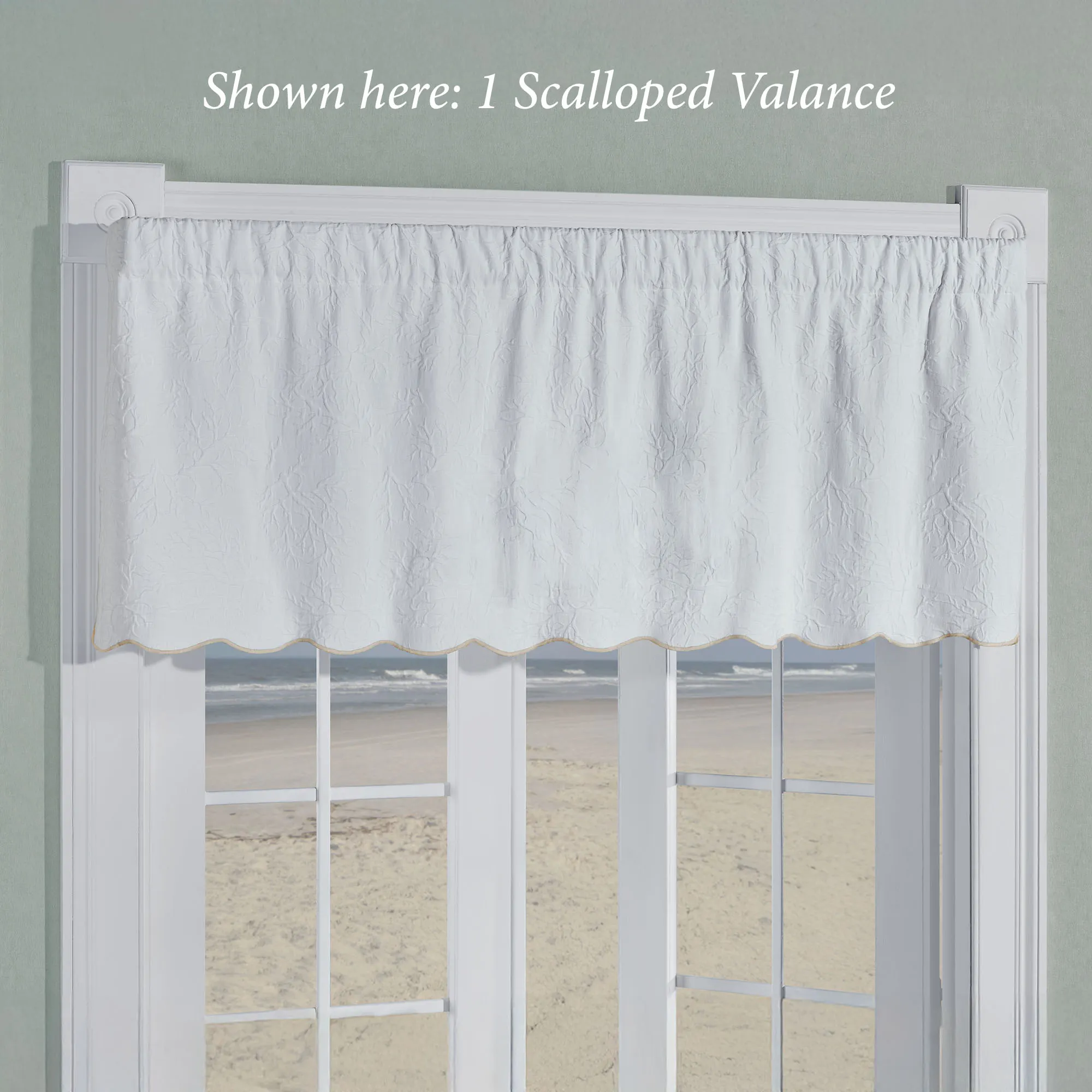 The Scalloped Valance has coral designs on a white, woven matelasse background and scalloped edges with sand stitching. Rod pocket is 3".