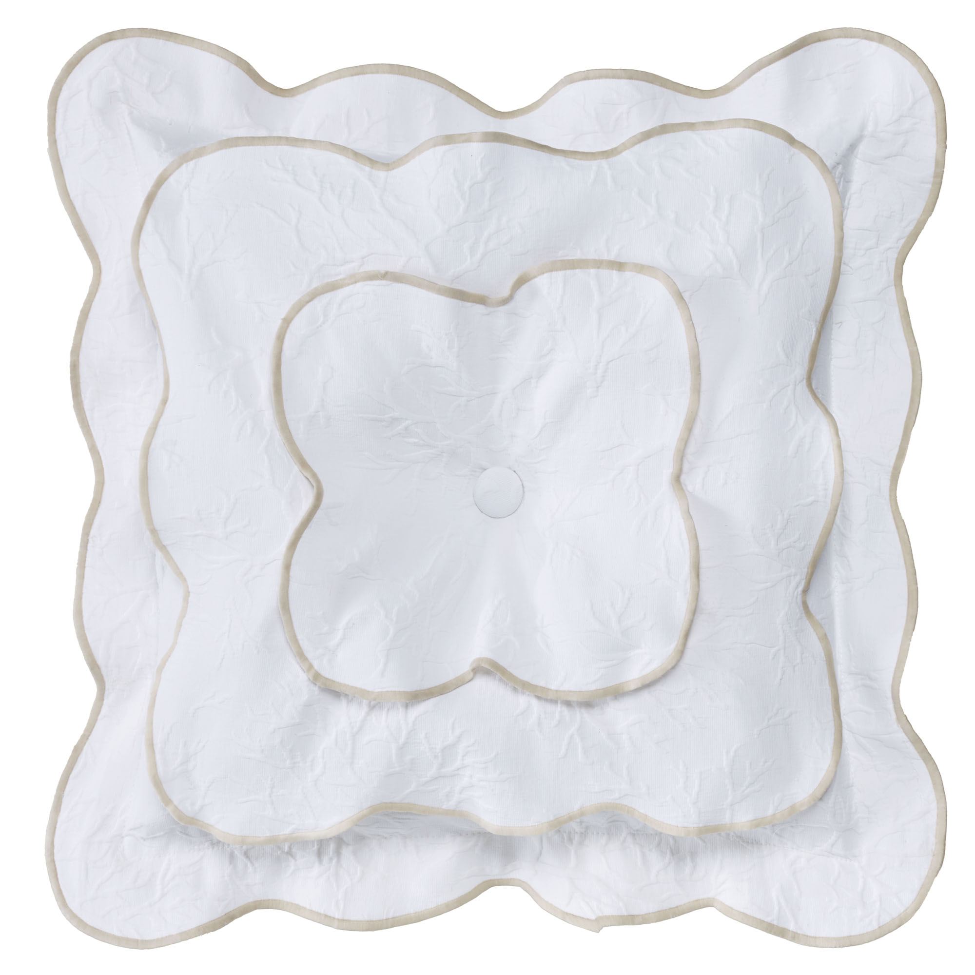 The white, woven matelasse Pillows have coral designs, sand stitching on the scalloped edges, and polyester fill. Spot clean. Choose Square or Rectangle. Square has layers and a central button tuft.