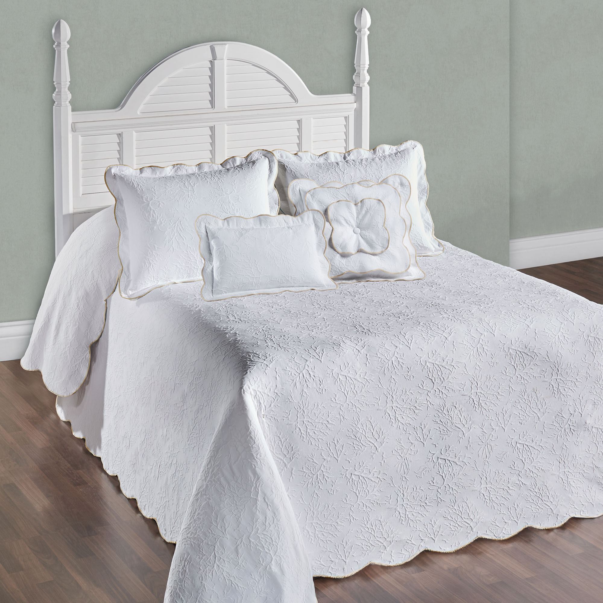 The Bedspread Set includes a grande bedspread and two shams. Bedspread has coral designs on white matelasse, a 24" drop, a reverse pillow tuck to cover pillows neatly, and scalloped ends with sand stitching. The coordinating shams have a scalloped flange with sand stitching and French back closures. For bedspread set, choose Grande Queen, Grande King, or Grande Cal King.