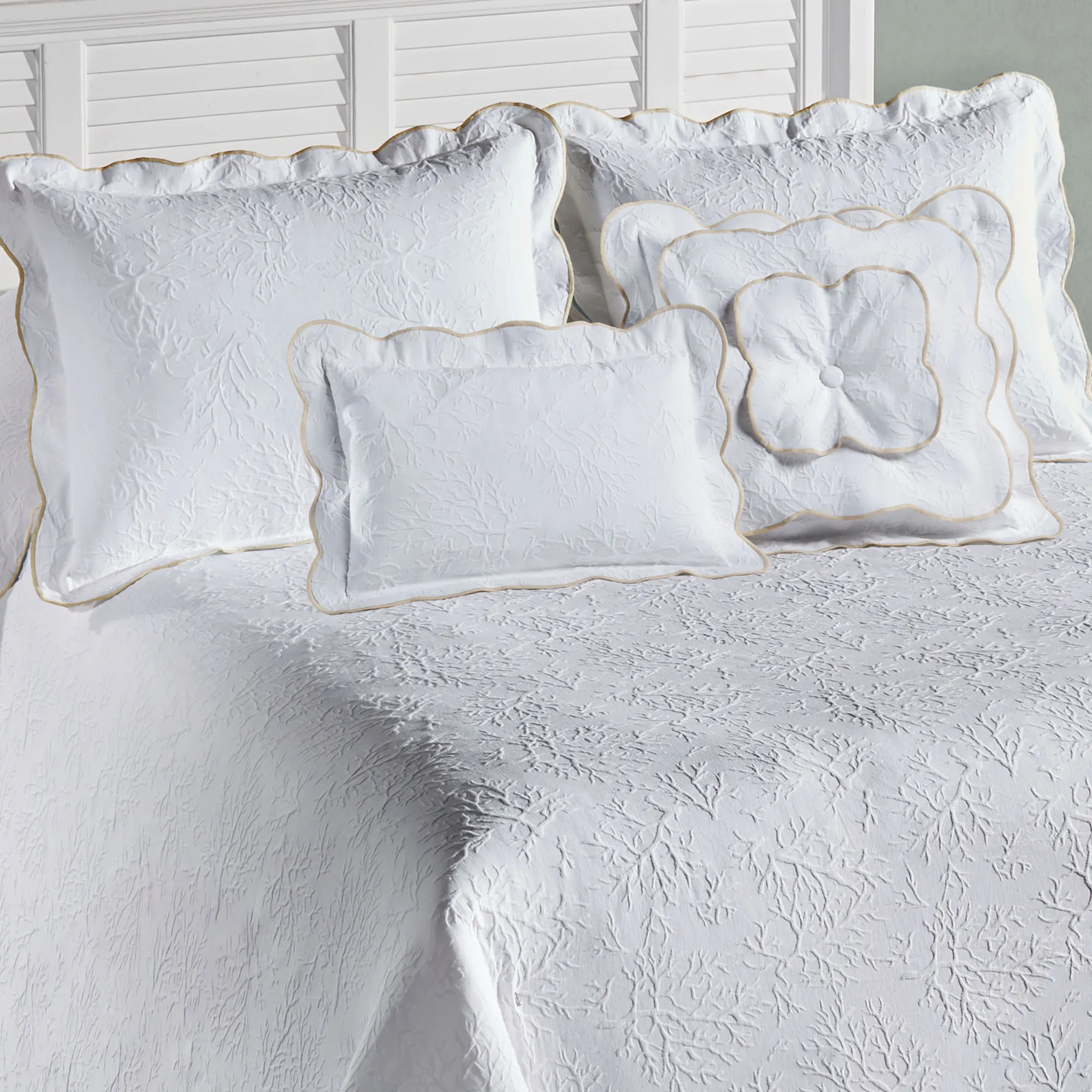 The Coral Matelasse Bedding displays an enchanting wonder of the sea. This cotton/polyester bedding features intricate coral designs on a white, woven matelasse background, along with scalloped motifs with sand stitching.