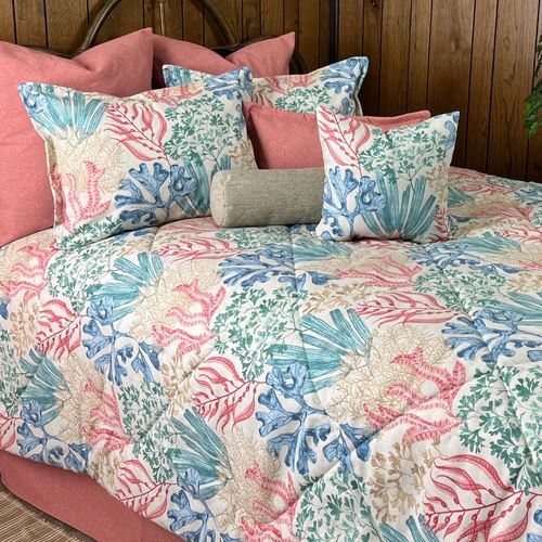 Embrace the vibrancy of the Coral Reef with this classically coastal bedding. Proudly made in the USA, the cotton ensemble features printed pink, green, aqua, blue, and tan coral and seaweed designs across a woven ivory ground. Solid elements in a striking coral hue mingled with ivory and tan complete the design.